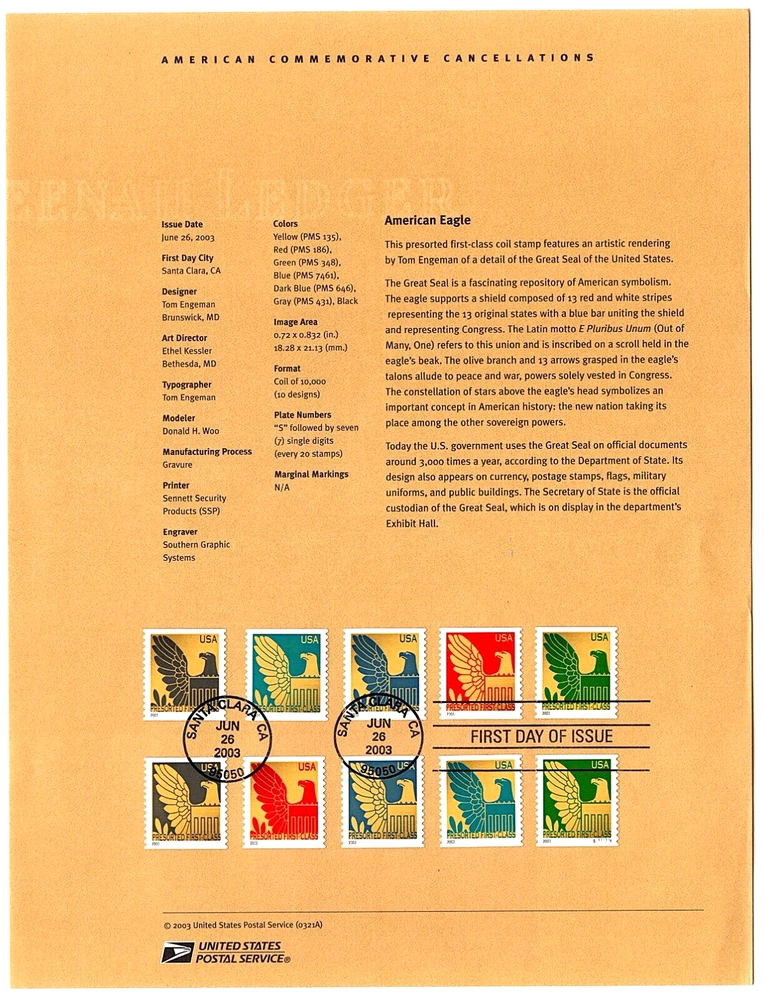 Official USPS 2003-21A American Eagle Souvenir Commemorative Cancellation Page June 26, 2004, Scott #'s 3792 - 3801b. The 3096, position 20, bottom right, is a plate # coil single, #S1111111. Note, minor corner dings at right, accentuated by the scanner. Shipping cost $3.00, USPS First Class. Ship this page with any other within 3 days for an additional $1.00