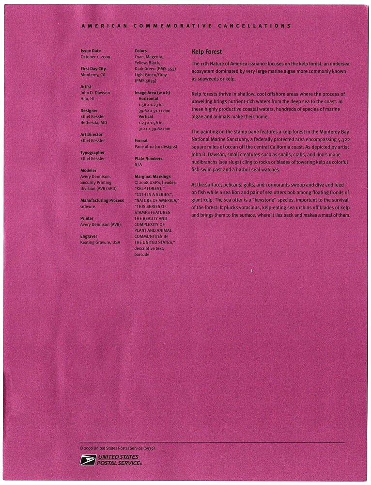 USPS Double Sided Souvenir Cancellation Page - $4.40 Kelp Forest, October 1, 2009, # (20)09-39, Scott # 4423, Page # SP1746. 2022 Scott Catalog - $9.00; 2021 Brookman - $15.00. Shipping cost $3.00, USPS First Class. Ship this page with any other within 3 days for an additional $1.00 This is a new account to allow me to simplify searching - see my feedback at 3kittysgolf.