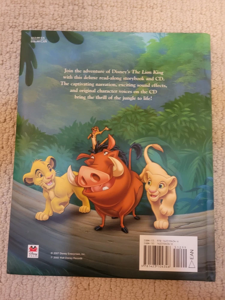 Item Weight:16 OzEdition:First EditionIllustrator:Disney Storybook Art Team, YesBook Series:A Disney Storybook and CD Ser.Genre:Juvenile Fictiongtin13:9781423104346Format:HardcoverAuthor:Parragon, Disney BooksBook Title:Lion King Storybook and CDItem Height:0.6 inItem Width:8.4 inPublication Year:2007Item Length:10.5 inISBN:9781423104346Topic:Royalty, Short Stories, Media Tie-In, Animals / Lions, Tigers, Leopards, Etc.Publisher:Disney PressNumber of Pages:46 PagesLanguage:English