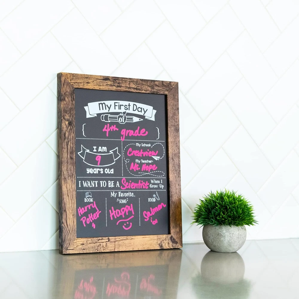 gtin13: 7445047132148 Material: Chalk Brand: Does not apply Item Dimensions W x H: 11"W x 14"H Color: Rustic Brown Frame Material: Engineered Wood Mounting Type: Wall Mount Item Weight: 19 Ounces Occasion Type: Birthday Orientation: Vertical Built-In Media: 2 Liquid Chalk Markers Additional Features: Double Sided UPC: 7445047132148 Recommended Uses For Product: First Day of School, Last Day of School Material Type: Chalk Target Audience: Teacher, Student Type: Does not apply Writing Board Type: Chalkboard