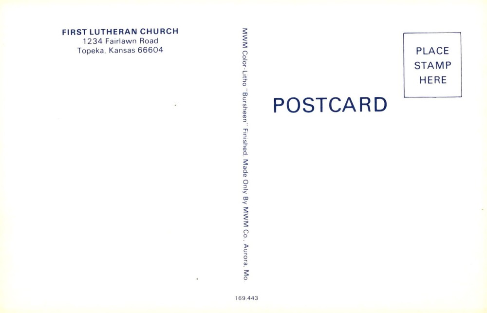 Vintage postcard featuring the First Lutheran Church located on Fairlawn Road in Topeka, Kansas. The postcard is a MWM Color-Litho 'Bursheen' finished card made by MWM Co. in Aurora, Missouri.