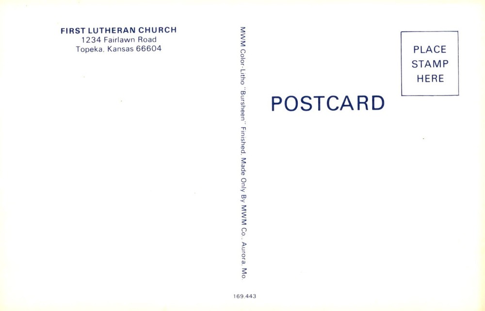 Vintage postcard featuring First Lutheran Church located at 1234 Fairlawn Road in Topeka, Kansas. The postcard is a MWM Color-Litho 'Bursheen' Finished card made by MWM Co. in Aurora, Missouri.