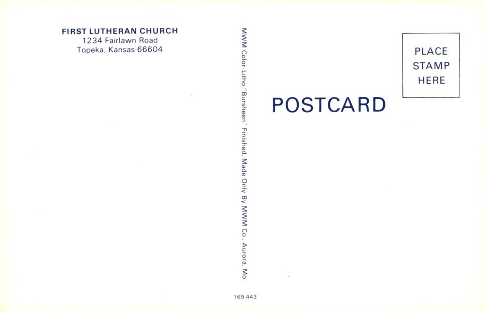 Postcard featuring the First Lutheran Church located at 1234 Fairlawn Road in Topeka, Kansas. The postcard is a MWM Color-Litho 'Bursheen' finished product made by MWM Co. in Aurora, Mo.