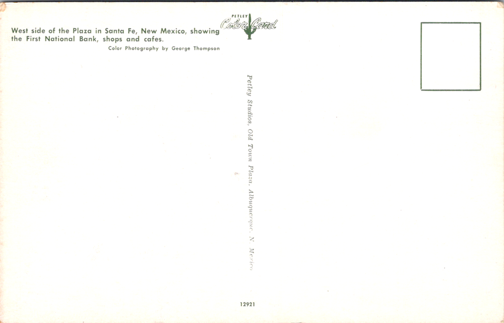 This vintage postcard depicts a street scene in Santa Fe, New Mexico, circa 1940. The postcard is an original printed lithograph by George Thompson and features a view of the First National Bank. The postcard is in its original state and has not been posted. The postcard measures 5.5 x 3.5 inches and is made of paper. It is a topographical postcard under the category of postcards and supplies, with a theme of architecture and cities & towns. The postcard is a great addition to any collection and is a must-have for those interested in the history of Santa Fe and New Mexico.