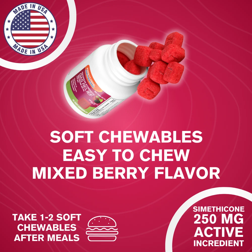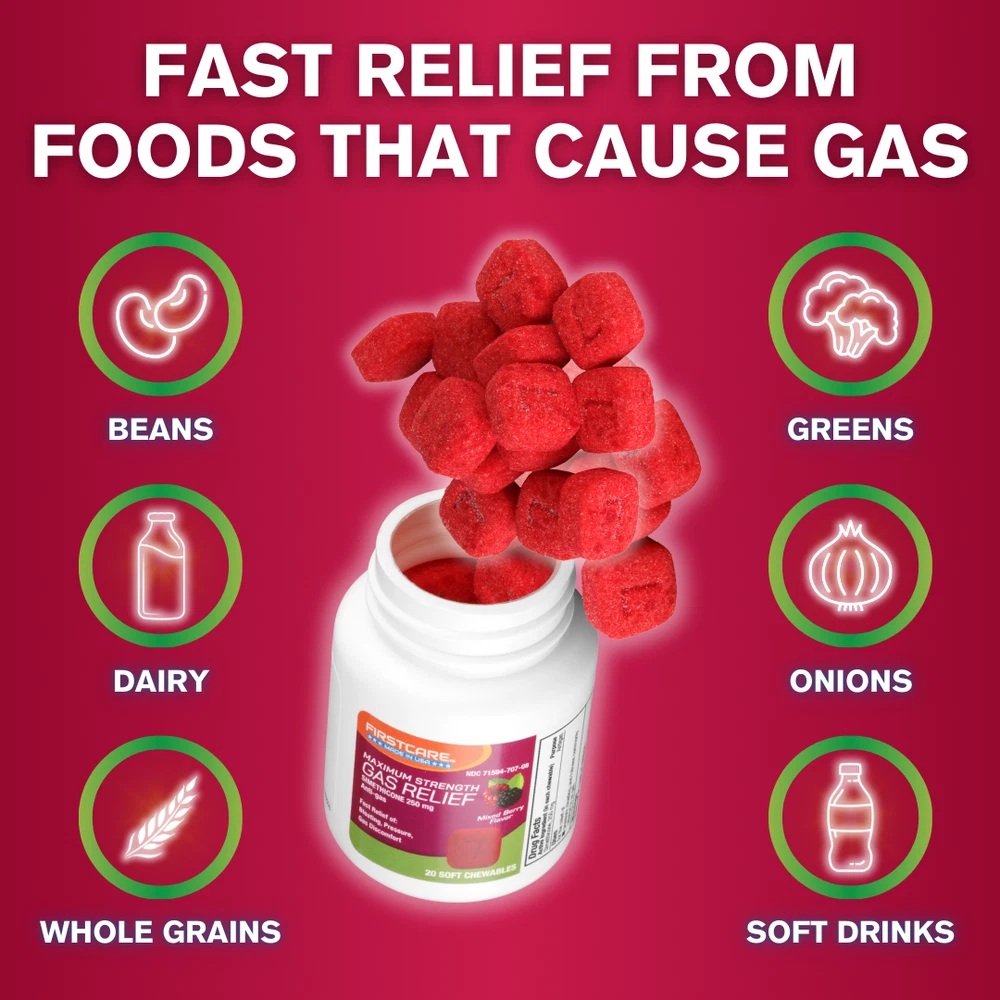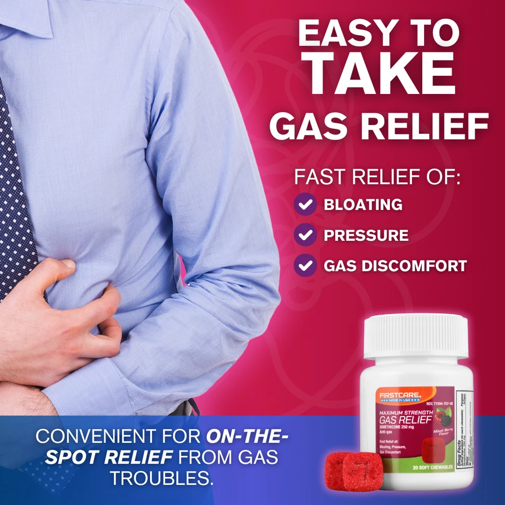 FirstCare® Gas Relief Soft Chewables (20 Count) Fast Relief of Bloating, Excess Pressure, & Gas Discomfort Simethicone 250 mg | Anti-Gas Chewable Medicine ABOUT THIS ITEM ✔️【 A Quick Remedy to Help Combat Gas and Bloating 】 - Works quickly to ease painful pressure, cramping, and discomfort caused by excess stomach and intestinal gas. Just 1-2 doses after meals provide rapid relief, helping you enjoy a less bloated belly. ✔️【 Keep Gas Issues to a Minimum After Meals 】 - Helps relieve gas buildup, fullness after eating, and stomach discomfort from excess gas. Perfect for those with dairy or gluten sensitivities or who consume a lot of fiber, veggies, and gassy foods. ✔️【 Great to Have On-Hand for Gas Troubles 】 - Small, convenient bottle that's easy to carry and doesn’t require water. Perfect for travel and quick, mess-free relief wherever you go. Be prepared for unexpected gas issues anytime, anywhere. ✔️【 A Chewable Solution for Gas, Bloating & Pressure 】- This easy-to-take chewable med is ideal for those who want to avoid pills. Each dose contains 250 mg of Simethicone to break up gas bubbles, providing quick relief from gas, bloating, pressure, and discomfort. ✔️【 Proudly Made in the USA 】- This OTC anti-gas solution is made in the USA, produced without animal by-products or preservatives, and is non-GMO certified. These anti gas and bloating chews are suitable for adults and children 12 years of age or older. CONTACT US Your satisfaction is our top priority, and we are dedicated to providing you with excellent customer service and are always available to assist you with any questions, comments, or product requests. Our team is easily accessible via eBay messaging on weekdays. SHIPPING POLICY 🚚 Enjoy FREE SHIPPING On All U.S. Orders via USPS First Class & Priority Mail and UPS ! No Minimum. All orders are processed within 2-3 business days (Monday to Friday). Please keep in mind that we do not process or ship orders on WEEKENDS or HOLIDAYS . RETURN POLICY We have a 30-day return policy if you are not completely satisfied with the product. Return shipping is the BUYER'S RESPONSIBILITY unless the return is the result of our error.