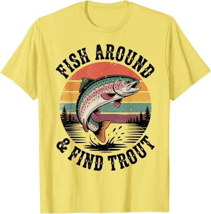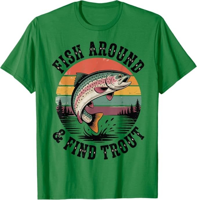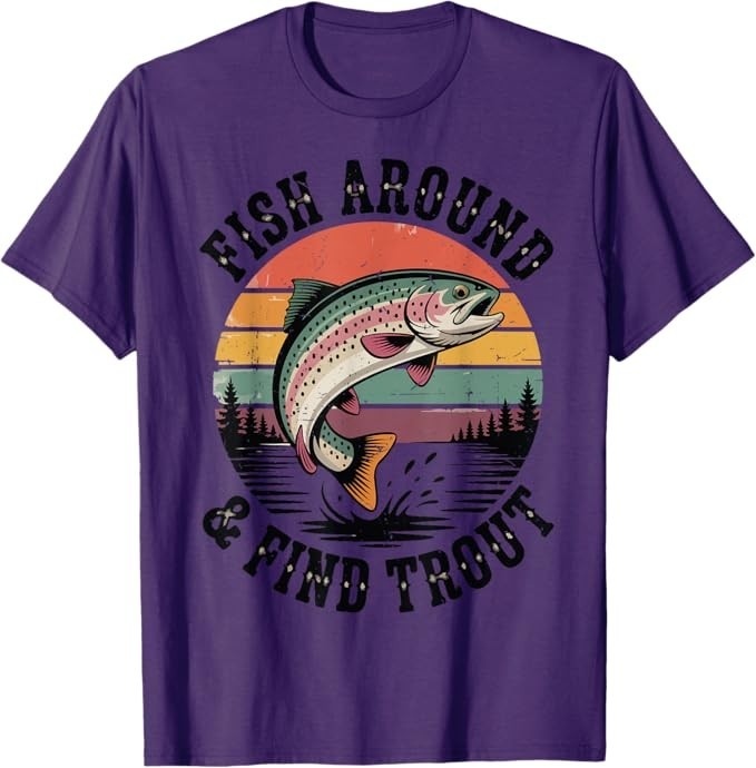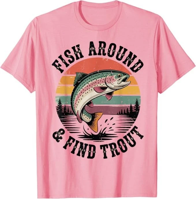Fish Around & Find Rainbow Trout Fly Fishing Gift Funny Dad T-Shirt Designed and Printed in USA Product Features: • Classic Look and Feel: This ultra cotton tee offer the timeless appeal of traditional cotton. The high-quality print enhances its casual appearance. • Material: Made from 6.1-ounce, 100% cotton. (Note: Dark Heather variant is 50% cotton, 50% polyester.) • Durability: Features double-needle stitching on the neck, sleeves, and hem for added durability. Designed for a roomy, unisex fit. • Print Type: DTG (Direct to Garment) • Manufacturer: Gildan 5000, 5000b (Made in USA) Shipping Information: • Handling Time: With POD(Print-On-Demand) product model, we typically require about 3 business-days handling time before shipping. In most cases, our handling time’s , rang e from 1-2 business days. • Delivery Time: • USA: Approximately 2 -6 business days • Canada: Approximately 6-10 business days (We currently don’t offer international Shipping) • Worldwide: Approximately 15-25 business days (We Currently don’t offer international Shipping) • Shipping Carriers: USPS and DHL • Note: Business days exclude weekends and holidays. Return & Exchange Policy: • Quality Guarantee: We stand behind the quality of our products and workmanship . Any defects or errors on our part must result in a refund/ replacement at no charge. • Conditions for Returns: Returns are generally not accepted for user errors such as incorrect selection of sizes, designs, or colors. Returns /Replacements are acceptable for damages such as poor printing results, incorrect size or design caused by us. • Note: Please reach out to us if there are any questions or issue s with your item, we’ll do our best to resolve any issue you might have. Note: • We’re glad to have your support! If you have a moment, y our honest feedback is very valuable to us. Thank you!