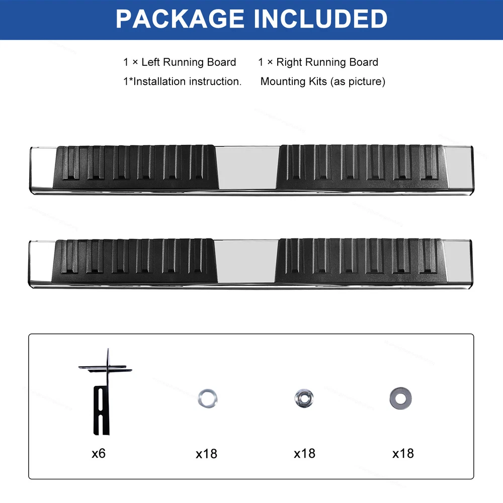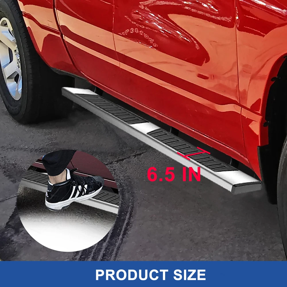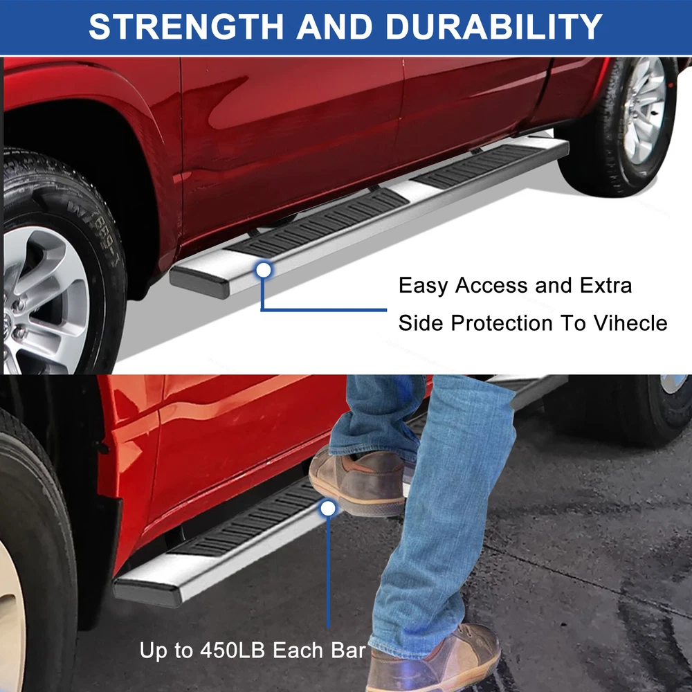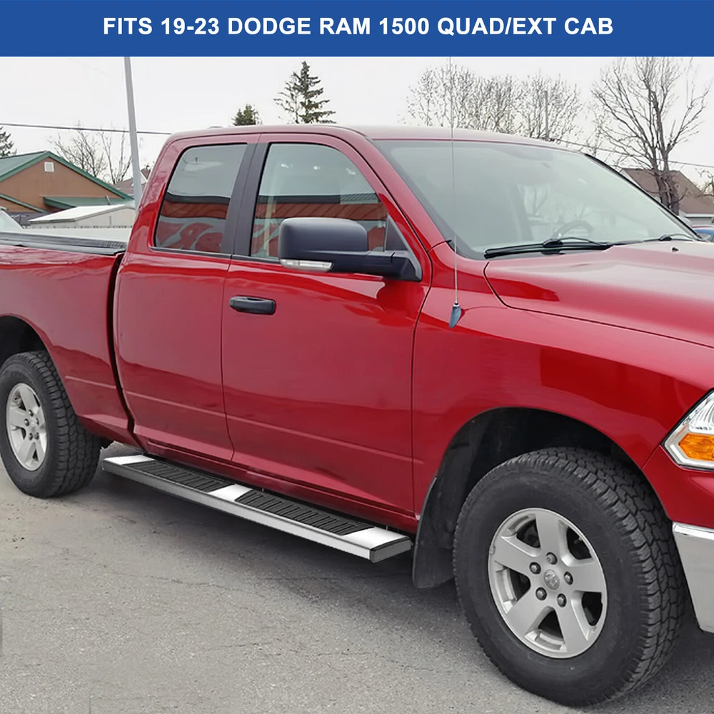 Fits 2019-2023 DODGE Ram 1500 Quad /Extended Cab 6.5" Running Board Side Step Nerf Bar Chrome Fitment Fits 2019-2023 Dodge Ram 1500 Quad Cab/ Extended Cab New Body Style (Exclude 2019-2022 Classic, ONLY Fit New Body,DO NOT Fit C lassic ) ONLY Fit Quad Cab with 2 full-size front doors & 2 narrower rear doors; DOES NOT Fits Crew cab; DOES NOT Fits Mega Cab. * Please refer to the Compatibility section of this listing page to see details And Confirm This Item Fits Yours Before Buying. Features High Quality Our items are 100% new quality items. When the step is retracted, the step can be matched with the bumper. It is completely convenient for you, providing you with long-term stable and excellent performance. Strength and Durability High-strength mounting bracket for holding up to 450 lbs on each side. 6.5 inches Width Non-slip, Large area will provide you with a strong support foothold, allowing you to get in and out of the bed easily and safely. Quality Materials Using enhanced high-quality materials, wear-resistant, corrosion-resistant, easy to clean, non-slip and long service life. Direct Replacement Easy To Install, Direct Bolt on , with an accurate screw hole. No Need to Drill, and with the Installation instruction. The Running Boards meets or exceeds the oem standard, and has been tested in the factory, perfectly matched with the original car, and can be installed directly. 1 Year Warranty This item have 1-year warranty. In the event, the item should fail due to manufacturing defects during intended use, we will replace the part by free.Don't Worry. Specification Condition : 100% New And High Quality Guaranteed Quantity : 1 Pair Material : Stainless Steel With ABS Design Placement on Vehicle : Left & Right Color : Chrome and Black Fitment Type : Direct Replacement Finish: Polished Item Size(H x W x H):77 in x 6.5 in x 2 in Maximum Load Capacity:Holding up to 450 lbs on each side Package Included 1 × Left Side Step Bars Running Board 1 × Right Side Step Bars Running Board and Mounting Kits and Installation instruction Installation * Easy To Install, Direct Bolt on, with an accurate screw hole, No Need to Drill. * The Running Boards meets or exceeds the oem standard, and has been tested in the factory, perfectly matched with the original car, and can be installed directly. Shipping We have multiple warehouses in US, and will choose the nearest one for shipping, according to your address and our inventory. Contact us Your satisfaction is guaranteed! If for any reason you are unhappy with your item, just return it within 30 days for a full refund. Please contact us prior to initiating a return so that we can issue you a refund authorization.