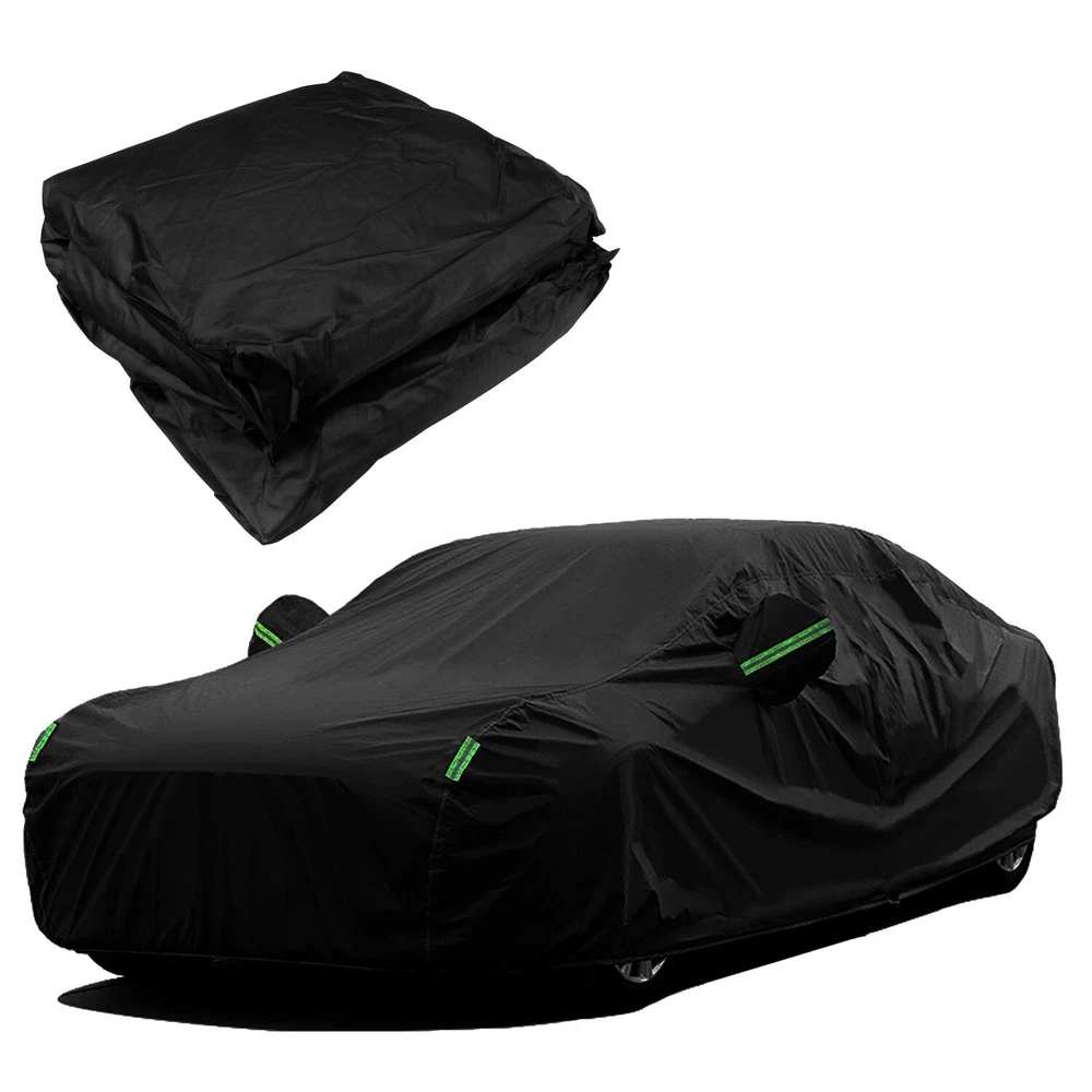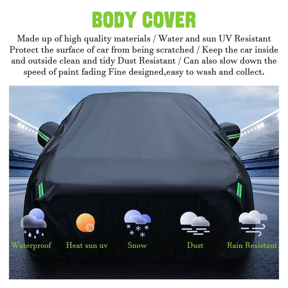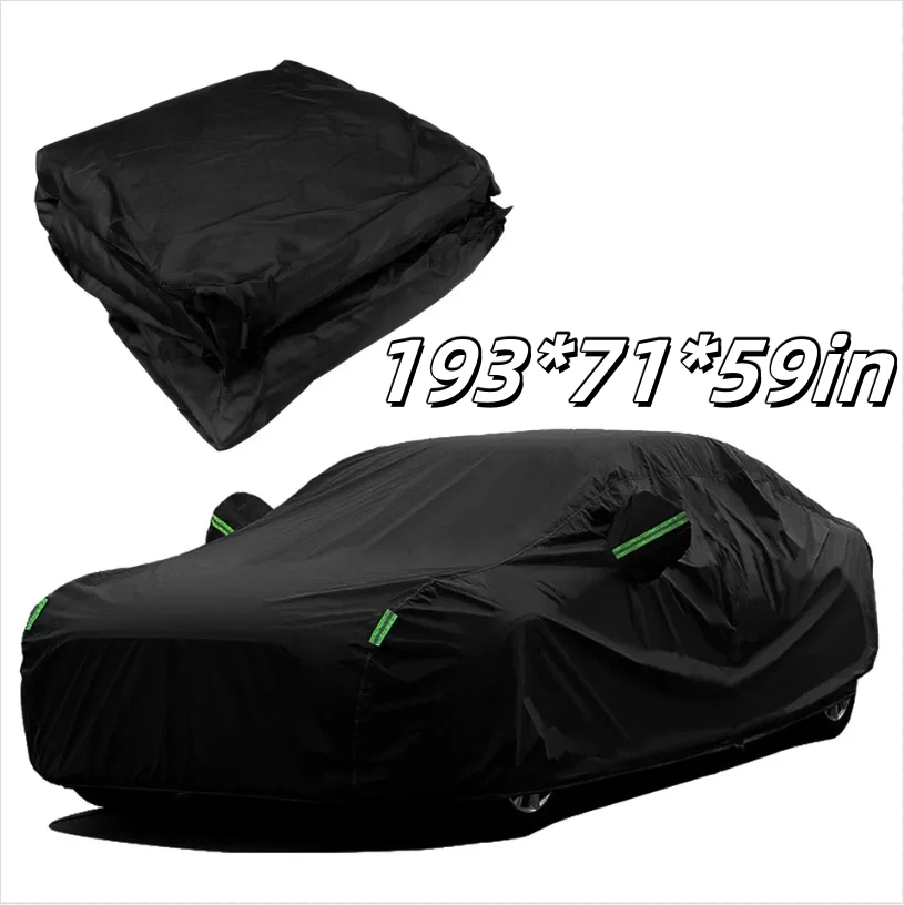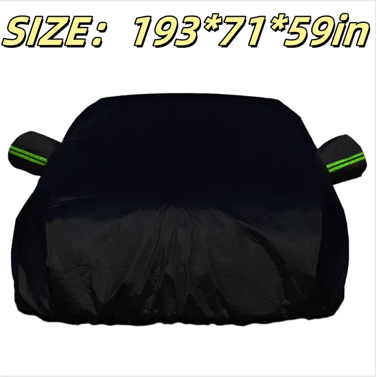 Feature: 🚗【Weatherproof Full Protector Car Cover】 Crafted from high density polyester taffeta with silver coating, the sturdy material is heat insulation, sun-proof, windproof, waterproof, hail-proof, snow-proof, dust-proof scratch resistant. 🚗【Reflective Strips】The 6 fluorescent reflective strips will shine at night to remind others away from the car and help you find the car quickly.With ear design for covering car mirrors. 🚗【Windproof & Anti-scratch】Double thread sewing,not easy to tear off;Elastic band,Windproof is stronger. 🚗【Universal Car Cover】This Car Cover size is 193" L X 71" W X 59" H,. please actually measure your car size before purchasing. 🚗【Easy Installation】Easy to put on and off, adjustable straps with durable buckle at the bottom to protect your car cover in heavy wind from blowing off. Specifications: Type: Full Car Cover Size: 193*71*59" Color: Black Material: 190T Polyester Taffeta Note: In Different Years, The Length Of The Car Is Different. Please Choose The Cover According To Your Car Length. Package include: 1 * Car Cover 1 * Storage Bag