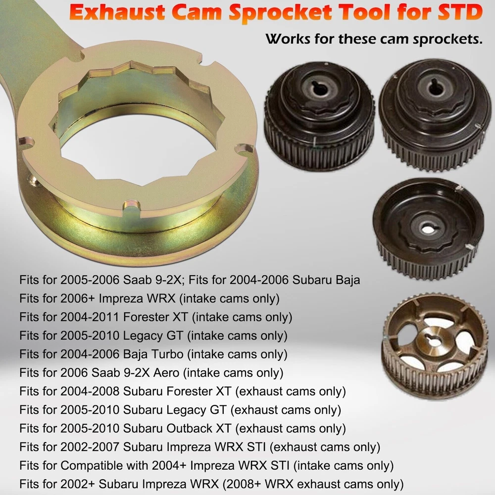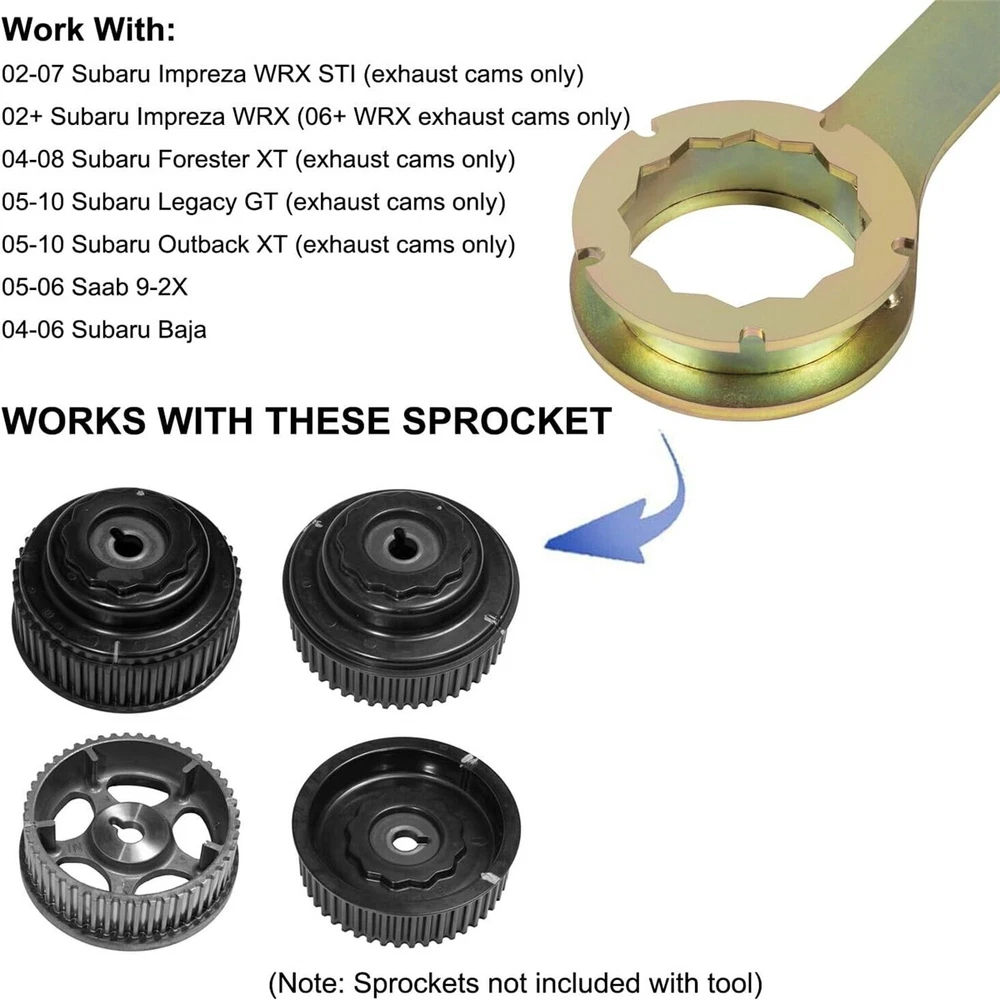 Product Description: ★Remove the Intake and Exhaust Cam Sprockets Without Damaging the Cam or Sprocket ★the Sprocket Specific Interface Will Not Round the Inner Pulley Spline like Other Designs ★Perfect Tool for Cam Seal Update, Cylinder Head Removal or Motor Removal ★Three-piece Welding Structure Handles Torque ★Perfect Tool for Cam Seal Update, Cylinder Head Removal or Motor Removal. Applies to: 2002-2007 Subaru Impreza Wrx Sti (Exhaust Cam Only) 2002+ Subaru Impreza Wrx (08+ Wrx Exhaust Cam Only) 2004-2008 Subaru Forester Xt (Exhaust Cam Only) 2005-2010 Subaru Legacy Gt (Exhaust Cam Only) 2005-2010 Subaru Outback Xt (Exhaust Cam Only) 2005-2006 Saab 9-2x 2004-2006 Subaru Baha PACKAGE DETAILS: 1Pcs Exhaust Cam Sprocket Tool