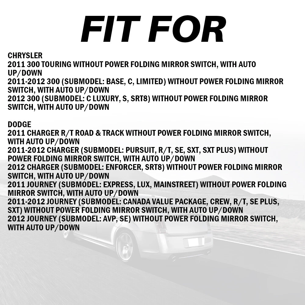 Fit for: Chrysler 2011 300 Touring without Power Folding Mirror Switch, with Auto Up/Down 2011-2012 300 (submodel: Base, C, Limited) without Power Folding Mirror Switch, with Auto Up/Down 2012 300 (submodel: C Luxury, S, SRT8) without Power Folding Mirror Switch, with Auto Up/Down Dodge 2011 Charger R/T Road & Track without Power Folding Mirror Switch, with Auto Up/Down 2011-2012 Charger (submodel: Pursuit, R/T, SE, SXT, SXT Plus) without Power Folding Mirror Switch, with Auto Up/Down 2012 Charger (submodel: Enforcer, SRT8) without Power Folding Mirror Switch, with Auto Up/Down Fits 2013-2018 DODGE RAM 1500 LEFT DRIVER FRONT WINDOW DOOR MIRROR MASTER SWITCH Fit for: Chrysler 2011 300 Touring without Power Folding Mirror Switch, with Auto Up/Down 2011-2012 300 (submodel: Base, C, Limited) without Power Folding Mirror Switch, with Auto Up/Down 2012 300 (submodel: C Luxury, S, SRT8) without Power Folding Mirror Switch, with Auto Up/Down Dodge 2011 Charger R/T Road & Track without Power Folding Mirror Switch, with Auto Up/Down 2011-2012 Charger (submodel: Pursuit, R/T, SE, SXT, SXT Plus) without Power Folding Mirror Switch, with Auto Up/Down 2012 Charger (submodel: Enforcer, SRT8) without Power Folding Mirror Switch, with Auto Up/Down 2011 Journey (submodel: Express, Lux, Mainstreet) without Power Folding Mirror Switch, with Auto Up/Down 2011-2012 Journey (submodel: Canada Value Package, Crew, R/T, SE Plus, SXT) without Power Folding Mirror Switch, with Auto Up/Down 2012 Journey (submodel: AVP, SE) without Power Folding Mirror Switch, with Auto Up/Down Ram 2016-2018 1500 (submodel: Big Horn, Express, HFE, Laramie, Laramie Limited, Laramie Longhorn, Limited, Lone Star, Outdoorsman, Rebel, SLT, Special Service, Sport, ST, SXT, Tradesman) 4-Door, without Power Folding Mirror Switch, with Auto Up/Down 2019 1500 Classic (submodel: Big Horn, Express, Laramie, Lone Star, SLT, Special Service, ST, SXT Plus, Tradesman, Warlock) Crew Cab Pickup, without Power Folding Mirrors 2016-2018 2500 (submodel: Big Horn, Laramie, Laramie Limited, Laramie Longhorn, Limited, Outdoorsman, Power Wagon, SLT, ST, Tradesman) 4-Door, without Power Folding Mirror Switch, with Auto Up/Down 2017 3500 Lone Star 4-Door, without Power Folding Mirror Switch, with Auto Up/Down 2016-2018 3500 (submodel: Big Horn, Laramie, Laramie Limited, Laramie Longhorn, Limited, SLT, ST, Tradesman) 4-Door, without Power Folding Mirror Switch, with Auto Up/Down 2016 4500 (submodel: Laramie, SLT, Tradesman) 4-Door, without Power Folding Mirror Switch, with Auto Up/Down 2016 5500 (submodel: Laramie, SLT, Tradesman) 4-Door, without Power Folding Mirror Switch, with Auto Up/Down Specifications OE Number: 56046823AE, 56046823AD, 56046823AC Number of Pins: 11 Pins Placement on Vehicle: Front left Features: *Stable Performance Better stability with longer service life. *Ideal Accessory This window switch fits, functions and matches the appearance of the old one for a perfect replacement. *Direct Replacement Direct replacement without other tools. *Quality Testing It has undergone simulation and endurance testing to ensure proper fit and performance. *Note Please ensure that the parts, connectors and OE number are the same as your old products before ordering to avoid the wrong purchase. Packaging Include: Window switch*1 Item Specifics Brand AUXITO Features 11-Prong Blade Male Terminal; Female Connector Black 10 Buttons Fitment Type Direct Replacement Interchange Part Number 56046823AE, 56046823AD, 56046823AC Manufacturer Part Number CCKG-CHARGER-11-12 Manufacturer Warranty 5 Years OE Number 56046823AE OE/OEM Part Number 56046823AE Other Part Number 56046823AE Part Name Window Switch Performance Part No Placement on Vehicle Left, Front Quantity Sold individually Superseded Part Number DWS1897 56046823AE 2019 2018 2017 2016 2012 2011 Ram, Dodge, Chrysler 1500 Classic 2500 3500 4500 5500 Charger 300 Journey Crew Cab Pickup, without Power Folding Mirrors 4-Door, without Power Folding Mirror Switch, with Auto Up/Down Type Window Switch Universal Fitment No To Control Window Color Black Payment We accept PayPal via eBay Secure Check-Out only. Immediate payment needs to be processed for items with Add to Cart option so that any promotional discounts can be applied to your order immediately. Shipping 1 .We do everything we can to ship your orders out as soon as possible. 2. Shipping and Handling: We process orders within two business day after the payment was clear. Returns Our 30-day Satisfaction Guarantee assures our customers that they will receive all orders promptly and exactly as described. In addition, it allows customers to return new and unused products in their original factory condition for any reason within 30 days from the date of purchase. 1. All returns must be pre-approved by AUXITO and have a return merchandise authorization(RMA) number. Unauthorized returns will not be accepted. 2. Buyers are responsible for appropriate packing, returning shipping cost, insurance and returning the item in "new" condition. Used items will not be accepted for return. 3. We will replace the returning item with an identical item, issue a full store credit or a full refund. Contact Us Our Working Time:(GMT+8)Monday to Friday,9:00-18:00. For inquires and customer support, please send your email via ebay email system. All emails will be responded to within 24 hours during business days. Feedbacks 1. We appreciate your business and strived to improve our customer service and our commitment to quality. 2. We will leave a positive feedback immediately after payment is received. We appreciate a positive feedback as much as you do. 3. If for some reason there is any issue with the purchase, please contact us prior to leaving feedback, and we will be glad to work with you to have it resolved. DESCRIPTION PAYMENT SHIPPING RETURN POLICY CONTACT US Hot Item 190 PCS Bumper Fender Moulding Side Garnish Grille Retainer Clip ABS Various USD 10.44 Waterproof Motorcycle Handleb