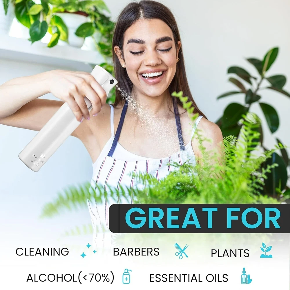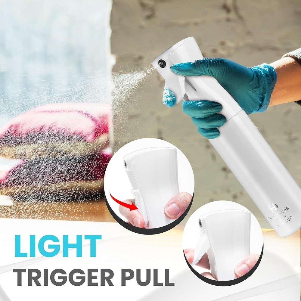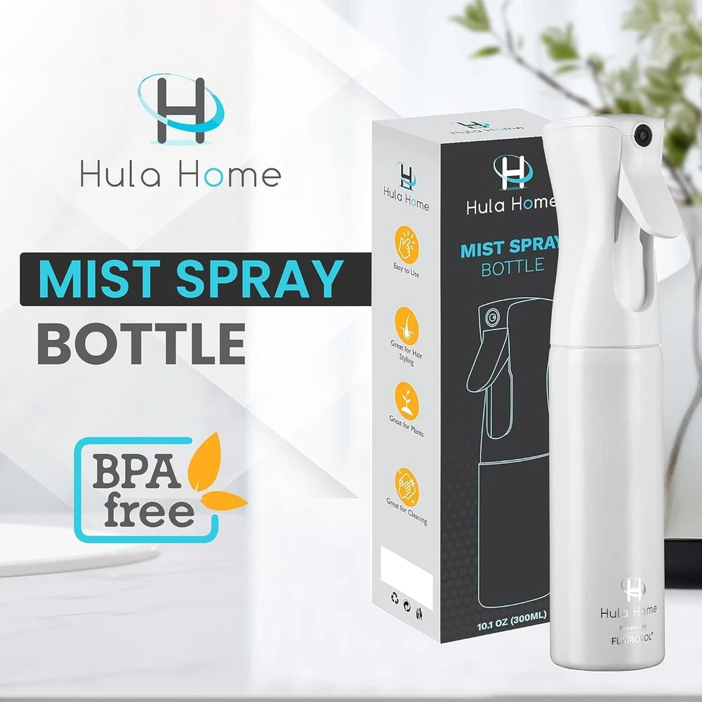 Spray Bottle for Hair - Powered by Flairosol Spray Technology - Continuous Ultra Fine Mist Sprayer – For Hairstyling, Cleaning, Salons, Plants, Essential Oil - All White 【Flairosol Continuous Fine Mist Spray】Flairosol's next generation pump creates a powerful, ultra fine mist spray that has the power of an aerosol without using harmful compressed gases. As featured on E!, our spray bottle will give a continuous spray of fine mist lasting 1-2 seconds after the 2nd trigger pull. Even when turned upside down, you will get even, complete sprays in every single pull. With a spray nozzle diameter of , the mist is so fine that even if you miss and get it on furniture it will dry up almost instantly. 【Light Trigger Pull】Spare your fingers and avoid any pain! Our BPA Free spray bottles include a light trigger pull for your maximum convenience. Particularly recommended for customers suffering from arthritis. 【Super Quick to Refill】The unique threading of our twist top design allows you to quickly twist the head 180° to remove it and refill it. This is unlike our competitors that will leave you unscrewing the head many times and wasting precious time just to refill the bottle when you could be cleaning your bathroom or styling hair! 【Leak Proof, 360° Spray】Our unique design provides maximum versatility using the option to spray in any angle, while protecting your countertops and surfaces by eliminating any leaks. Keep the water exactly where you want it: inside the bottle and spraying according to your directions! 【So Many Uses】As featured on Real Simple, this is the most versatile BPA Free mister spray bottle on the internet, it can be used around the house, for beauty including hairstyling, cleaning, ironing, watering plants, misting air fresheners, spraying water-diluted essential oils and much more. Dimensions: 300ml/ Height: 25cm/ Diameter: ; made of high quality, eco-friendly PET material.