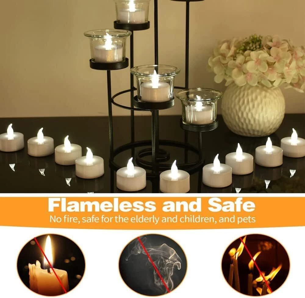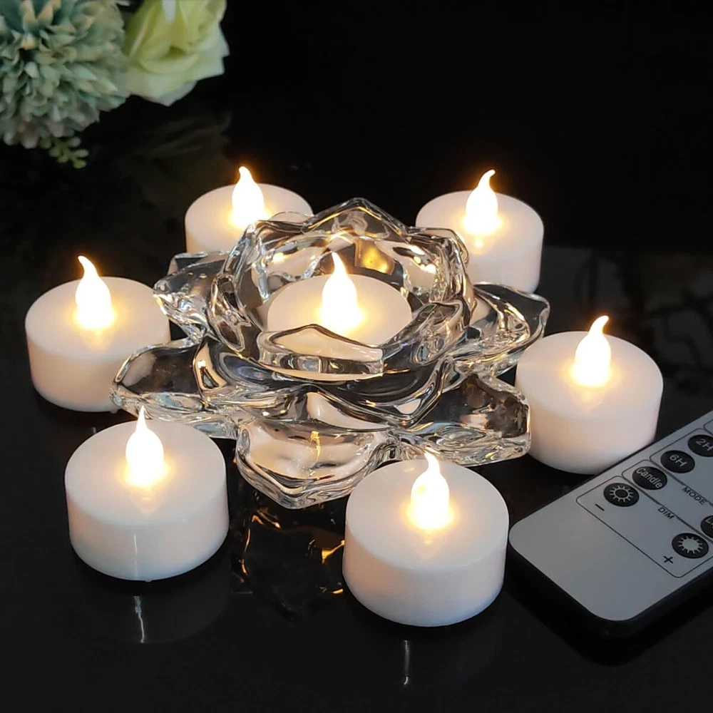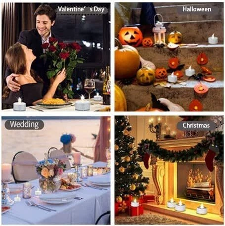 LED tea light with remote control Features: 1.Safe for usage in any setting or occasion, there is no flame or smoke. 2.The Tea light Candles is designed to flicker in a realistic way so that one can feel the atmosphere of an actual candle flame without any hazard or hassles. 3.These electronic tea lights can also be given away as gifts or party favors. 4.Very easy to use, these led tealights can be turned on and off by the flick of a switch. Specification: 1.Material: LED+PP. 2.Size: Diameter 3.7 cm / 1.45 inch + Height 3.6 cm/1.42 inch. 3.Battery: CR 2032 button cell. 4.Battery life: 180+hours. 5.Light color: warm white Package include: 12 X battery tea lights + remote control+ 50PCS Petals. Q&A: Q1: Does it come with a remote control? A: Yes, it is with a remote control, ON/OFF switch on the bottom. You can use the ON/OFF switch and remote control. Q2: Does it with timer function? A: Yes, it is with 2H,4H,6H,8H timer setting. Q3: Is it rechargeable? A: No, it is not rechargeable. It is with 240mAh high-capacity CR2032 batteries, if the battery runs out, you can replace the old one with a new CR2032 battery. Q4: Would these fit in votive candle holders? A: Yes! The base is exactly the same size as a votive candle. Attention: It is best to use "OFF" to turn off the led tea lights when you are not using it for a long time, rather than using a remote control to turn off the led tea lights. Because in the "ON" state, the tea lights still needs to use flow, and if you want to use it for a longer time, try to use the "OFF" state when not in use 💖Remote Control & Timer Function - Allows you to display candles in hard to reach places. You can choose between 2/4/6/8 hour timers as well as static blinking light options and brightness levels. The timer loops every 24 hours 💖Long Battery Life -These remote control candles feature 240mAh high-capacity CR2032 batteries, The led tea lights can last over 100 hours in non stop using ,it is longer than most of other brand tealight with remote in the market ,big capacity battery means saving your money 💖Create a Cozy Ambiance: Our warm white LED tea lights provide the perfect touch of mood lighting for any occasion. Use them in votive holders, glass cups, or on their own to set the scene for a romantic dinner, a festive party, or just a quiet night at home. 💖Flameless and Safe - Lifelike look while unscented, no drips, no smoke, no hazard, our candles safely go where traditional flame candles can’t, perfect for your home with kids and pets. 💖Widely used - Battery candles with remote and timer Ideal for home decor, wedding centerpieces, parties, Valentine's Day, Easter, Halloween, and Christmas. Undoubtedly they will add to the fun and goodness of any occasion, they are the perfect combination of convenience and durability.