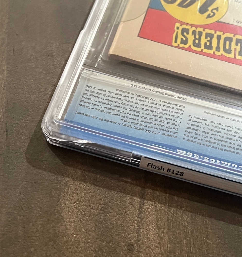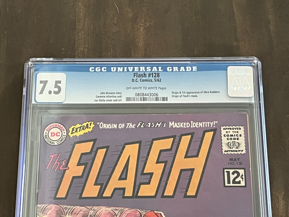 NEW INVENTORY DAILY !! >> MORE KEYS ISSUES SOON << π₯ Flash ( 1958 ) # 128 π₯ 1962 1st Appearance & Origin of Abra Kadabra CGC 7.5 VF- OW/W Pages DC Silver Age Key * NOTE - Tiny Break in Case Top corner ( photo 4 ) High Grade (VF-) Condition Check back and feel free to follow us on eBay to be notified of future listings! We do discount shipping on most orders within the United States within a 3 day period. * Refer to Requirements below * Terms of Sale Bid and buy with confidence. Please see our 99.5% positive feedback. Bidder to pay shipping. Great collectible! Please see our other auctions. New listings daily! Please email with any questions or to request more photos. Local Pick-up available. Payment must be made within three days once the auction has ended. Shipping and handling on orders can only be combined within those three days. Unpaid item cases automatically Cancel on the 4th day. Shipping *Please note, International Shipping for this item is provided through Ebays Global Shipping Program. For questions regarding whether they combine shipping on more than one item, please contact Ebay. The Global Shipping Program is a third party shipper here in the United States. It is our understanding that packages get shipped to them and they then ship Internationally and can offer better rates than if we were to ship Internationally. Therefore we cannot personally send out any invoices or any customs information! Everything comes through Ebays Global Shipping Program* All International shipping is through Ebay's Global Shipping Program. All shipping questions should be directed to Ebay. Thank you.