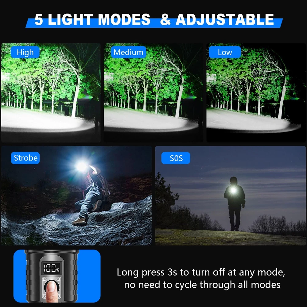 【FLASHLIGHTS HIGH LUMENS 990,000】: The super bright flashlight is equipped with an upgraded 2024 XHM77.2 chip and the light source is much more stable. Since the light penetration is stronger than other lamp beads', its beam can pass through dust and fog well, comparable to car fog lamps, especially suitable for foggy and rainy days with low visibility. It can easily illuminate an 2160-square-foot room or focus on objects up to 3938 feet away.The led flashlight is the best choice for gifts. 【LCD POWER DISPLAY | RECHARGEABLE FLASHLIGHTS | USB OUTPUT】: This flashlights high lumens Rechargeable has been newly upgraded with the unique LCD power percentage display, at a glance, you can always grasp the remaining power. As well, this flash light has been completely improved to shorten the charging time and extend the service life, which can provide up to 12 hours of powerful, non-diminishing brightness. Built-in usb interface, It's more convenient to charge. It can also charge the phone. 【UPGRADED 5 MODE & ADJUSTABLE】: The brightness of 5 modes(High/Medium/Low/Strobe/SOS) changes gradually instead of changing instantly, which can avoid the sudden irritation to the eye, therefore it can protect our eyes. The smooth current transition system can also better protect worlds brightest flashlight components, thus extending the service life. we can stretch the head to change the focal length and beam size, it has more powerful long range in spotlight and a wider field in floodlight. 【IP67 WATERPROOF & PRACTICALLY INDESTRUCTIBLE】: The flashlights high lumens is made of aviation grade aluminum alloy, which is durable and not easy to rust. The strong fuselage means excellent shock resistance(up to 10 feet impact) or even ran over by a truck (10T), it still works! Built-in high tenacity seal rubber waterproof ring, the light rain and fog is not a problem, even it can guard you well in the harsh environment, perfect for hunting, fishing etc. outdoor activities. 【365NM BLACK LIGHT FLASHLIGHT】G1695 high power flashlight comes with a UV blacklight flashlight, which emits 365nm wavelength. It is perfect for detecting what naked eye can not see, like dog and other pet urine/stains, driver license, official identification cards, passports, customs or authenticate currency. The size is 3.34''x 0.78'' and the weight is 45g. It's ultra-lightweight and portable, you can keep in your pocket or at home or elsewhere. 【UPGRADED GREAT VALUE POWERFUL FLASHLIGHTS KIT】: What you will get : 1x G1695 high powered flashlight, 1x UV blacklight flashlight, 1x Powerful battery and USB charging cable, 3x AAA Batteries, 1x Lanyard and holster, 1x Manual and Gift box. You will be pleasantly surprised by the brightness, quality, longevity and performance of the led flashlights high lumens.If you have any questions about the led flashlight, please feel free to contact us. We will be happy to answer your questions.