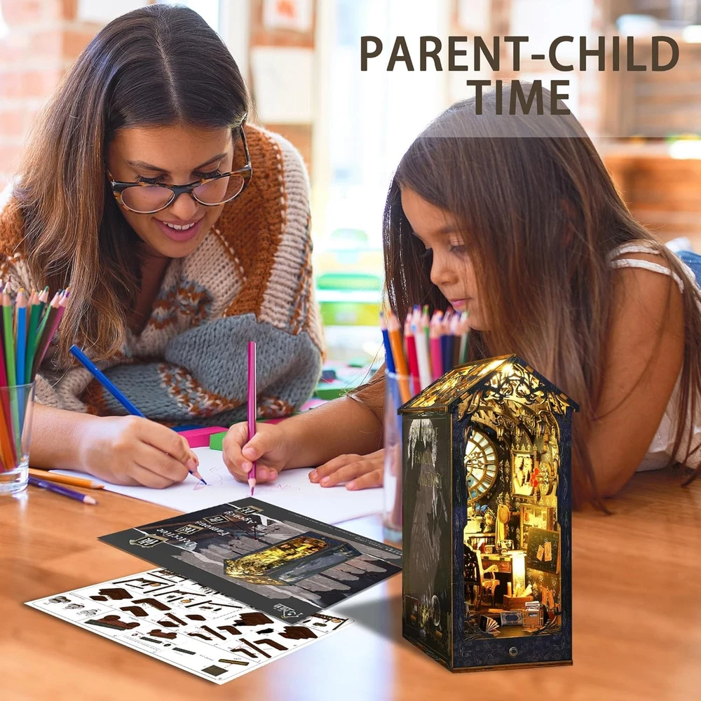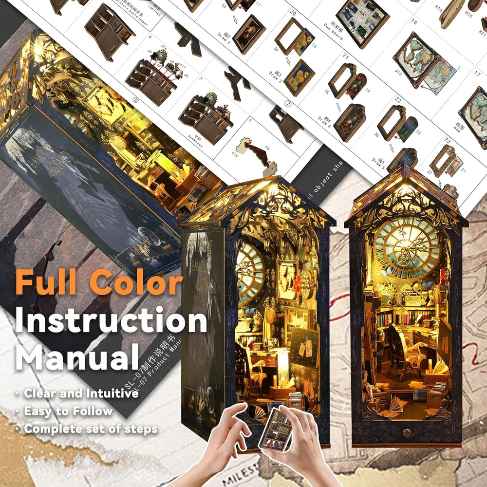 Flever Dollhouse DIY Book Nook Miniature Kit, Detective Famous Agency Product Details Product Dimensions: 7.1 x 4.5 x 10 inches Item Weight: 1.9 pounds Country of Origin: China Item model number: SL07 Manufacturer recommended age: 14 years and up Manufacturer: Flever 【Material list】The assembly is suitable for people older than 14 years and need patience to assemble by yourself! The Kit includes: 1) pre-cut MDF wooden pieces for the house structure and furniture 2) fabric and printed paper for decorations and accessories 3) plexiglass pieces for the dust cover 4) LED light wires and music movement 5) English Manual 【Immersive DIY Experience】Immerse yourself in a captivating DIY project that whisks away stress and anxiety. Building this book nook is a relaxing journey into a miniature world, helping you unwind as you craft each tiny detail. It's an enjoyable hands-on escape from the daily hustle, leaving you with a clear mind and a big smile. 【Great for Family & Friends】Assembling our book nook kit is a wonderful activity to share with family or friends. Work together to create the miniature scene and enjoy quality time filled with teamwork and fun. It’s a delightful way to connect with loved ones, spark creativity, and make cherished memories. And once you've placed the final piece, everyone can share in the pride and sense of accomplishment of building something amazing together. 【Thoughtful Gift for Any Occasion】Surprise someone special with a gift that stands out. This DIY book nook kit is an imaginative present for relatives, friends, or colleagues. It provides not just an enjoyable crafting experience but also a charming finished piece that celebrates their love of books and creativity. Perfect for birthdays, holidays, or just because – it's a gift that shows you truly care. 【Eye-Catching Bookshelf Decor】Once built, this book nook becomes a stunning décor piece for your bookshelf, office, or living room. The miniature scene comes to life with warm LED lights, creating a cozy, magical atmosphere among your books. It’s sure to catch everyone’s eye and add a touch of wonder to your home or workspace, elevating the ambiance of your space. 【Premium Quality & Support】We ensure a hassle-free building experience from start to finish. Each kit is made with high-quality, precision-cut materials and comes with clear instructions. If you have any questions or encounter issues during assembly, our friendly after-sales support is always ready to assist. Build with confidence knowing we've got you covered every step of the way.