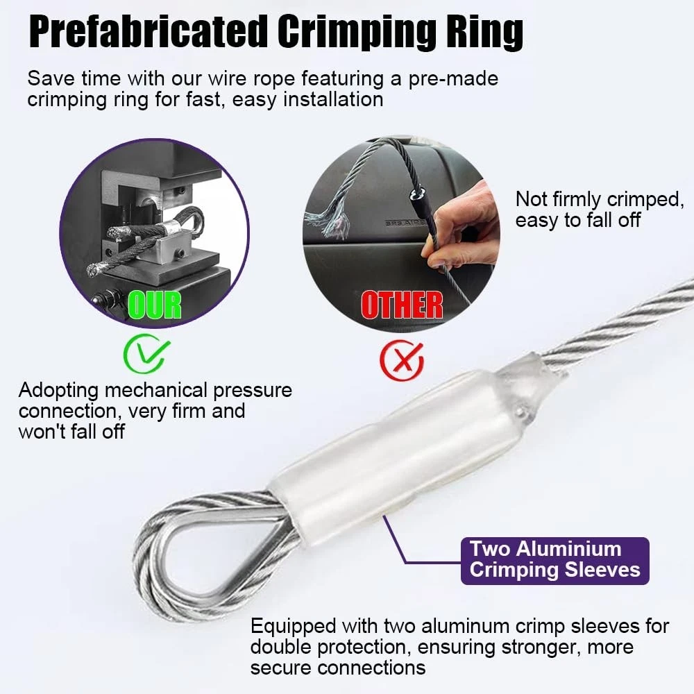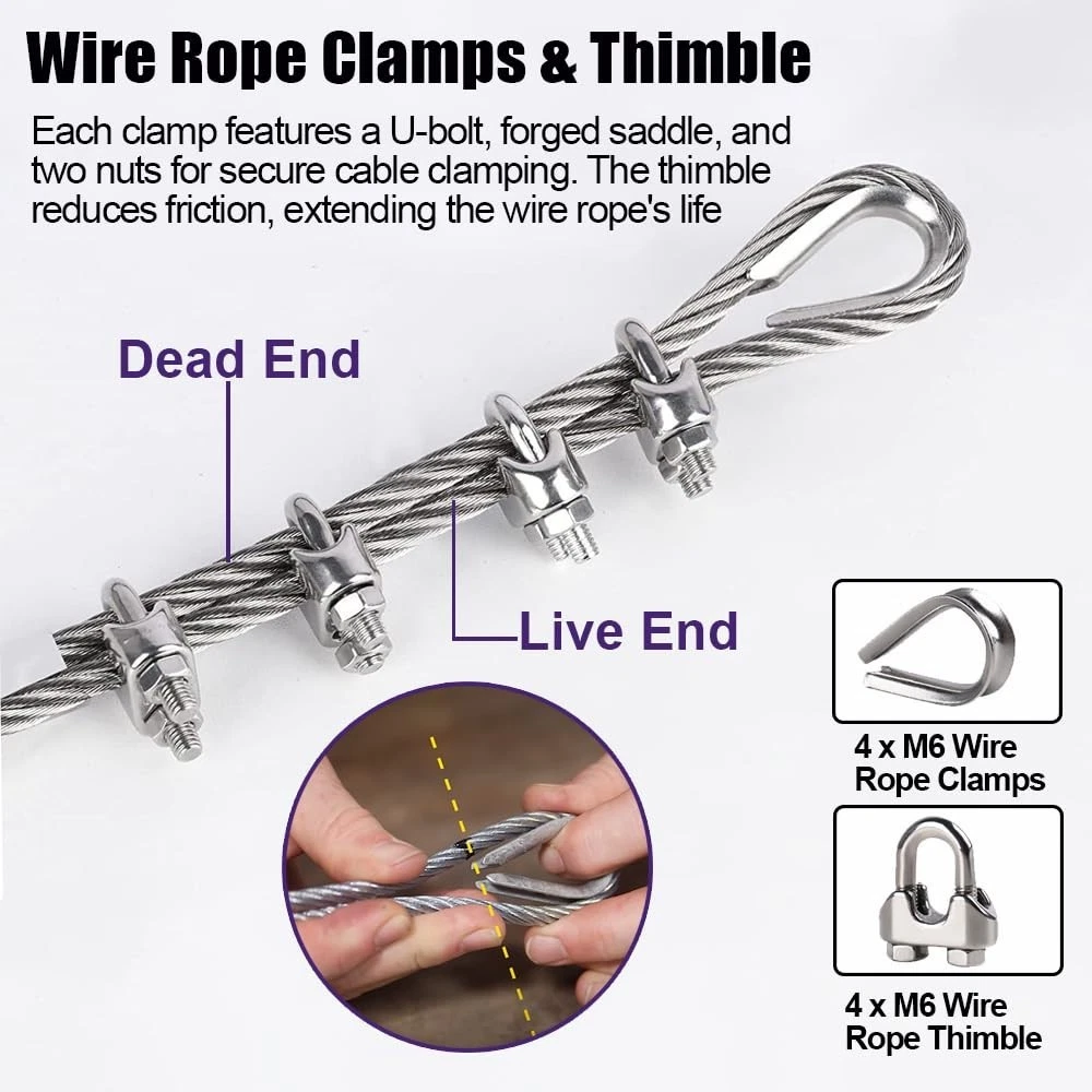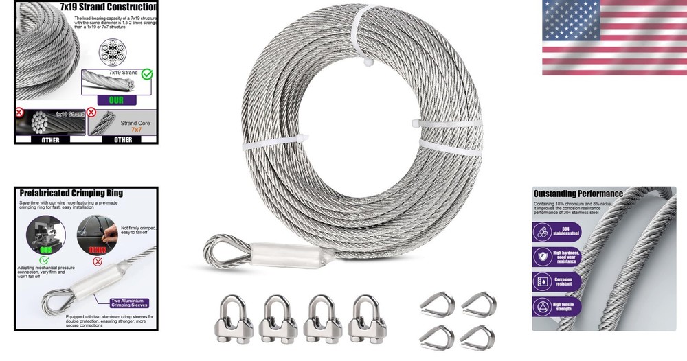 Flexible 25ft Stainless Steel Cable - 6400lbs Strength for Outdoor Projects ‹ › ‹ › ‹ › ‹ › ‹ › ‹ › ‹ › ‹ › ‹ › Flexible 25ft Stainless Steel Cable -6400lbs Strength for Outdoor Projects Product Features: Crafted from 304 stainless steel for outstanding rust and corrosion resistance. Robust breaking strength of 6400 lbs, ideal for ziplines, sailboats, and heavy-duty applications. Complete wire rope kit, including: 25ft steel cable with loop 4 M6 wire rope clamps 4 M6 wire rope thimbles Engineered with a 7x19 strand construction enhancing flexibility and strength. Pre-installed aluminum loop for efficient installation—just connect to a screw buckle or hook. Benefits: Durability built to withstand the elements, ensuring long-lasting reliability. Effortless installation saves you time, letting you focus on your project. Versatile for a multitude of applications including ziplines, shade sails, dog runs, and deck railings. Customizable length to suit your specific needs while maintaining peak performance. Why Choose Our Flexible Stainless Steel Cable? Elevate your outdoor projects with our Flexible 25ft Stainless Steel Cable. Designed not just to meet, but exceed durability expectations, this cable showcases 304 stainless steel’s ability to fend off rust and corrosion while providing an incredible breaking strength of 6400 lbs. The complete wire rope kit ensures hassle-free setup, while the 7x19 strand construction offers superior flexibility that outshines traditional strands. Whether crafting ziplines, constructing shade sails, or securing deck railings, our stainless steel cable stands as a testament to strength, reliability, and efficiency. Don’t settle for less; invest in a cable that promises enduring performance for to come. Shipping Free & Fast Shipping - We offer free shipping to most of the USA with a normal delivery time of 3-7 days. However, due to the current situation, additional delivery time (up to 3 weeks) may be required for some items. Alternative Carriers - We may use alternative carriers (e.g. USPS, FedEx, UPS, etc.) to ensure your package arrives safely and on time. Due to the use of multiple carriers, we are unable to provide a tracking number automatically. Handling Time - Orders are processed and shipped within 1-2 business days of receiving cleared payment. Shipping Restrictions - Shipping to Alaska, Hawaii, Puerto Rico, Guam, and other US territories may incur shipping charges or delivery restrictions. Please contact us before ordering, or your order can be refunded/cancelled. State Restrictions - There may be restrictions based on your state of purchase. For example, certain items may not be shipped to California due to state regulations. Contact for Tracking Updates - If you require tracking updates or have any concerns about the delivery of your order, please feel free to contact us, and we will be happy to assist you. Return 30-Day Hassle-Free Returns - We want you to be completely satisfied with your purchase. If you are not, you can return the item within 30 days of receiving it for a full refund or exchange. Easy Return Process - To start a return, simply contact us and we will provide you with a prepaid return shipping label and detailed instructions. Restocking Fee - There are no restocking fees for returns. However, the buyer is responsible for return shipping costs if the return is not due to a seller's error. Refund Processing Time - Refunds will be processed within 5 business days of receiving the returned item in its condition. Payment We accept all major credit cards, PayPal, and Apple Pay for your convenience. Your payment information is secure and encrypted to ensure a safe and seamless transaction. Please complete your payment within 3 days of purchase to avoid any delays in shipping. Feedback Your feedback is extremely important to us. We strive to provide the best products and customer service possible. If you are satisfied with your purchase, please take a moment to leave us a positive review. If you have any concerns or issues with your order, please contact us before leaving negative feedback. We are committed to resolving any problems and ensuring your satisfaction. Contact Us If you have any questions or concerns, please feel free to out to our customer support team. You can contact us through the eBay messaging system. We are available Monday to Friday, 9:00 am to 5:00 pm EST, and we will do our best to respond to your inquiry within 24 hours. Buy it now and enjoy a pleasant shopping experience! Model: Stainless Steel Wire Rope MPN: Stainless_Steel_Wire_Rope Unit Quantity: 1.0 count