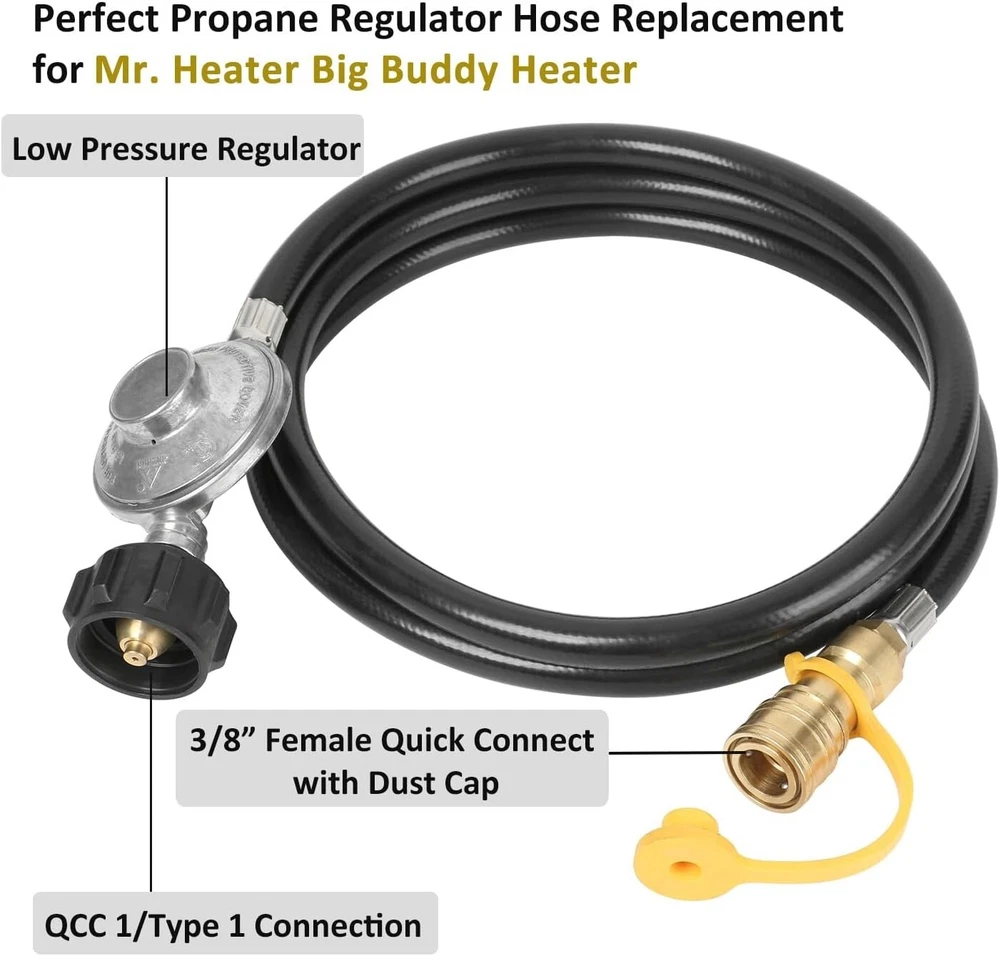 Flexible 6-Foot Propane Hose with Solid Brass Fittings for Big Buddy Heater Use ‹ › ‹ › ‹ › ‹ › ‹ › ‹ › ‹ › ‹ › ‹ › Flexible 6-Foot Propane Hose Designed specifically for use with the Mr. Heater Big Buddy Heater, this flexible propane hose is an essential accessory for any outdoor or indoor heating experience. Features: Compatible with Mr. Heater Big Buddy Heater models MH18B & F274830. No need for filters – this direct connect hose simplifies your propane connection. 3/8” Quick Connect & QCC1 connection (Type 1) for seamless integration with your propane system. Female quick connect fitting designed to fit standard 3/8 male quick connect (SAE fitting). Compatible with 5lb-40lb propane tanks for enhanced versatility. CSA certified for your peace of mind. Benefits: Enjoy continuous heat in your Big Buddy Heater using a 20lb propane tank without worrying about running out of 1lb canisters. Quick and easy to connect – get your heater up and running in no time. Solid brass fittings provide a tight, secure connection for safe propane use. Flexible 6-foot length allows for greater mobility and convenience in positioning your propane device. Constructed for lasting durability and high performance characteristics. Why choose our Flexible Propane Hose? Transform your heating experience with this meticulously designed 6-foot propane hose, created for the Mr. Heater Big Buddy Heater. Say goodbye to the hassle of constantly replacing small propane canisters and simplify your outdoor adventures with the ease of connecting to larger propane tanks. Its high-quality construction assures you of safe operation while the flexible length grants you the freedom to position your heater exactly where you need it. Don’t settle for less when it comes to your heating needs – elevate your experience with our Flexible 6-Foot Propane Hose today! Shipping Free & Fast Shipping - We offer free shipping to most of the USA with a normal delivery time of 3-7 days. However, due to the current situation, additional delivery time (up to 3 weeks) may be required for some items. Alternative Carriers - We may use alternative carriers (e.g. USPS, FedEx, UPS, etc.) to ensure your package arrives safely and on time. Due to the use of multiple carriers, we are unable to provide a tracking number automatically. Handling Time - Orders are processed and shipped within 1-2 business days of receiving cleared payment. Shipping Restrictions - Shipping to Alaska, Hawaii, Puerto Rico, Guam, and other US territories may incur shipping charges or delivery restrictions. Please contact us before ordering, or your order can be refunded/cancelled. State Restrictions - There may be restrictions based on your state of purchase. For example, certain items may not be shipped to California due to state regulations. Contact for Tracking Updates - If you require tracking updates or have any concerns about the delivery of your order, please feel free to contact us, and we will be happy to assist you. Return 30-Day Hassle-Free Returns - We want you to be completely satisfied with your purchase. If you are not, you can return the item within 30 days of receiving it for a full refund or exchange. Easy Return Process - To start a return, simply contact us and we will provide you with a prepaid return shipping label and detailed instructions. Restocking Fee - There are no restocking fees for returns. However, the buyer is responsible for return shipping costs if the return is not due to a seller's error. Refund Processing Time - Refunds will be processed within 5 business days of receiving the returned item in its original condition. Payment We accept all major credit cards, PayPal, and Apple Pay for your convenience. Your payment information is secure and encrypted to ensure a safe and seamless transaction. Please complete your payment within 3 days of purchase to avoid any delays in shipping. Feedback Your feedback is extremely important to us. We strive to provide the best products and customer service possible. If you are satisfied with your purchase, please take a moment to leave us a positive review. If you have any concerns or issues with your order, please contact us before leaving negative feedback. We are committed to resolving any problems and ensuring your satisfaction. Contact Us If you have any questions or concerns, please feel free to reach out to our customer support team. You can contact us through the eBay messaging system. We are available Monday to Friday, 9:00 am to 5:00 pm EST, and we will do our best to respond to your inquiry within 24 hours. Buy it now and enjoy a pleasant shopping experience! UPC: Not Set Unit Quantity: 6 Material: Plastic,Rubber Compatible Brand: Propane Regulator Hose Compatible Model: For Mr. Heater MH18B,For Mr. Heater F274830 Brand: Unbranded Type: Propane Regulator Color: Black MPN: Not Set Year Manufactured: Not Set Item Depth: 3 in Item Diameter: 1 in Model: Not Set Item Height: Not Set Item Width: Not Set Country/Region of Manufacture: Not Set Item Weight: 1.5 lb Manufacturer Warranty: Not Set Unit Type: lb