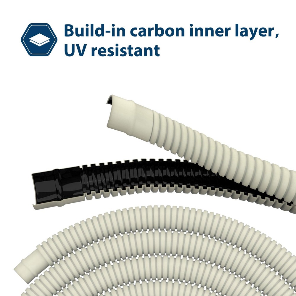 Universal Flexible Air Conditioner Water Drain Hose(26ft) Feature Build-in carbon inner layer in order to improving UV resistant performance The inner layer is smooth,Helps reduce clogging due to sludge, scum build-up Fit most Ductless Mini Split Air Conditioner and Heat Pump Systems built-in connection socket at each 39 inch Specification Size:5/8 ID,26FT Construction:Double-layer structure,made of durable PE material with inner carbon black Main Design:Design to drain condensate from air-conditioned machines to the outside Notice:cannot be used under high pressure Main Design-Design to drain condensate from air-conditioned machines to the outside.5/8 ID,26FT Drain Hose Fit most Ductless Mini Split Air Conditioner and Heat Pump Systems. Indoor & Outdoor Use-Double-layer structure,made of durable PE material with inner carbon black,UV resistant, highly flexible, anti-corrosion,suitable for indoor and outdoor use Prevent Clogging-the inner layer of carbon black,offers protection from the sun's harmful rays,Effectively prevent water pipe burst.The inner layer is smooth,Helps reduce clogging due to sludge, scum build-up Easy to install-The 26 ft(8m) long pipe has an interface every 39in(1m),(16 mm or 18 mm connections is shared) and can be connected and cropped on demand. Widely Application-5/8 ID,26FT Drain Hose Fit most Ductless Mini Split Air Conditioner and Heat Pump Systems.