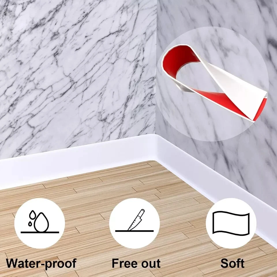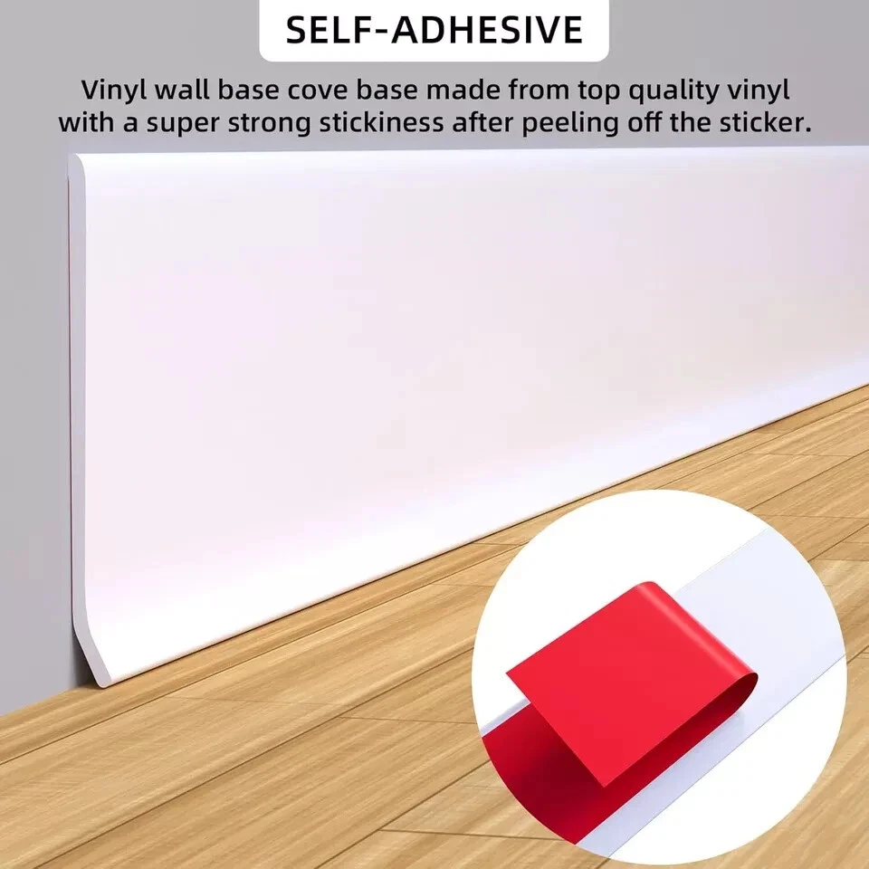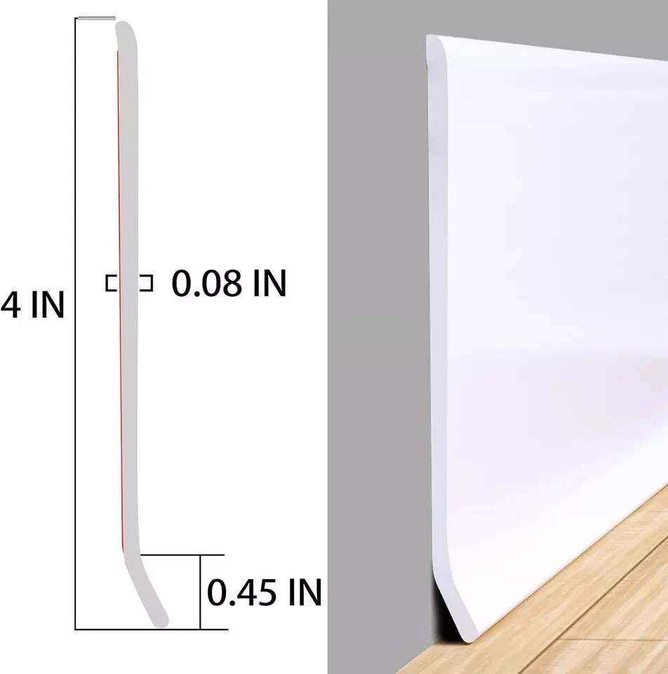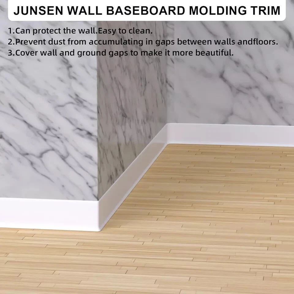 Manufacturer: Junsen Item Weight: 6.07 pounds Package Dimensions: 7.64 x 7.64 x 4.53 inches Size: 4 IN * 20 FT Color: White Material: Rubber Installation Method: self-_adhesive Batteries Included?: No Batteries Required?: No 【Junsen Baseboard Trim】: We have three colors (white, black, gray) and three sizes (width: 4IN * 20FT, width: 4IN * 40FT, width: 4IN * 60FT) for your choice, Junsen vinyl baseboard trim tough against scuffs, durable, and residue-free All flexible molding decorative self-adhesive kits come with easy-to-peel double-sided tape that securely attaches to surfaces and can be easily removed. 【Material 】: Wall baseboard base made of high density rubber, peel and stick off the wall baseboard molding trim sticker, soft, self-adhesive and cuttable, suitable for all kinds of different scene gaps to decorate your own home. 【Flexible and Durable】: Flexible wall cove base with better durable elasticity and flexibility. rubber baseboard trim can be used as wall molding trim edge protection for covering cracks and damaged corners, floors, etc. especially suitable for kitchens, bathrooms, house wall gap protection is a must for families. 【Easy to Use】: Before installation, please be sure to clean the dust and oil stains on the surface of the object to be adhered to ensure that the object is dry. if the temperature is 32°-64.4°F (0° - 18°C) before installation, heat the mounting surface and adhesive with a hair dryer for better adhesion, tear off the sticker and press to the surface within minutes wait for 24 hours before it can be used normally。