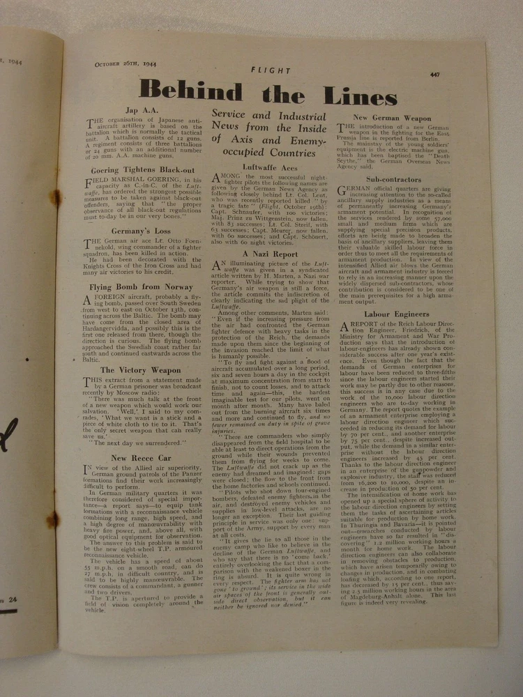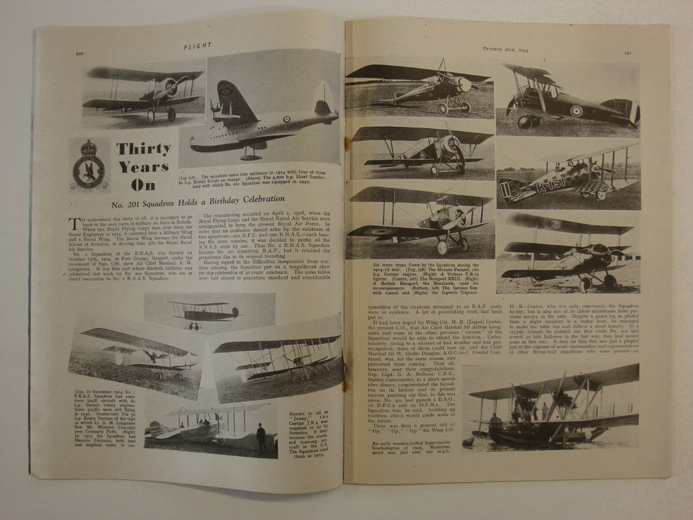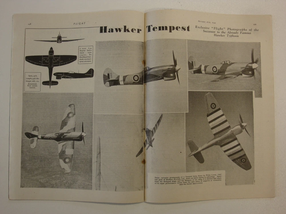 Please read item description FLIGHT AND AIRCRAFT ENGINEER (October 26 th 1944) The magazine published for the serious aero enthusiast and the official organ of the Royal Aero Club. Packed with technical and specification data and well illustrated with photographs and drawings throughout. Front cover: Advert: Lightweight Tapered Roller Bearings In this issue: The Outlook (With air help and without, British air policy, The college of aeronautics plus a photograph of the King and Field Marshal Sir Bernard Montgomery on a visit to Holland) War In The Air (Sea-air operations in the Pacific, Death of Rommel – and others, Effect of air power in the West, Carriers in the Aegean, , The Philippines invaded. Includes photographs of a Hawker Tempest on a Belgian airfield, Japanese phosphorous bombs exploding over American Liberators, Parafrag bombs landing amongst Japanese aircraft and a camera being fitted to a reconnaissance Mosquito in Burma) Here And There (Closer co-operation, “Squirts” going strong, Finnish air mail hopes, Eire night flier, Pan-American giant, Speeding front-line supplies, Swedish-Finnish air traffic, Back to “Fighter Command”, To speak for South Africa plus a photograph of a Sikorsky helicopter carrying out air-sea-rescue trials) Thirty Years On – No 201 Squadron Holds A Birthday Celebration (A 3-page historical review of the first Royal Naval Air Service Squadron. Well illustrated with photographs of the Bristol Scout, the Short Sunderland, the Avro 504K, the Henry Farman, the Maurice Farman, the Curtiss J.N.4, the Morane Parasol, a Vickers F.B.19, the Nieuport, the Nieuhawk, the Sopwith Camel, the Sopwith Triplane, a Supermarine Southampton [x2] and the Saro London) Railway Air Services – Proposed Scheme Put Forward By The Combined Railway Companies (Aircraft and time-table. A 2-page article with a revolutionary proposition for travel within Europe) Air Power In The Battle Of France – Farewell Summary By Air Chief Marshal Sir T. Leigh-Mallory (Great days, Supply and evacuation) Behind The Lines – Service And Industrial News From The Inside Of Axis And Enemy-Occupied Countries (Jap A.A., Goering tightens black-out, Germany’s loss, Flying bomb from Norway, The victory weapon, New Recce car, Luftwaffe Aces, A Nazi report, New German weapon, Sub-contractors, Labour engineers) Hawker Tempest (A double-page photo-montage of the aircraft in flight together with a 3-view silhouette drawing) White Paper On Civil Aviation (A 2-page review and discussion concerning the proposed government policy on post war aviation. General principles for post-war, New air convention, , The international machinery, Questions and answers, Never discussed, Making no promises) Aircraft In Flying Attitudes (A one-page article illustrating an aircraft in silhouette form together with a small photograph of the aircraft and a descriptive text. The aircraft in this study is the Vultee Valiant [BT-13] trainer and is compared against the North American Harvard) Tomorrow’s Light Aircraft – II (Tail-down visibility, Reflections and focus, Comfort or people?, Flying instruments, Starting up) Service Aviation – Royal Air Force And Fleet Air Arm News And Announcements (Includes excellent photographs of pilots and their Tempests on a Belgian airfield, a Tetrarch light tank being driven off a Hamilcar glider, An RAF Liberator in India and a 12,000lb bomb being loaded into a Lancaster III) plus more including adverts for Sperry Aircraft Precision Instruments, Desoutter, the Lockheed Constellation, Blackburn Cirrus Engines, the Fairey Barracuda, Armstrong Siddeley Cheetah Engines, the DH Dragon Rapide, Gloster Aircraft, Schrader Airline Equipment, the General Aircraft Hamilcar, Airspeed, Black and Decker Portable Electric Tools and the Bristol Beaufighter The front cover page shows minor wear to the edges and the staples are rusted, which is typical of the low grade material used during and immediately after the war, however they remain sound and hold all pages securely. All pages are present and free from tears and significant marks although the pages do display some age discolouration as is typically found on newsprint of this age. This magazine is in very good overall condition considering its age. IMPORTANT NOTICE FOR MULTIPLE WINNING BIDS If you are planning further bids I allow payment to be held for up to 22 days. Should you win more than one item please request a combined invoice BEFORE payment in order that the most economical postage can be offered.