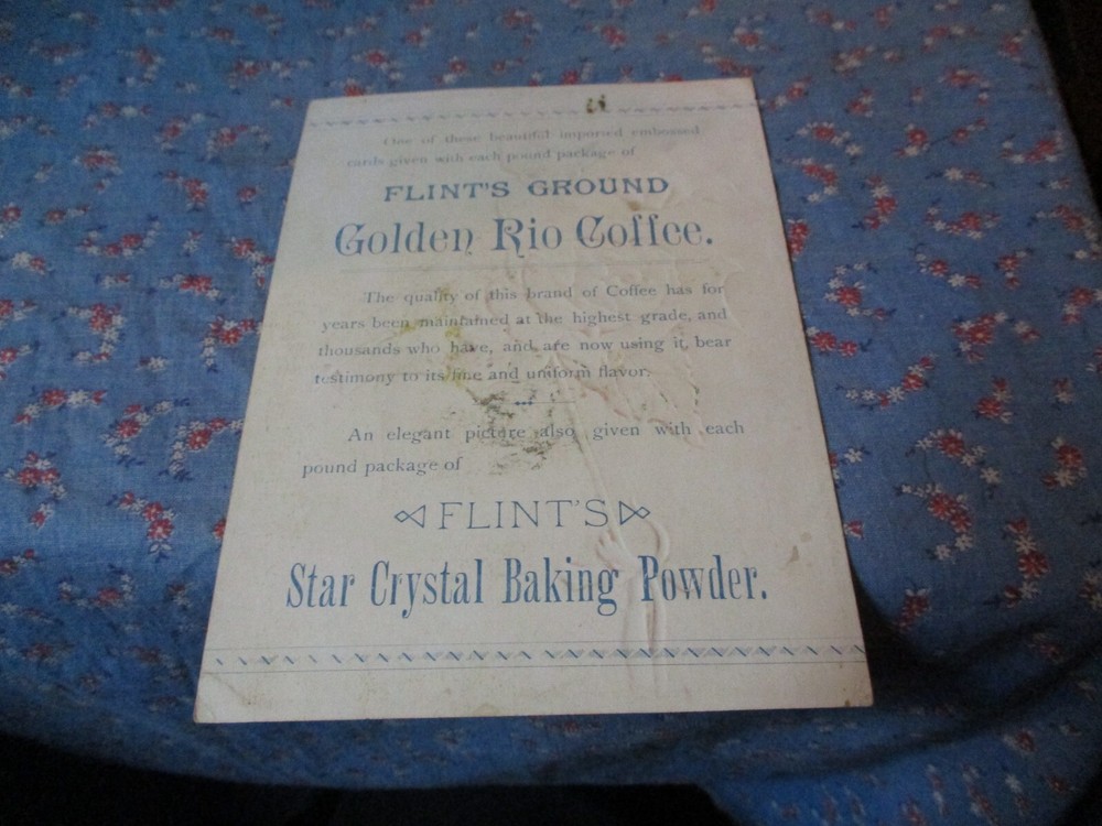Size:6 3/8 x 4 5/8 InchesSeller Notes:“Please look over the photos provided for more information about this item.”Type of Advertising:Trade CardColor:Multi-colorBrand:Flint's Ground Golden Rio Coffee Star Crystal Baking Powder
