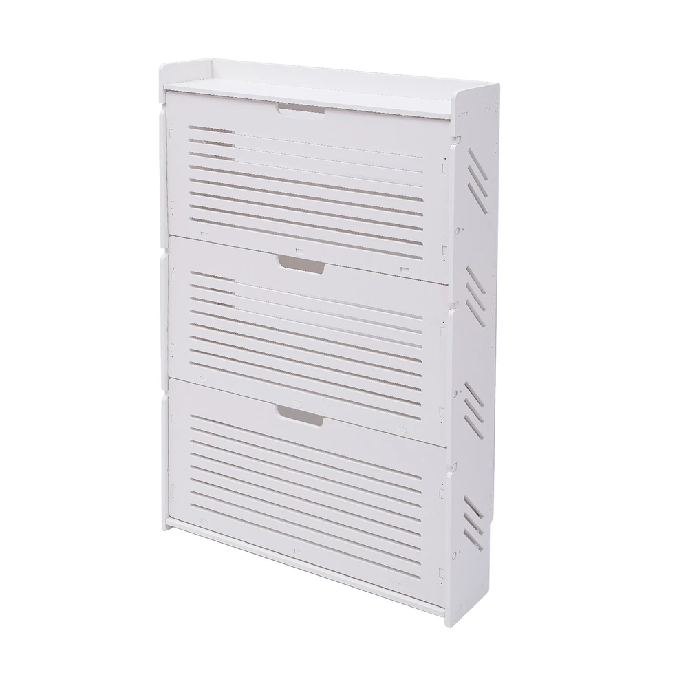 Description Are You Still Worried About Having Too Many Shoes Lying on the Mat at Your Entrance? This Flip-up White Shoe Cabinet Is Just What You Need! It Is Made up of Three Shoe Cupboard Tiers and a Shelf Layer, Which Is Enough for Your Storage Needs. You Can Keep Your Keys and Bags Handy, so You Can Get out More Easily and Quickly. This Shoe Cabinet Is a Good Choice for the Hallway, Living Room, and Bedroom. Application It Is Suitable to Be Placed at the Door, Living Room, or Bedroom Used to Place Slippers, Casual Shoes, High Heels, Boots, Leather Shoes, and Other Shoes, As Well As some Daily Necessities Such As Keys, Books, and Umbrellas. It Can Be Used As a Shoe Cabinet, Bookshelf, and Storage Rack. Specification Color: White Installation Type: Freestanding Style: Modern Shape: Rectangular Material: Pvc Number of Tiers: 3 Load Capacity per Tier: 5kg/11.02lbs Gross Weight: 8.3kg/18.3lbs Net Weight: 8kg/17.64lbs Plate Thickness: 10mm/0.39inch Product Size: 70*17*109cm/27.56*6.69*42.91inch Package Size: 116*37*9cm/45.67*14.57*3.54inch Package Included 1 * Shoe Cabinet 1 Pair * Gloves 1 * Mobile Phone Holder 2 * Fixing Backing 1 * English Manual Other Accessories for Installation Key Features High-quality Material: the Shoe Cabinet Is Made of 0.39inch Thick Pvc Plates, Which Are Tough and Not Easily Deformed. It Has a Good Weight-bearing Capacity and Longer Service Life. Great Home Decor : in Classic White with a Simple Design, This Shoe Storage Cabinet Provides a Sense of Modernization, Which Also Enriches Your Entire Entryway and Gives Your House a New Look, Showing off Your Lifestyle. Large Capacity : the Shoe Storage Cabinet Has 3 Tiers and Can Store up to 9 Pairs of Shoes (the Number Depends on the Height of the Shoes) to Meet Your Storage Needs. Humanized Design: Its Surface Is Smooth Without Burrs, and It Will Not Scratch the Hand. the Corners of the Frame Are Designed with Rounded Corners, so You Will Not Be Injured During Use. Relieving Your Fatigue: This Beautiful Shoe Cabinet Guards the Door Every Day and Welcomes You Home. It Allows You to Put Away Your Exhaustion As Soon As You Get Home and Start Enjoying Leisurely Home Life by Taking off Your Shoes. Organized Lifestyle: This Shoe Cabinet Cleverly Integrates Shoe Storage into Life, Placing It at the Doorway to Store Your Messy Shoes, Making It Pleasing to the Eyes As Soon As You Open the Door, Bringing You an Organized Lifestyle. Strong Load-bearing: Each Layer of This Shoe Storage Cabinet Can Bear About 11.02lbs, Even If You Put Heavier Leather Shoes or Boots on It, You Can Use It with Peace of Mind. Tipping Bucket Design: the Entire Shoe Cabinet Features a Tipping Bucket Design for Easy Opening and Closing, Making It Very Easy to Use. It Also Keeps Dust out of the Shoe Cupboard. Space Saving: with a Small Footprint of 27.56*6.69inch at the Bottom, It Can Be Placed in Every Corner of the Home. by Using the Doorway Space Wisely, Even a Small Entryway Can Be Turned into a Storage Treasure Trove. Easy to Clean: Its Pvc Material Makes It Very Easy to Clean, All You Need to Do Is Wipe It down Regularly with a Dry Cloth or Wash Away Any Serious Stains with Soapy Water. Easy to Assemble: with All the Accessories and Instructions Included in the Package, It Is Easy and Quick to Assemble the Cabinet Without Much Effort. Easy to Clean: Its Pvc Material Makes It Very Easy to Clean, All You Need to Do Is Wipe It down Regularly with a Dry Cloth or Wash Away Any Serious Stains with Soapy Water. Easy to Assemble: with All the Accessories and Instructions Included in the Package, It Is Easy and Quick to Assemble the Shoe Cabinet Without Much Effort. Details Top Platform: the Top Platform Is Spacious Enough to Hold Keys, Photo Frames, Etc., Making It Very Practical. and with an Anti-drop Fence on the Platform, Items Will Not Fall Easily. Full Plate Layer: the Layer Rack Is Designed with a Full Plate, Which Can Effectively Prevent the Ash on the Bottom of the Shoes from Falling Onto the Shoes on the Lower Layer. at the Same Time, the Full Plate Layer Shelf to Place Shoes More Stable, and Even High Heels Will Not Fall. Pre-drilled Holes: There Are Two Pre-drilled Holes at the Top of the Back of the Shoe Cabinet to Allow You to Fix the Cabinet to the Wall and Prevent It from Collapsing. Louvered Doors: Each Tier of the Shoe Cabinet Is Designed with Louver Doors for Breathability, Which Accelerates the Air Circulation in the Cabinet and Inhibits the Growth of Bacteria. Concealed Handle: the Concealed Pull Handle Is Semi-circular. the Curved Shape Is Not Only Subtle and Beautiful but Also Makes It Easy to Open and Close the Shoe Cabinet Without Hurting Your Hands. Reserved Skirting: the Skirting at the Bottom of the Back of the Shoe Cabinet Keeps the Cabinet Close to the Wall and Is Not Easily Shaken. Gloves: You Can Wear the Gloves Included in the Package for Installation to Prevent Abrasion of Your Hands. Notes Please Allow the Slight Color Difference Caused by the Shooting Light and 1-3cm Error Due to Manual Measurement, and Make Sure You Do Not Mind Before Ordering. On Jul 3, 2025 at 18:43:12 PDT, seller added the following information: