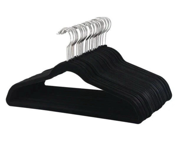The product is a set of 50 black flocked hangers, suitable for various items such as bags, coats, dresses, suits, ties, belts, scarves, and skirts. Made of velvet, plastic, and metal, these hangers are 16 inches long and feature a solid black color with a metallic finish. They are designed for space-saving storage and have a non-slip, heavy-duty construction with added grip for holding items securely in place. The traditional hanger style and original design make them a practical and stylish addition to any closet or dressing area.
