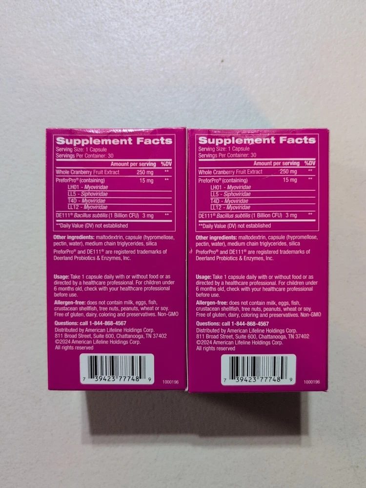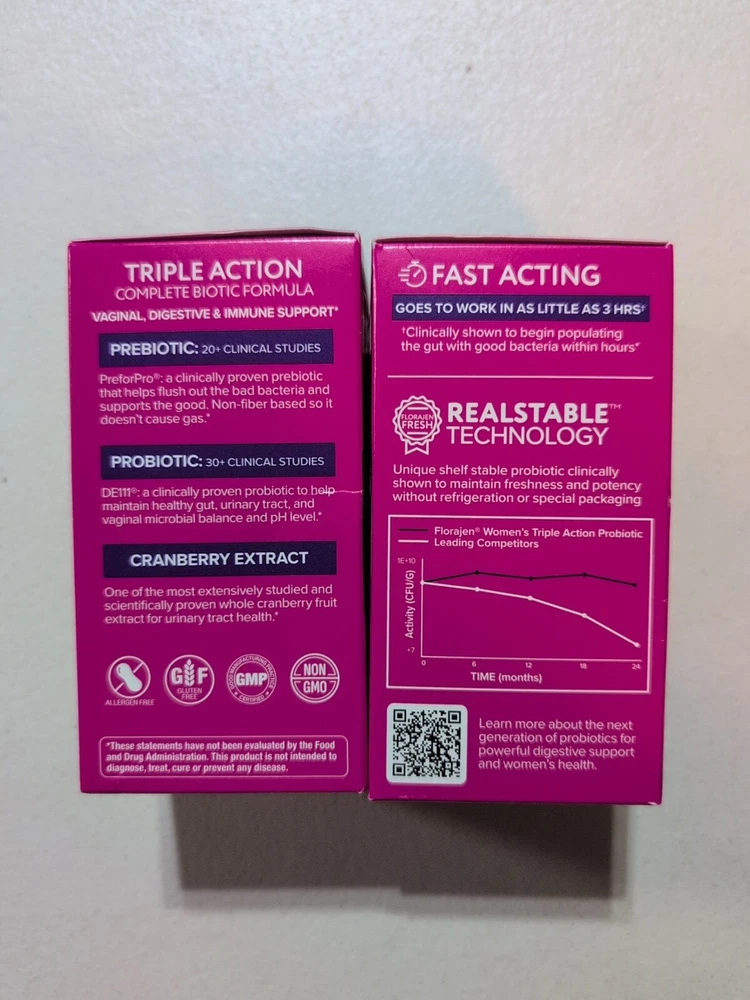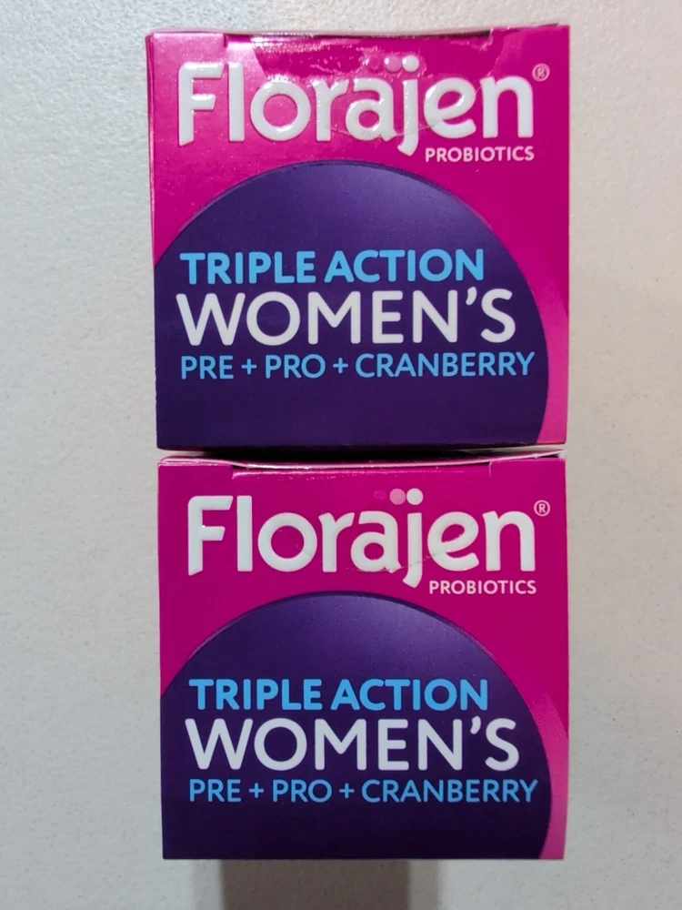 Florajen Triple Action Women's Prebiotic + Probiotic Cranberry 60 Caps BB 4/2026. You will receive two brand new factory sealed boxes each with 30 capsules.