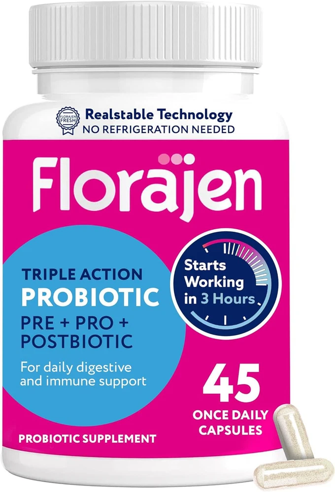 Lowest price online, guaranteed, plus massive volume discounts available! Great chance to save. About this item TRIPLE ACTION: A complete triple action formula combines the next generation PREBIOTIC + PROBIOITIC + POSTBIOTIC strains into one easy to swallow daily capsule for powerful digestive and immune support. Complete Wellness Digestion Support Capsules, 45 Count FAST ACTING: New innovative fast acting probiotic that goes to work in as little as 3 hours. Clinically shown to survive the stomach acid and begin populating the gut with good bacteria within hours. CLINICALLY STUDIED STRAINS: Complete biotic formula with PREBIOTIC + PROBIOTIC + POSTBIOTIC strains clinically studied and clinically shown to naturally help promote gut health and boost your immune system. Formulated with a unique non-fiber prebiotic that doesn't cause any gas. DIGESTIVE & IMMUNE SUPPORT: Extra strength 3-in1 formula delivering powerful digestive and immune system support. Works with your body to naturally help promote gut health and boost your immune system. EXPERTLY FORMULATED: With over 30 years of trusted quality, Florajens new Triple Action Probiotic is expertly formulated and guaranteed to be gluten free, vegan, non-GMO, dairy free, and soy free. Capsule can be opened, and powder blend mixed in your favorite juice or water.