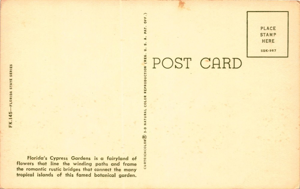 The postcard features an image of Florida's Cypress Gardens during blossom time. Cypress Gardens is a botanical garden in Florida known for its beautiful flowers and tropical landscapes. The garden is famous for its winding paths, romantic rustic bridges, and numerous tropical islands. The postcard is a Curteichcolor 3-D natural color reproduction, part of the Florida State Series.