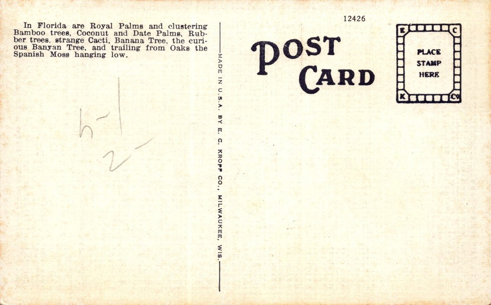 MAKE AN OFFER. THE MORE YOU BUY THE BETTER DEAL I WILL ACCEPT This postcard showcases a beautiful banana tree bearing fruit in Florida. The text on the postcard mentions various flora found in Florida, including Royal Palms, Bamboo trees, Coconut and Date Palms, Rubber trees, Cacti, the Banyan Tree, and Spanish Moss hanging from Oaks.