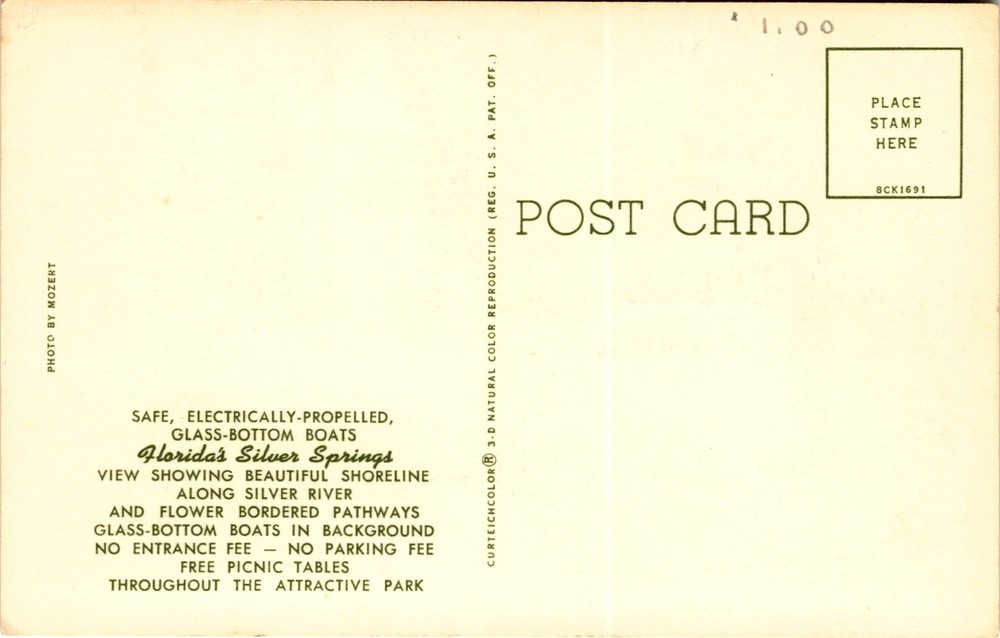 MAKE AN OFFER. THE MORE YOU BUY THE BETTER DEAL I WILL ACCEPT This postcard advertises Florida's Silver Springs, known for its safe, electrically-propelled, glass-bottom boats. The image on the postcard shows the beautiful shoreline along the Silver River with flower-bordered pathways and glass-bottom boats in the background. Visitors to Silver Springs can enjoy free entrance and parking, as well as picnic tables throughout the park.