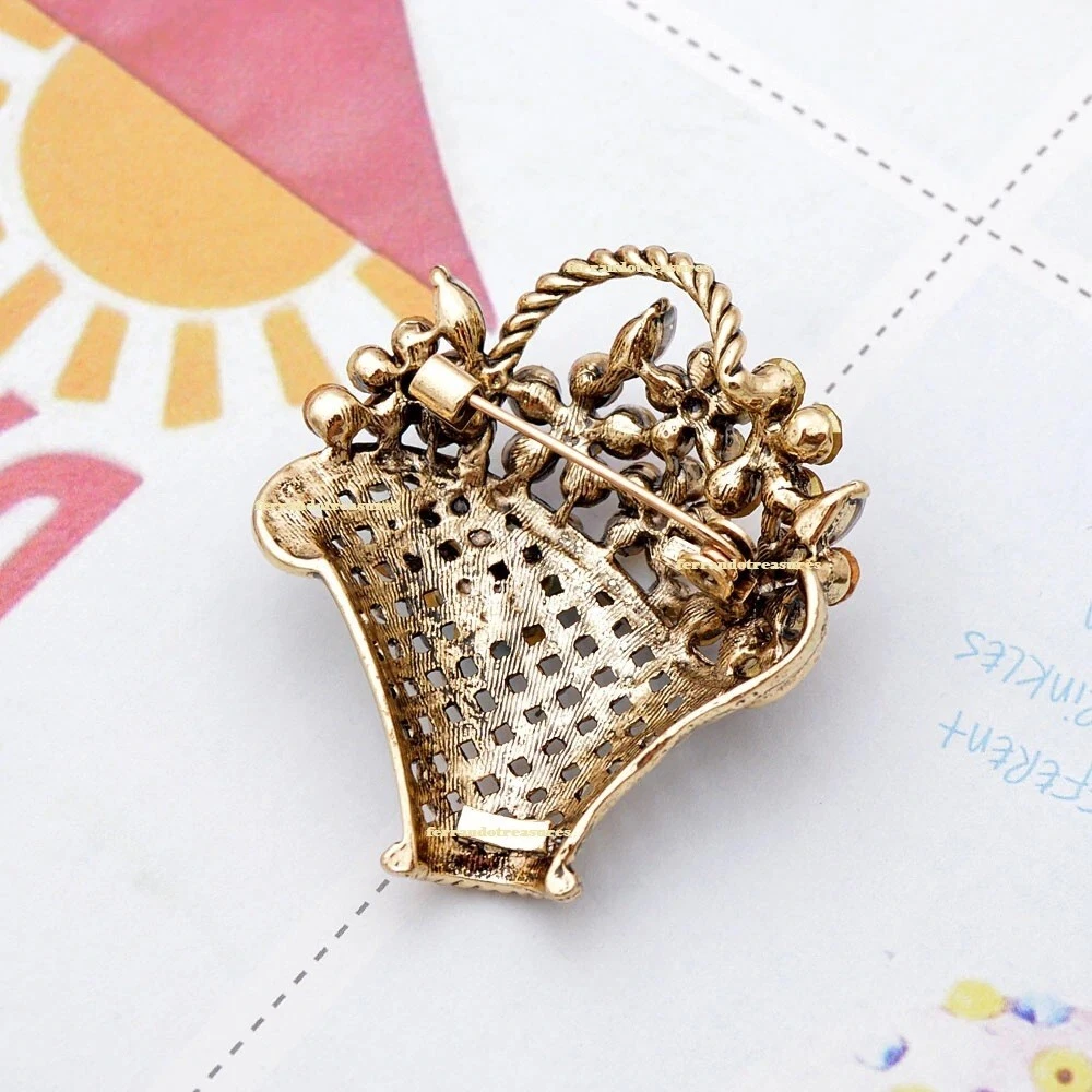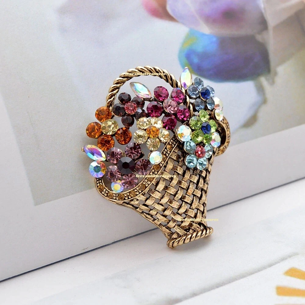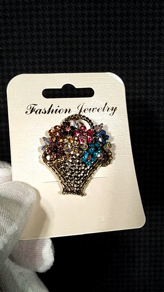 Flower Basket Crystal Rhinestone Vintage Style Brooch Pin and Gold Bag Beautifully Detailed Crystal Rhinestone Flowers with many colors (flower patterns may differ slightly) Brooch is 2 " x 1 3/4 " Free Gold Foil and Cloth Bag Come see all of our other Brooches, Bracelets, Earrings, Necklaces, Pendants, , Rings, and Glow in the Dark jewelry today.
