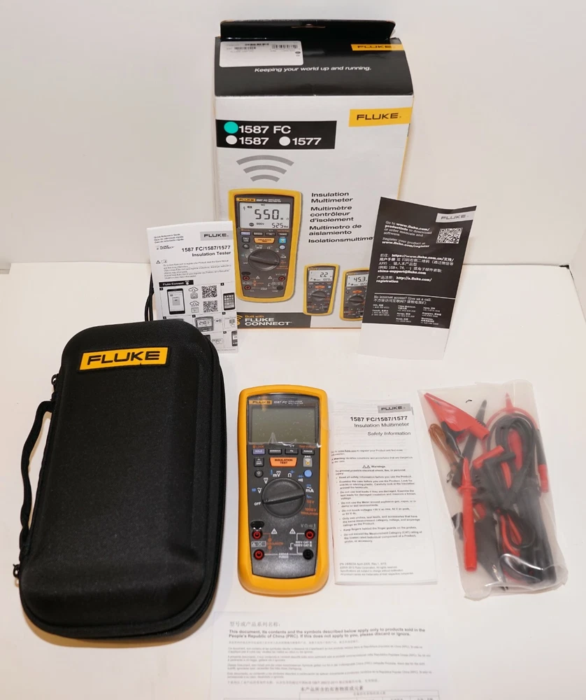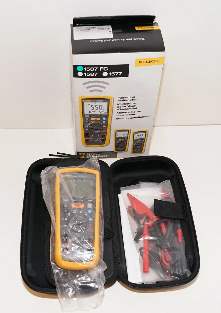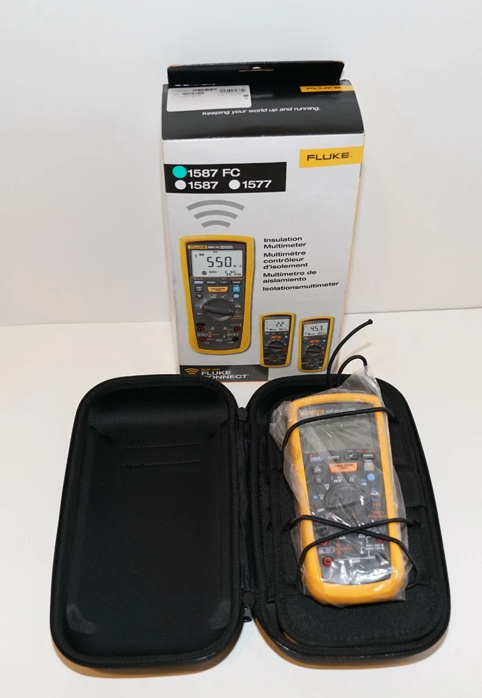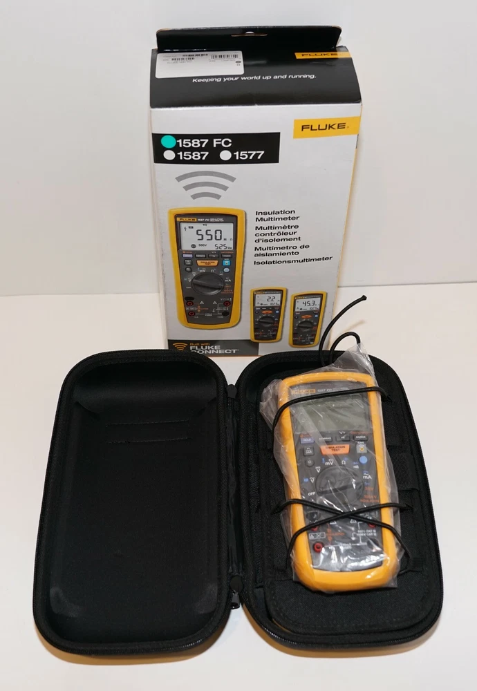 Never used COMES WITH LEADS AND CASE. The Fluke 1587 FC 2 in 1 Handheld Digital Insulation Multimeter is a versatile device designed for professional use. It features a CAT IV rating, auto-ranging capability, and various test/measurement functions including frequency, temperature, AC/DC voltage, capacitance, continuity, and more. With a maximum input voltage of 1000V, this multimeter also offers features like auto power off, a backlight display, and fused current terminals for added convenience.