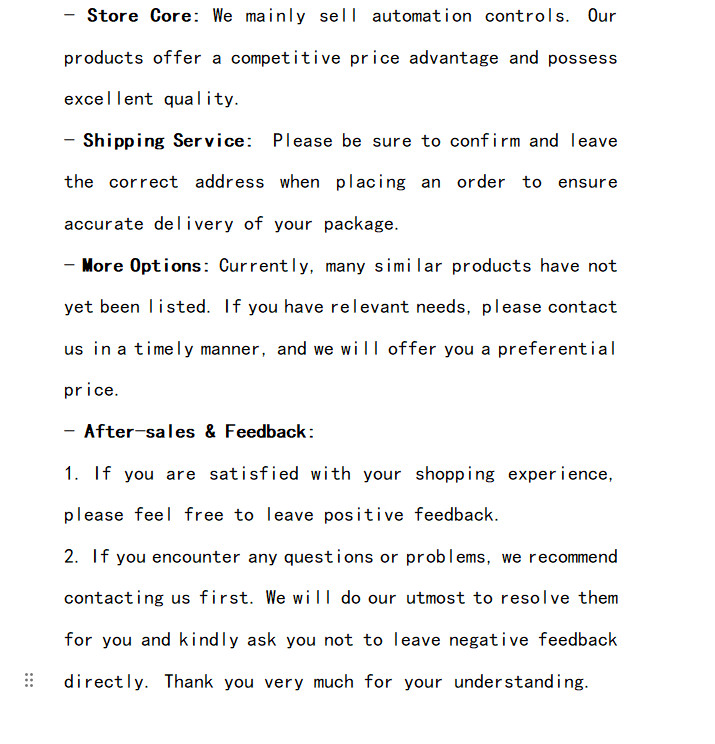 Sell a variety of PLC series Product Description Welcome to visit my shop My shop sells:Allen-Bradley, PRO-FACE, Keithley, Siemens, beckhoff, wago, Cisco, Huawei, H3C, Omron, Mitsubishi Yaskawa, FANUC, EMERSON, B&R, Schneider If you need other models, you can leave a message to me at the store, and our customer service team will reply you within 2 hours Payment Policy Shipping Policy warranty Payment Policy We support pay, credit card, bank card and other payments Shipping Policy Dear buyer hello As long as all products purchased in our store will be quickly delivered by UPS/DHL/UPS warranty If it is a brand-new sealed product warranty for one year, if it is a used product warranty for 6 months Copyright © 2023 Dianxiaomi