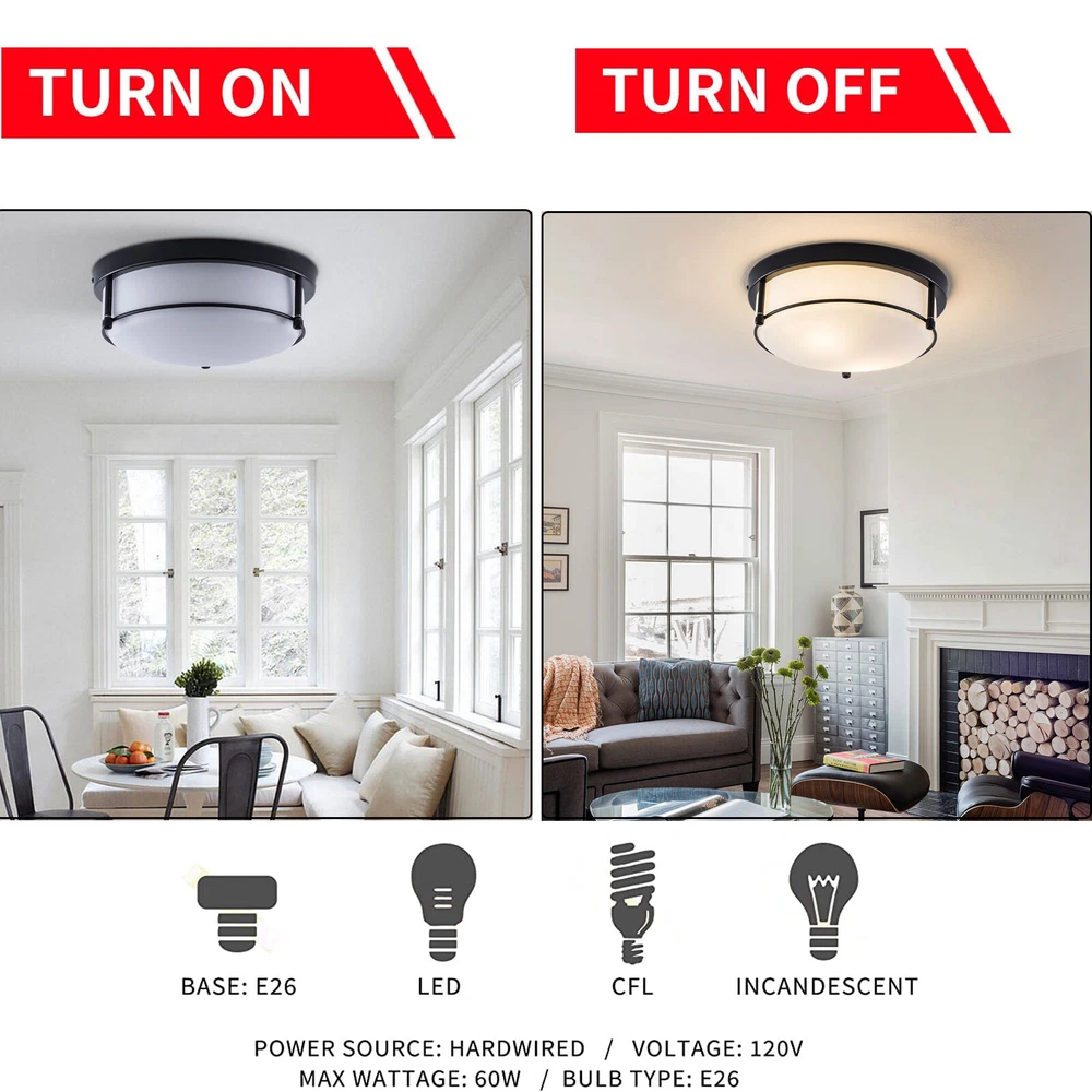 About this item MODERN DESIGN: The flush mount features metal frame in oil rubbed bronze finish, seeded glass lamp shade, with attractive farmhouse style, beautiful and durable. WIDELY APPLICATION: The modern style design of the lighting fixtures ceiling can integrate all decorations. The ceiling lamp is perfect for kitchen, bathroom, bedroom, living room, dining room, study room, porch and entryway, etc. BULB REQUIREMENTS: The bedroom lights for ceiling has two built-in E26 medium bulb bases, which support any LED/CFL/Edison bulbs with E26 bases, (Max 40W). When you use dimmer and dimmable bulb, the kitchen light fixtures ceiling can be dimmable. (Dimmers and bulbs are not included). EASY INSTALLATION: Dimension: 11.81''L x 11.81''W x 5.9''H. Hardwired, all installation acces Flush Mount Pendant Chandelier LED Ceiling Lighting Fixture Living Room Bedroom Welcome to my store Package Content 1 x Ceiling Light 1 x Instruction manual 1 x Hardware bag About this item MODERN DESIGN : The flush mount features metal frame in oil rubbed bronze finish, seeded glass lamp shade, with attractive farmhouse style, beautiful and durable. WIDELY APPLICATION: The modern style design of the lighting fixtures ceiling can integrate all decorations. The ceiling lamp is perfect for kitchen, bathroom, bedroom, living room, dining room, study room, porch and entryway, etc. BULB REQUIREMENTS: The bedroom lights for ceiling has two built-in E26 medium bulb bases, which support any LED/CFL/Edison bulbs with E26 bases, (Max 40W). When you use dimmer and dimmable bulb, the kitchen light fixtures ceiling can be dimmable. (Dimmers and bulbs are not included). EASY INSTALLATION: Dimension: 11.81''L x 11.81''W x 5.9''H. Hardwired, all installation accessories and installation instructions are included for quick and easy installation BULB REQUIREMENTS: 2*E26 Bulbs: No includes 2*E26 bulbs . The modern ceiling light allows you to change any color temperature bulb to get different lighting effects. Compatible with Led/Edison/Incandescent bulbs (110V-120V, 40W Max). Flat/ Ceiling Available & Wide Application: The hallway light fixture is compatible with flat/solp ceilings. This modern flush mount light fixtures is the perfect option for brightening up indoor areas like the kitchen island, dining room, living room, bedroom, bathroom, girls room, restaurant, entryway, corridor, hallway, foyer and etc. Voltage: 110-120V,It can be dimmable when you used with a dimmable bulb and compatible dimmer switch. Application Widely:used in your indoor space, such as bedroom, closet, hallway, foyer, dining room, living room, entryway, kitchen, make up room, kid room, bar, aisle, hotel, restaurant, office, parlor, loft. Easy to Assemble: Installation instruction and all mounting hardware are in the package for quick and easy installation. Installation Instruction: ①For your safety, Please turn off the power before installation ② Please check parts against the packing list to see if the accessories are available. ③We provide install instructions for you. please referred to install manual or have a professional electrician. If need any help, please contact us. Payment Delivery details Terms of sales About us Contact us Payment We accept ebay payment 。 Fees such as import duties, taxes are not included in the item price or shipping costs. These charges are the buyer's responsibility. Delivery details Shipping: 2-9 working days to: USA Terms of sales We maintain high standards of excellence and strive for hundred percent customer satisfaction. Feedback is very important to us. We hope that you contact us immediately before you give neutral or negative feedback, so that we can address your concerns. It is impossible to address issues if we do not know about them! About us Your satis faction is our ultimate goal. We work hard to earn your trust and future business. Our certified technicians have tested each item before shipping. The unit comes with 1 year limited warranty on all manufacturing defects. a) If you receive a defective item, you may return it or ask for a discount. Please contact us within 14 days after you receive the package. b) What you returned must be intact and in its original packaging as re? u. Customer is responsible for shipping costs of the returned item. c) We will cover the cost of shipping back t with the shipping rate indicated in the registration page. We will send you a new unit or refund the full payment you paid. Thank you. Contact us Business Hour Business Hour: Monday To Friday: 8:30 AM to 5:00 PM (Beijing China time) Due to time zones, our reply to your questions may not be immediately. But within above working time, we will reply your email within 24 hours. If it's non-workdays, please kindly be patient and wait till Monday. Please contact us with ebay message. Please feel free to contact us if you have any questions. Monday To Friday: 8:30 AM to 5:00 PM (Beijing China time) Due to time zones, our reply to your questions may not be immediately. But within above working time, we will reply your email within 24 hours. If it's non-workdays, please kindly be patient and wait till Monday. Please contact us with ebay message. Please feel free to contact us if you have any questions. On Nov 11, 2024 at 23:49:56 PST, seller added the following information: