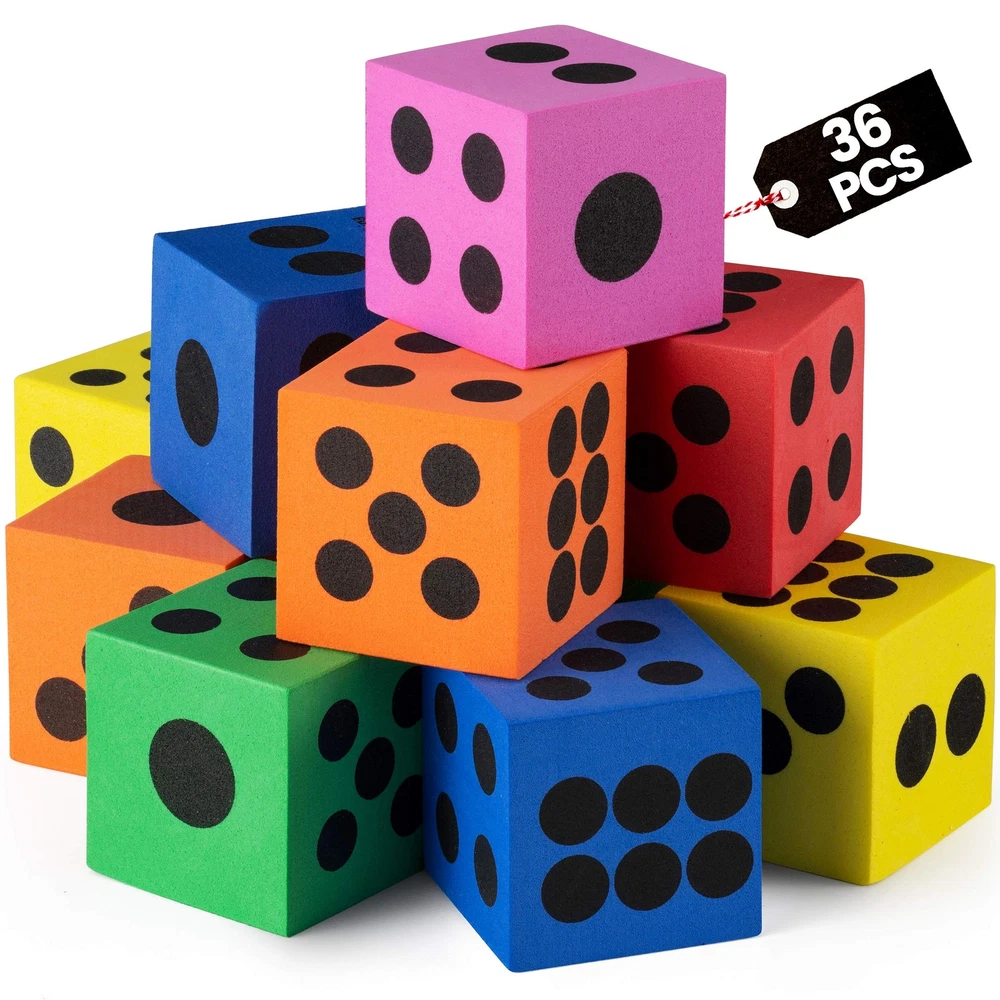 Large 1.5 Inch Foam Dice - Pack of 36 Each order of Foam Dice in bulk includes 36 - 1.5-inch foam dice in 6 different colors. You will get 6 foam dice of each color including; green, orange, blue, red, purple, and pink. They are wonderful for so many activities and they are bigger than regular dice so they will not get lost or easily roll under stuff! They are fun to use, easy for to pick up, and very durable even though they are made of soft foam. They are numbered from 1 to 6 with black dots on each side of the dice. love using them because they are wonderful for so many activities. Foam Dice Make Learning Math Easy & Fun! These foam dice are perfect for the classroom and home schooling with Preschool, Kindergarten and School Students. Our big foam dice will help learn to count, recognize numbers, use ten frames, color sorting, math games, STEM learning and more! If you're looking for bulk high-quality foam dice for home or your classroom, then this is the best deal for you. KEY FEATURES: Bulk Pack of 36 Foam Dice 6 Colors: Green, Orange, Blue, Red, Purple, and Pink Oversized - 1.5” Foam Dice Perfect for Learning and Education Soft & Durable High Quality EVA Foam Material Ages 3+ Why Wait!? Click "Add to Cart" to order your foam dice in bulk today! BULK PACK OF 36 OVERSIZED FOAM DICE: This bulk pack of 36 foam dice is large, colorful and fun! With each order you will get 36 - 1.5-inch foam dice. Includes 6 different colors; green, orange, blue, red, purple, and pink - 6 of each color. They are wonderful for so many activities and they are bigger than regular dice so they will not get lost or easily roll under stuff 1.5 INCHES. QUIET & FUN TO PLAY: Larger than standard dice, our Foam Dice Set measures 1.5 inches. They are fun to use, easy for to pick up, and very durable even though they are made of soft foam. They are numbered from 1 to 6 with black dots on each side of the dice. love using them because they are wonderful for so many activities PERFECT FOR CLASSROOMS & HOME SCHOOLING: Teachers and parents love them because they're so quiet when you roll them! Use them in the classroom or for home schooling with Preschool, Kindergarten and School Students. These big foam dice will help learn to count, recognize numbers, use ten frames, color sorting, math games, STEM learning and more HIGH QUALITY. BEST VALUE: Our foam dice are made from sturdy EVA foam that's safe for and adults to play with. If you're looking for bulk high-quality foam dice for home or your classroom, then this is the best deal for you. Perfect for learning and education toys, party supplies, goodie bags, carnival prizes, casino theme birthday parties, and keeping your entertained 100% SATISFACTION GUARANTEED: When shopping for big dice or foam dice for the classroom with you can be rest assured that if for whatever reason you are not satisfied, we'll take your product back, no questions asked. We are here to make you 100% happy, 100% of the time. Satisfaction guaranteed