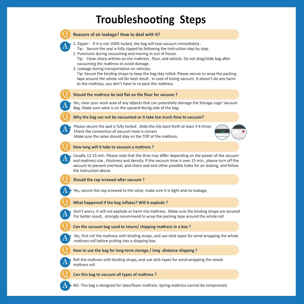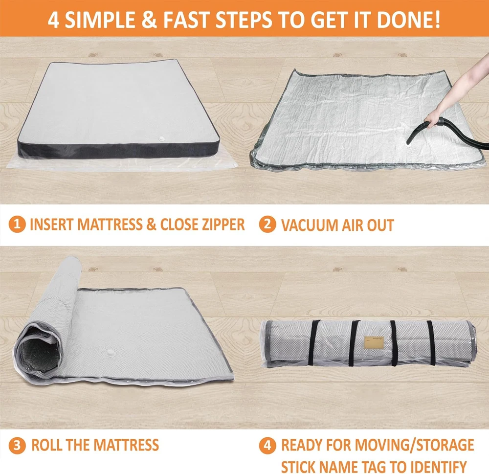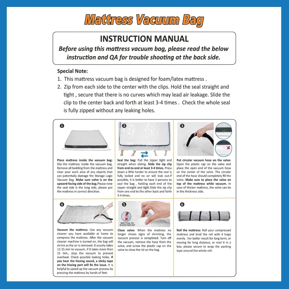 PA+PE Looking for vacuum bag for foam mattress? Our mattress vacuum bag compresses the mattress by 80% and fits in a car/SUV. With our mattress vacuum seal technology, you can now carry the mattress by yourself. It is an easy and fast way of moving mattress. Airtight Material: Our vacuum seal mattress bag is made with PA&PE to ensure no leaks and punctures. Our double seal zip keeps the mattress compressed. Your mattress will be protected from air, dirt, dust. Right Sized Bag: We make sure that you have enough space to and compress your mattress. The mattress bag can be used repeatedly with proper care. 4 Simple Steps to Save Space & Money: just place your mattress inside mattress compression bag, slide the zip slider from end-to-end at least 2 times, put circular vacuum hose on the valve, vacuum and roll, vacuum the mattress and roll the mattress. Please kindly pay attention not to use sharp object to open the box and not drag the bag after vacuuming the mattress. 4 Straps & 5 Name Tag Sticker Feature: 1 Queen/Full/Full-XL sized mattress vacuum bag, 4 Adjustable binding straps and 5 Name Tag Stickers are included in the package. You can write your name on the name tag sticker and paste it on the mattress to help you identify the right mattress. Product Description Looking for that convenient way to move/store your mattress? Look no further! Use our mattress vacuum bag (name tag sticker included) to compress down your mattress by 80%. Our mattress vacuum bag not only helps you to save extra storage space but also keeps your mattress well protected from dust, dirt. You can use our mattress vacuum bag for: Foam Mattress Latex Mattress Hybrid Mattress Bean Bag... From house move to mattress storage/return, our mattress vacuum seal bag got you covered! Product Feature Highlights Unique Dual Color Double Zip Seal Our unique dual color double-zip design has black lines on one side and white lines on the other side. When the zipper is fully sealed, the white lines are clearly inserted into the black lines. The dual color helps you to know if the seal is complete in a visual-friendly way. Sturdy Stay-on Clip Our extra-large stay-on slip ensures the zip slide smooth and fast. Please slide the zipper from end to end at least 2 times to make sure the zip is fully sealed. Identification Name Tag Stickers Write your name on the name tags and stick them on your rolled mattress to quickly pick out your own mattress. Each package includes 5 Name tag stickers. Product Usage Instruction Insert the Mattress into the Vacuum Bag: Place the mattress inside the vacuum bag after removing all bedding. Clear your workspace of any objects that could damage the bag. Ensure the valve is positioned on the top side of the bag. Seal the Bag: Firmly and evenly pull the zipper as you slide it closed. Use the zip clip to secure it from end to end at least 3-4 times. Apply a bit more pressure to make sure the seal is tight and airtight. Hold each end of the zipper straight and tight while sliding the clip back and forth 3-4 times. Attach the Vacuum Hose to the Valve: Remove the plastic cap from the valve and fit the open end of the vacuum hose into the center of the valve, ensuring the circular end completely fills it. Position the valve on top of the mattress while vacuuming; if the mattress is thick, the valve can be placed on the thicker side. Vacuum the Mattress: Use any available vacuum cleaner to compress the mattress. Once turned on, the bag will begin to shrink as air is removed, typically taking 12-15 minutes. If it takes longer, pause the vacuum to prevent overheating and check for any leaks. If you hear a hissing sound, use sticky tape to seal that area. Pressing down on the mattress with your hands or feet can help speed up the vacuuming process. Close the Valve: Once the mattress has stopped shrinking, the vacuuming is complete. Turn off the vacuum, detach the hose from the valve, and screw the plastic cap back on to seal the bag. Roll the Mattress: Roll your compressed mattress and secure it with four evenly spaced straps. For long-term storage, moving, or mailing in a box, it is advisable to wrap packing tape around the entire roll for added security. Troubleshooting Steps Q: Reasons of air leakage? How to deal with it? A: Zipper: If it is not 100% locked, the bag will lose vacuum immediately. Secure the seal is fully zipper by following the instruction step by step. Tip: Secure the binding straps to keep the bag stay rolled. Please secure to wrap the packing tape around the whole roll for best result . In case of losing vacuum, It doesn’t do any harm to the mattress, you don’t have to re-pack the mattress. Q: Have Rips or Punctures during vacuuming and moving in-out of house? A: Clean sharp articles on the mattress , floor, and vehicle. Do not drag/slide bag after vacuuming the mattress to avoid damage. Q: Should the mattress be laid flat on the floor for vacuum ? A: Yes, clear your work area of any objects that can potentially damage the Storage Logic Vacuum Bag. Make sure valve is on the upward-facing side of the bag. Q: Why the bag can not be vacuumed or it take too much time to vacuum? A: Please secure the seal is fully locked . Slide the clip back-forth at least 3-4 times; Check the connection of vacuum hose is correct; Make sure the valve should stay on the TOP of the mattress. Q: What happened if the bag inflates? Will it explode ? A: Don’t worry. It will not explode or harm the mattress. Make sure the binding straps are secured. And for best result, strongly recommend to wrap the packing tape around the whole roll. Q: Can this bag to vacuum all types of mattress ? A: NO. This bag is designed for latex/foam mattress. Spring mattress cannot be compressed. Q: What should l do if my mattress vacuum bag is not working or has malfunctioned? A: Please contact customer support via buyer message on Amazon.