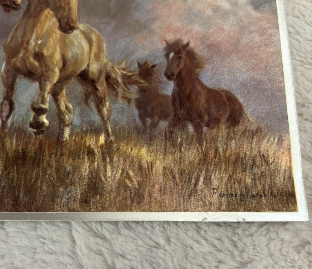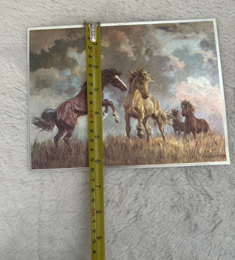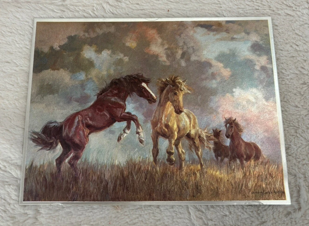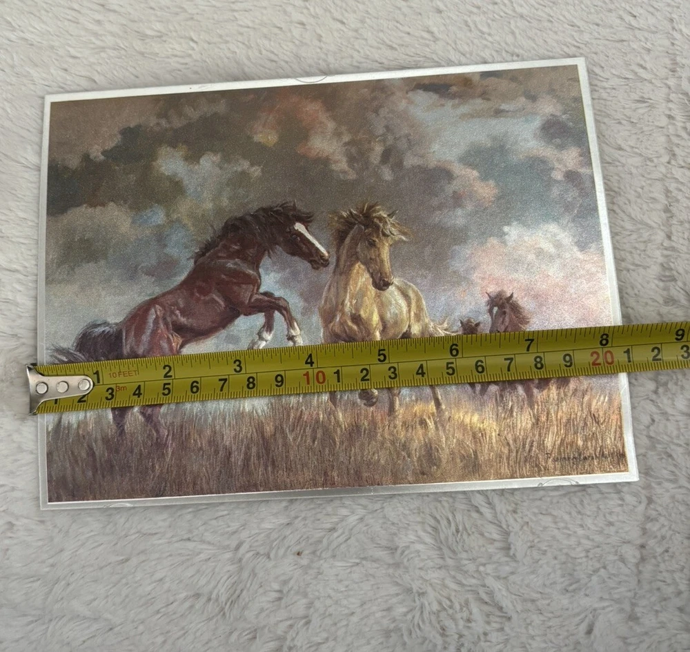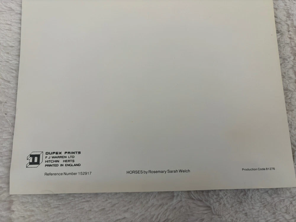 This stunning print by Rosemary Sarah Welch showcases the grace and beauty of equestrian life. The captivating image features a group of horses in a field, captured using the unique foil print technique. This piece is signed by the artist and is sure to add sophistication to any art collection. With its unframed design, this print allows for versatile display options to suit any decor. The theme of this artwork is centered around the world of horses and equestrian culture, making it a perfect addition to any collection with similar subject matter. Add this exquisite print to your collection today. See enclosed photos. From the matte there are a few marks on edge of print