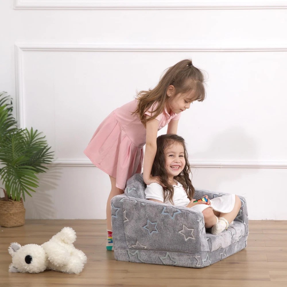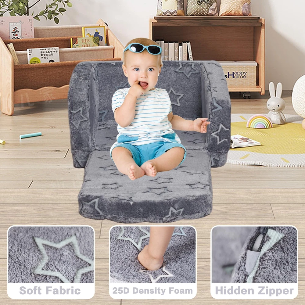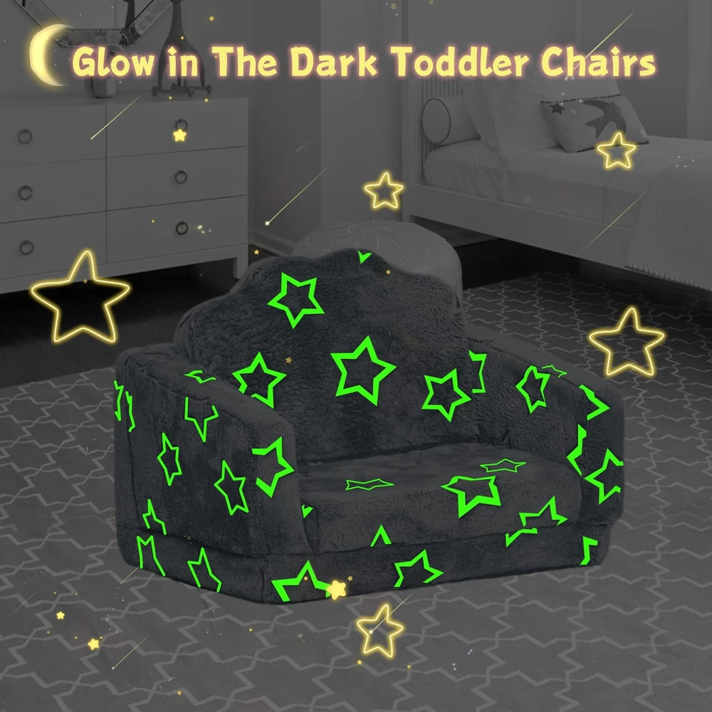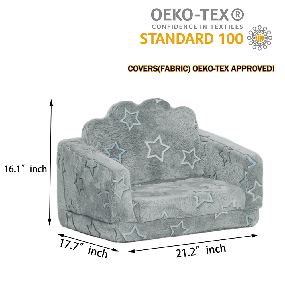 1 Glow in the Dark Kids Sofa: Expose the glow in the dark kids chair to sun or light for a while, turn off the lights at night kids will marvel at the amazing magic of the sofa's stars pattern radiating luminosity in the darkness Convertible 2 in 1 Design: Flipped Open kids sofa chair can simply converts to a lounger or sleeper. Ideal for reading, relaxing, playing or sleeping, your kids will enjoy this toddler sofa chair with siblings or friends. recommended age: 18+ months Soft Play Couch for kids: Kids chairs for toddler is soft and safe, suitable Toddler Bedroom Furniture. durable enough, and perfect for any playroom, bedroom, dorm room, or living room Easy to Clean: Kids Couch comes with a removable machine-washable slipcover that zips off for easy cleaning.Machine wash the washable kids couch cool outer cover separately and tumble dry low Total Dimensions: 21.2"L x 17.7"W x 16.1"H(As kids chair) or 41.3"L x 21.2"W x 16.1"H(Lounger size when flipped open: ). because teen sofa is packed in compression, after receiving the goods and opening the compression bag, the kids sofa needs to stand still for 48 hours before it can be restored to its original state