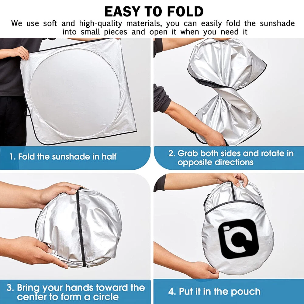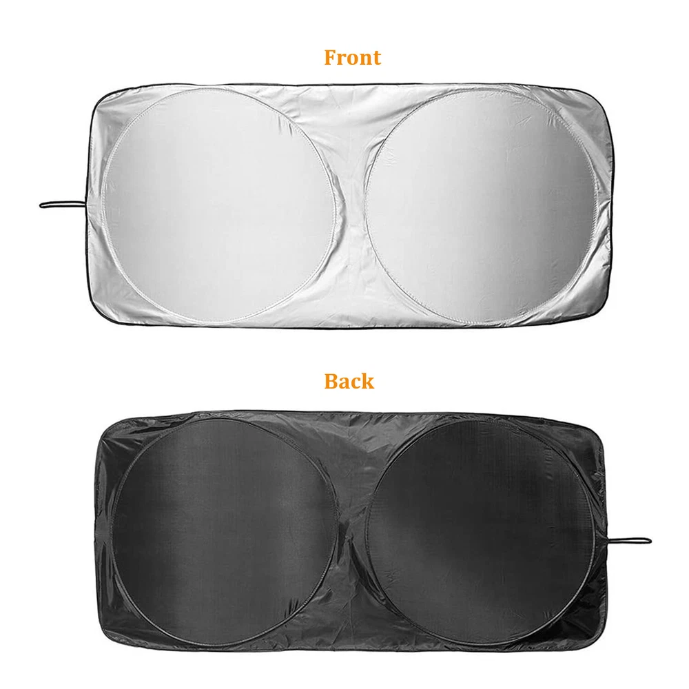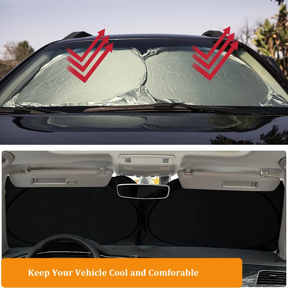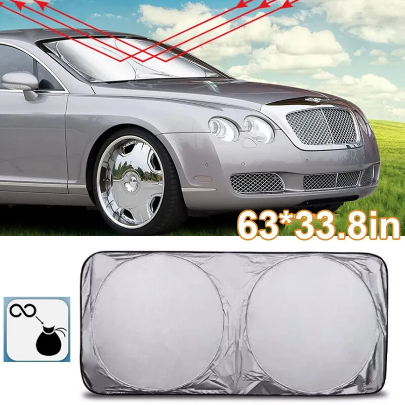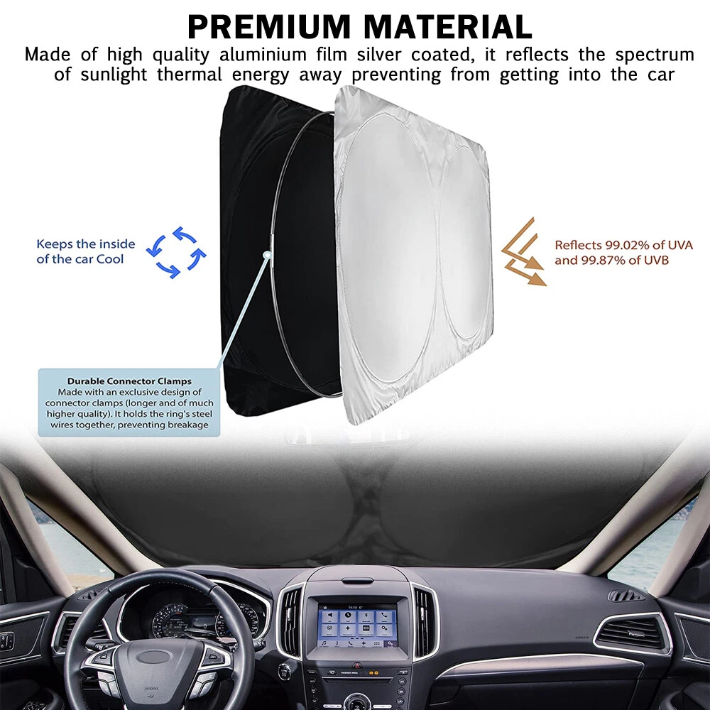 Premium quality. Shades your car windshield. Keeps car cooler by up to 50%. Customize Jumbo Size(63"X33.8") for SUV, truck, car. High quality car sunshades to keep your vehicle cool and damage free protects you. this high quality 170T silver coated nylon Oxford cloth car front window sunshade is a great helper for driver in summer and can effectively block sunlight, reduce the temperature inside of vehicle. Windshield Sunshade with Compact Design - The sun shield has been designed for hassle-free use. Put inside the car, make the sun visor fix it. Installs and folds in seconds. Keep your interior looking good, our sun shade protects your vehicle from UV damage. Helps protect vehicle's interior - Prevents cracking & fading to dashboard and plastic trim. Will fit all SUV's, Trucks, Vans, and Cars with windshields not exceeding 63 x 33.8 inches! It's easy & convenient to use, a retractable style that folds down into a sleek pouch. Very nice! Now you will be able to easily store your sun shade without any hassle! Sun shade is higher quality than most sunshades on the market. We guarantee this sunshade can make you feeling refreshed with a cooler vehicle, and keeping a pristine interior. If you are caught in some problems when using our products, welcome to contact us at any time. Great accessory for your vehicle! Specifications: Suitable for : Front Rear Windshield Material : Nylon, Metal Color : Black, Silver Tone! Flat Size : 160 x 86cm / 63" x 33.8" (L*W)