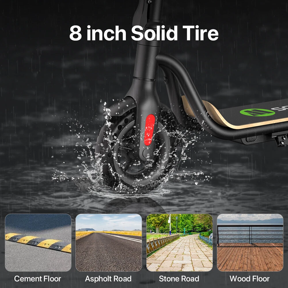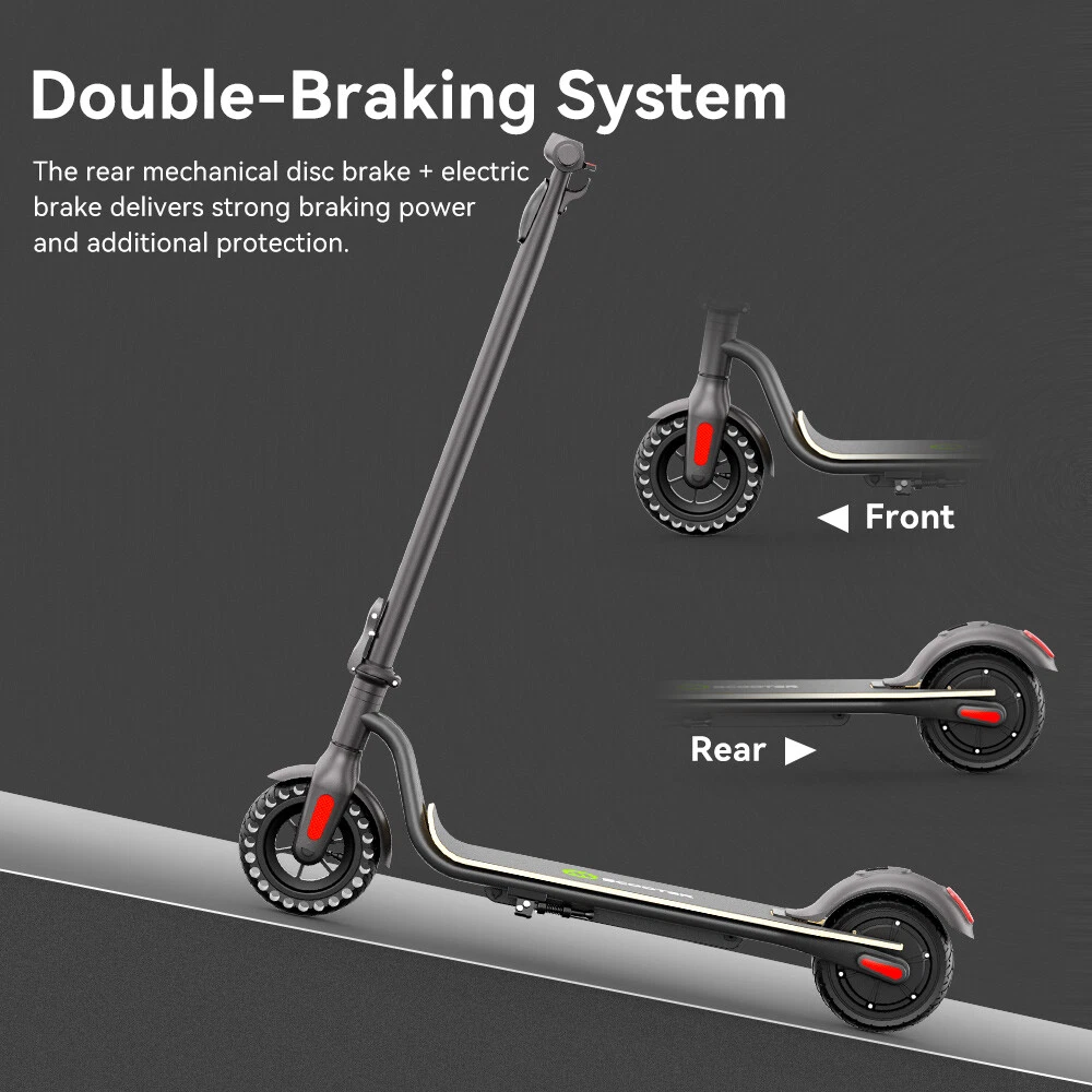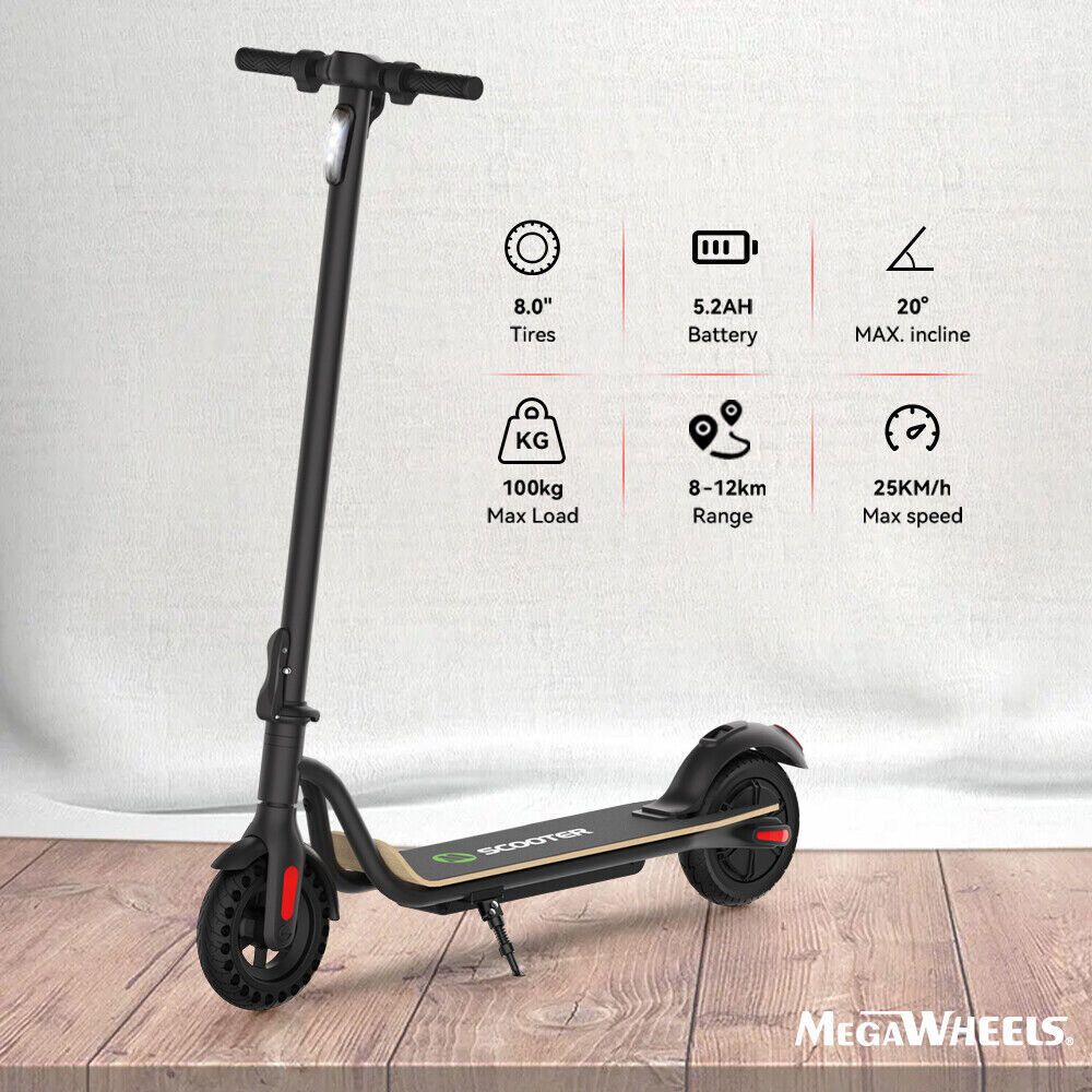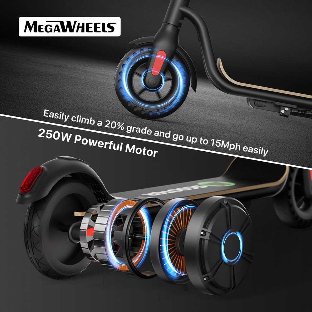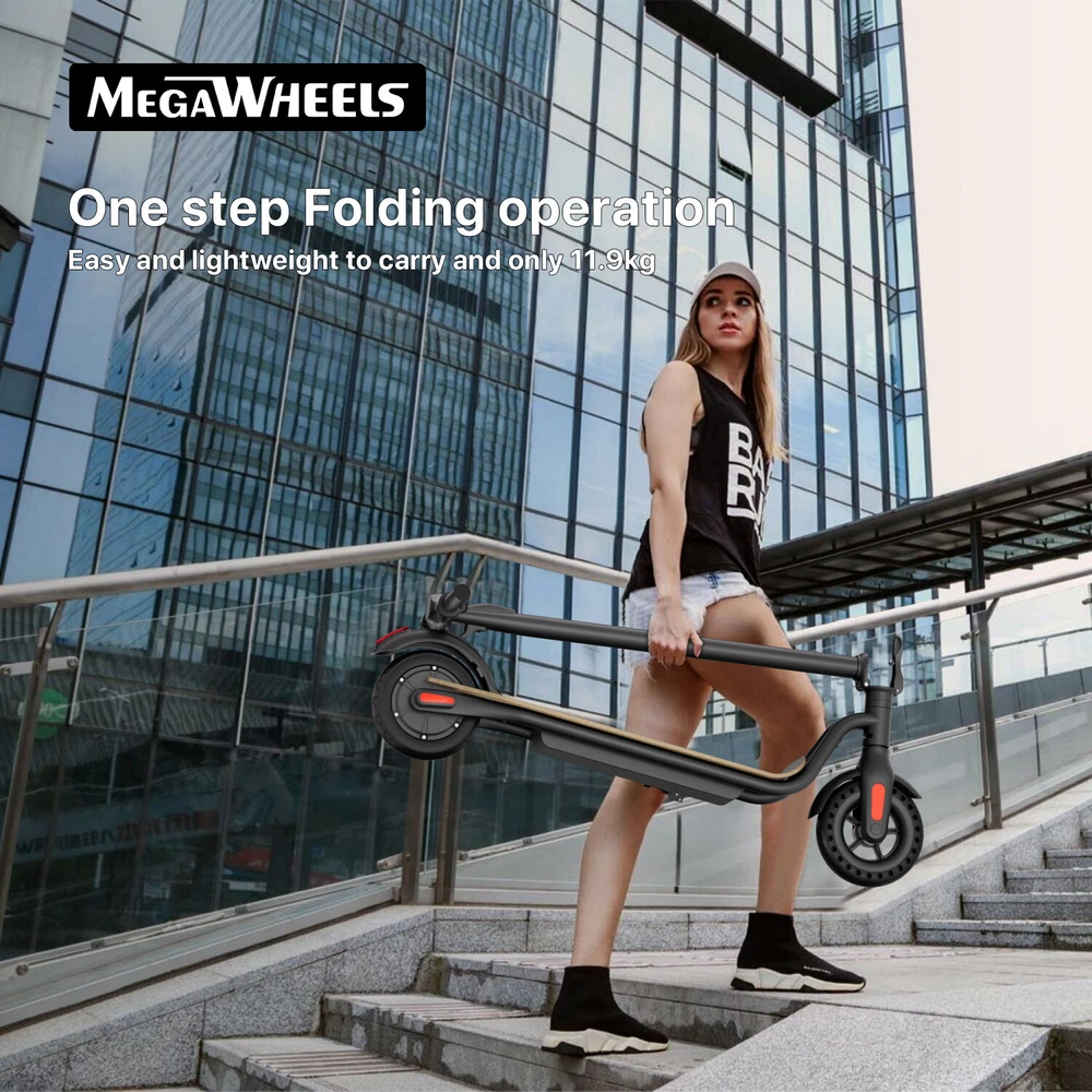 Main features: LONG RANGE BATTERY LIFE - Powerful 250W motor and 5.2 Ah/36V lithium battery pack that supports a speed of up to 15 Mph with a range up to 7 Miles. Updated large-capacity battery life, designed for commuters and longer distances. 8.0" HONEYCOMB & SOLID TIRES - Shock-absorbing rubber tires offer a smooth ride even over bumpy surfaces. PORTABLE FOLDING DESIGN - Electric scooter can be folded easily in 3 seconds with quick folding latch for easy carrying and storage. BATTERY INDICATOR AND LIGHTS - Battery indicator keeps to track battery life. Ultra bright LED headlight and taillight. Fast recharging about 4 hours. GEAR SHIFT SETTING - 1st gear for a 7 Mph comfortable ride or 3rd gear to get the 15 Mph fast experience. Extremely fun to ride and end boring commutes. Specification: Brand: Megawheels Model: S10 Dimension: Unfolding 105 x 43 x 118 cm; Folding: 105 x 43 x 48 cm Net Weight: 11.9kg Color: Black Frame Material: Aluminium Tires: 8.0" Honeycomb Front Tire & Solid Rear Tire Max Load: 100kg Max speed: 25KM/h Speed level: Gear 1--Max 10km/h ; Gear 2--Max 20km/h; Gear 3--Max 25km/h Mileage: 8-12km Grade Ability: 20 degree slope Working Temperature: -15°C-50°C Storage Temperature: -20°C-25°C Mode Type of Motor: Brushless hub motor Battery Type: High quality lithium battery Battery Capacitiy: 5.2 Ah Battery Voltage: 36V Charger Input Voltage: 100V-240V Charger Frequent: 50Hz/60Hz Charging time: 4 hours Package Contents: 1 * Folding Electric Scooter 1 * Battery Charger 1 * User's Manual NOTE:The appearance of the product you receive may vary slightly from the image shown due to differing production batches! Riding Skills: -Put your foot in the front of the scooter and the other foot on the floor before riding. -Make sure that the riding route is smooth. -Slide forward with the food standing on the floor before starting (like riding the scooter without power). -Immediately press the acceleration button and lean forward to avoid falling over backward due to inertia, so that the electric scooter will enter the working status. -Avoid pressing the handle with your body in the acceleration and deceleration process. Put one foot ahead and the other behind (like on the sliding plate/surfboard, put one foot ahead and the other behind by 70-90 for better comfort). -Turning – The turning principle of the electric scooter is the same with that of surfboard/sliding plate/skis. The handle shall be balanced with the body. Observe and make sure that turning is safe before turning. Tips: Before riding the scooter, please put one foot on the scooter deck and the other foot on floor and push the scooter forward by kicking the floor for some distance, in this way, the scooter will get some impulse to run forward. Note: This products have been certified under UL2272 safety standards. On Feb 27, 2025 at 11:04:38 PST, seller added the following information: