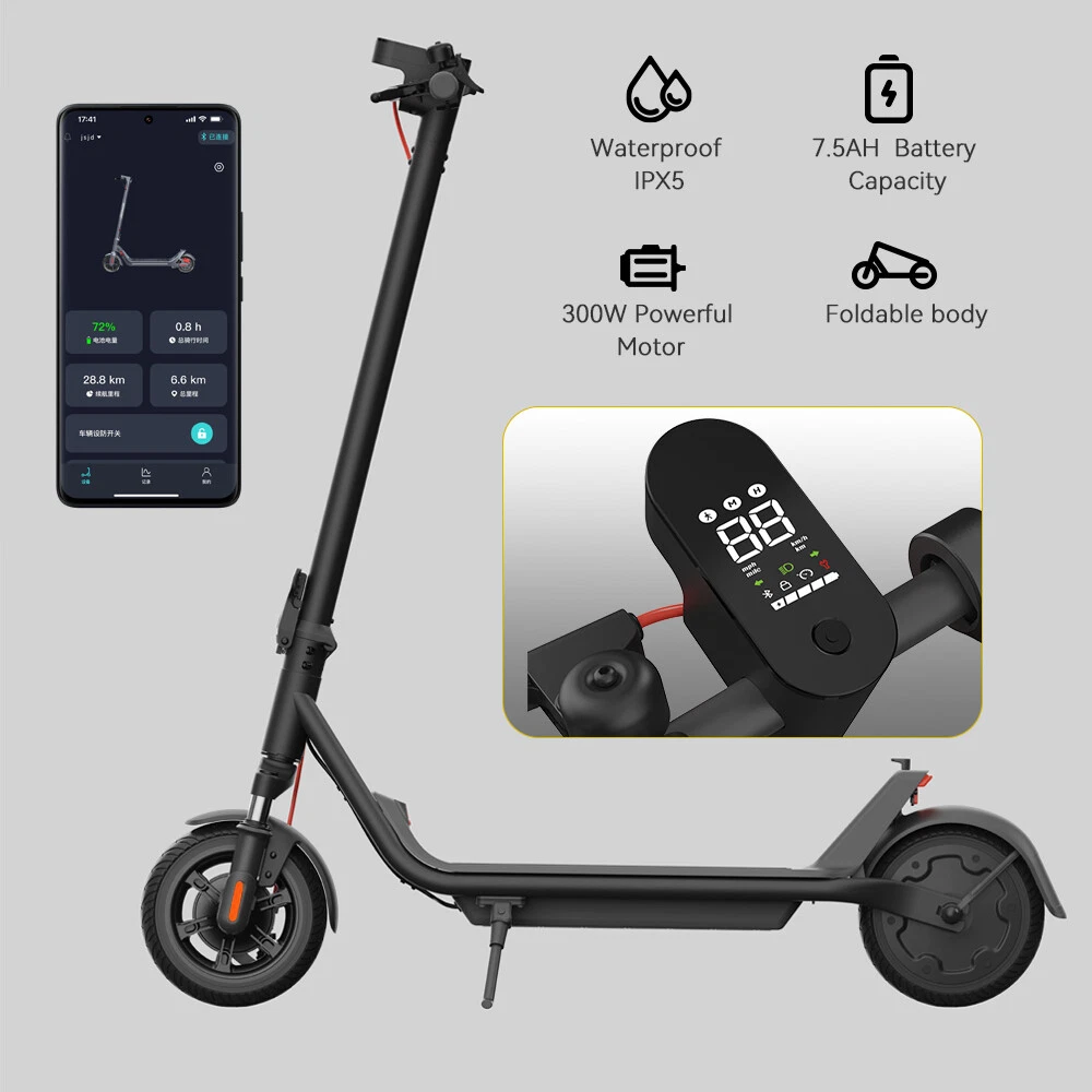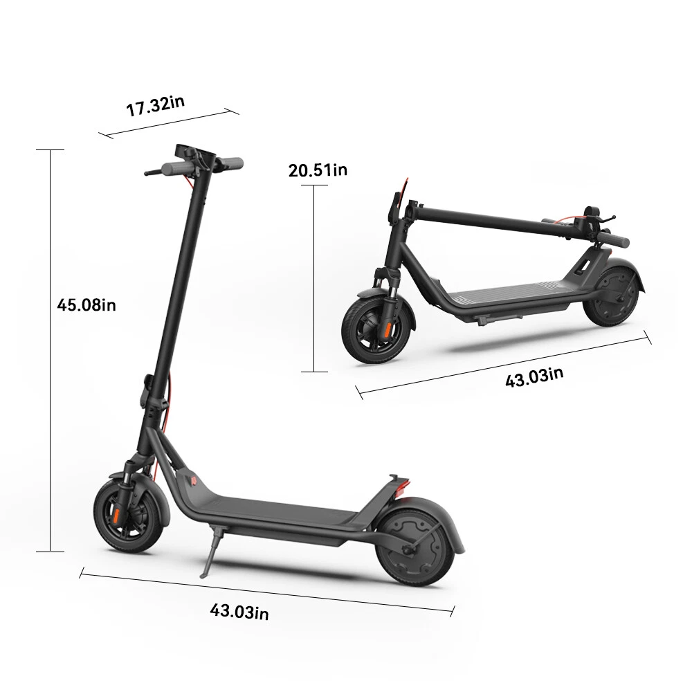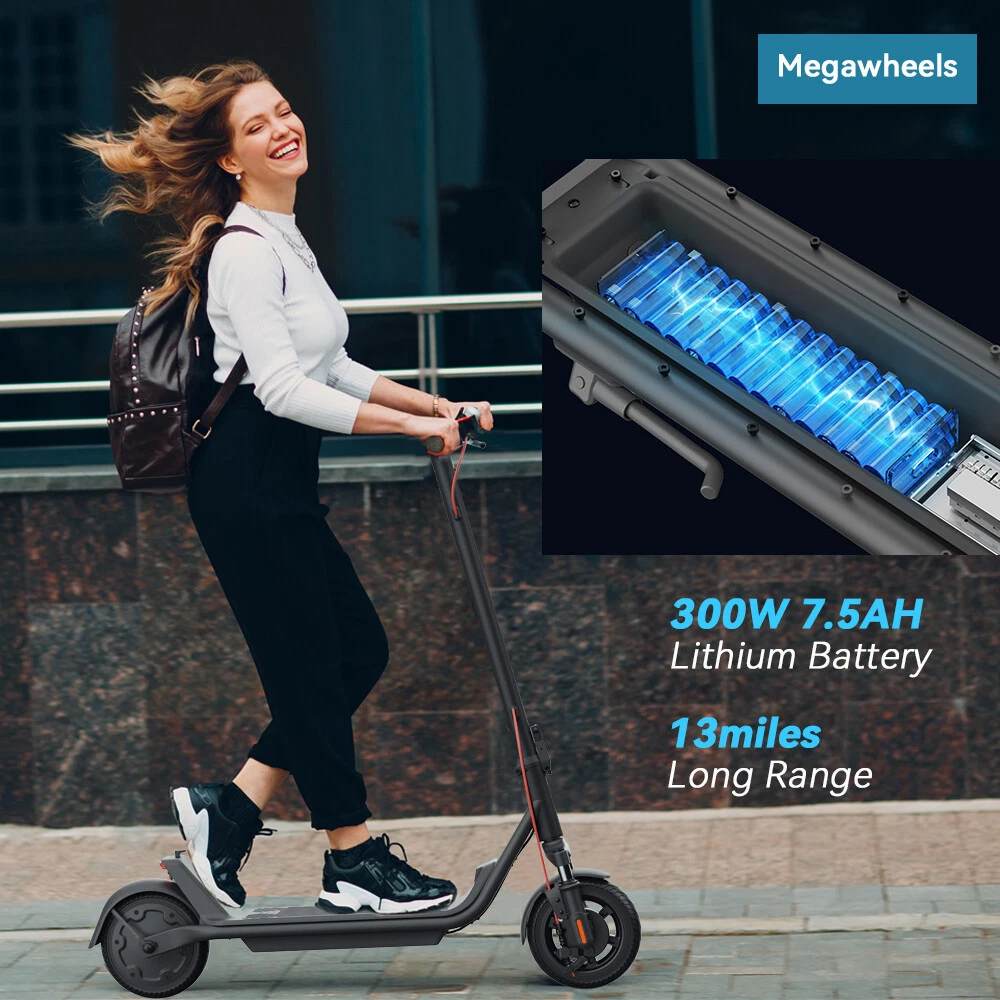 Features: Powerful Motor & Long Battery Life: The electric scooter is equipped with a peak 300W motor. The high-powered motor can easily navigate 10% slopes and is equipped with a 164Wh high-capacity lithium battery with a range of 13 miles, making it ideal for short-distance commuting and trips Safe & Comfortable Riding: This electric scooter adults is equipped with Electronic Brake and Drum Brake. Bright headlight and bell ensure safe riding at night.To ride safely, the electric scooter is equipped with a non-zero start function to ensure safe starting 3 Speed Modes & LED Digital Display: In order to meet the different needs of use from teens to adults, the electric scooter is equipped with 3 speed gears: low speed (3 mph), medium speed (9 mph) and high speed (15 mph). Riders can see real-time speed, speed mode, battery life and light icon with LED display Lightweight & Foldable Design: The adult electric scooter is equipped with one step folding system, and the weight of the electric scooter is only 32.85lbs, which is convenient for you to carry it up and down stairs or into the subway station. Also, it can be placed in the trunk of the car or any compact space. The folded size is 43.03"x17.32"x20.51" SMART APP CONTROL: Lets you lock and unlock these folding electric scooters for adults and monitor their riding status using the Tuya app. Enhanced Safety Features: Safety is a top priority with the A1C electric scooter. It comes with ultra-bright headlights, taillights, and a bell to enhance visibility and alert others to your presence, especially during nighttime rides. The scooter also features sensitive Electronic Brake and Drum Brake, providing reliable stopping power and reducing the risk of accidents. It is UL 2272 Certified. Warm Tips - The speed and range of electric scooters vary depending on weight, surface, temperature, battery and riding style. If you have any questions, please contact us Specification: Brand: Megawheels Model: A1C Dimension: Unfolding 43.03×17.32×45.08 in; Folding: 43.03×17.32×20.51 in Net Weight: 32.85lb Color: Black Tires: 8.5" Front & Rear Solid Tire Max Load: 100kg Max speed: approx.25KM/h Speed level: Gear 1--Max 3 MPH ; Gear 2--Max 9 MPH; Gear 3--Max 15 MPH Mileage: Approx. 13 miles Grade Ability: 10% Working Temperature: -10°C to 45 °C Storage Temperature: -20°C to 25°C Battery Capacitiy: 7.5 Ah Rated Power: 300W Charger Input Voltage: 100V-240V Charger Frequent: 50Hz/60Hz Charging time: approx. 5.5 hours Package : 1 * Electric Scooter 1 * Battery Charger 1 * User's Manual Note: This products have been certified under UL2272 safety standards. On Feb 26, 2025 at 18:48:53 PST, seller added the following information: