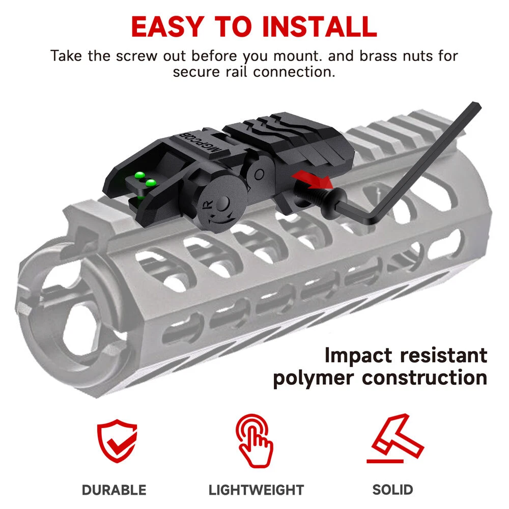 Product Description Features: -Full Fiber Optics Sights With Visible Green & Red Dot, provide the brightest aiming in dark conditions -Elevation is adjustable on the front sight and windage is adjustable on rear sights -Proprietary deployment system ensures sight stays up securely & remains zeroed in combat situations -Visible Front Red Fiber Sights and Rear Green Fiber Sights provide the brightest aiming points. -Thumb slide flip-up mechanism, sliding the spring load push button to flip-up simply. -Spring-loaded flip up sight is easily activated by pulling the back cover, simply press down to fold. -Compatible with most 20mm Picatinny/Weaver rails. -Not suitable for railed gas blocks. -Impact resistant polymer construction provides lightweight and durable. - Material:Resistant High-density polymer Note: Please take the screw out before you mount, once it is removed they slide on and off easily! Package includes: 1 × Front Sight 1 × Rear Sight Terms For any issues with Defects, Return, Item Exchange request, please contact us first and send us a message first before opening any type of case or request. We devote ourselves making EVERY CUSTOMER in 100% Satisfactory and resolve any problem. We highly value and appreciate your business. Thank you. No returns will be accepted without an RMA number. Please contact us for the RMA number. Return for replacement or money back is optional. Returned items must be in the brand new, unaltered and resalable condition. Seller is not responsible for any labor cost, expense in a dealer store, or damage due to wrong installation.