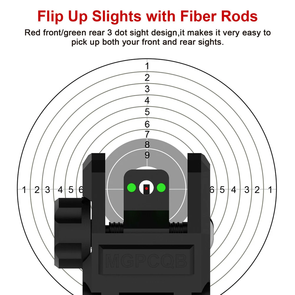Product Description Features: -Full Fiber Optics Sights With Visible Green & Red Dot, provide the brightest aiming in dark conditions -Elevation is adjustable on the front sight and windage is adjustable on rear sights -Proprietary deployment system ensures sight stays up securely & remains zeroed in combat situations -Visible Front Red Fiber Sights and Rear Green Fiber Sights provide the brightest aiming points. -Thumb slide flip-up mechanism, sliding the spring load push button to flip-up simply. -Spring-loaded flip up sight is easily activated by pulling the back cover, simply press down to fold. -Compatible with most 20mm Picatinny/Weaver rails. -Not suitable for railed gas blocks. -Impact resistant polymer construction provides lightweight and durable. - Material:Resistant High-density polymer Note: Please take the screw out before you mount, once it is removed they slide on and off easily! Package includes: 1 × Front Sight 1 × Rear Sight Terms For any issues with Defects, Return, Item Exchange request, please contact us first and send us a message first before opening any type of case or request. We devote ourselves making EVERY CUSTOMER in 100% Satisfactory and resolve any problem. We highly value and appreciate your business. Thank you. No returns will be accepted without an RMA number. Please contact us for the RMA number. Return for replacement or money back is optional. Returned items must be in the brand new, unaltered and resalable condition. Seller is not responsible for any labor cost, expense in a dealer store, or damage due to wrong installation.