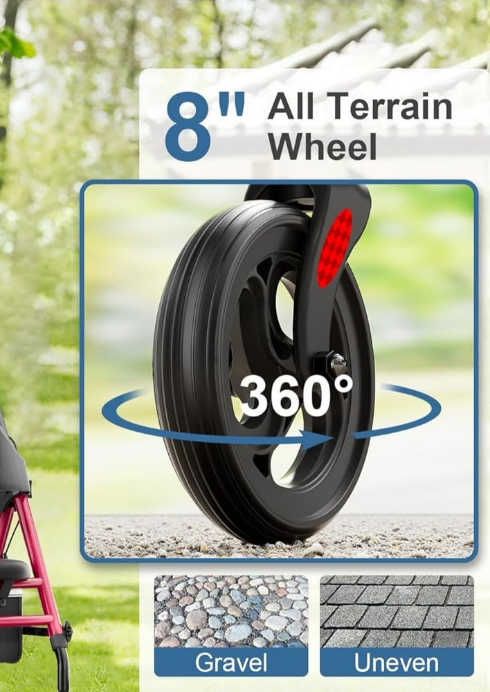 About this item DURABILITY MEETS DESIGN: Our 4 wheel rollator is engineered with a reinforced frame and double support bars, supporting up to 350 pounds. With thickened tubing and robust wall construction, it guarantees durability and stability for every step. IMPROVED COMFORT: Adjustable seat and handle heights accommodate users from 4'7" to 6'6". Enjoy a breathable backrest and an extra-wide memory foam seat that prioritizes comfort and safety, making every outing a pleasure. COMPREHENSIVE SAFETY: 1. Reliable Braking System, features three modes (free, deceleration, stop) for ultimate control. 2. Pinch-Proof Folding Point Design, fully enclosed folding points prevent pinching. 3. Ergonomic Hand Grips, soft grips reduce hand fatigue, allowing easy use by individuals with limited strength. 4. Multi-Reflective Strips, enhance visibility during nighttime use. EFFORTLESS MOBILITY: Glide over any terrain with our 8-inch puncture-proof wheels, expertly crafted for smooth movement indoors and out. Whether strolling through the park or navigating your home, this rollator makes mobility easy and enjoyable. FOLDABLE & CONVENIENT: At just 20.4 pounds, this 4 wheel walker combines strength with portability. Its quick-fold design allows for easy transport and storage, fitting perfectly into your lifestyle.
