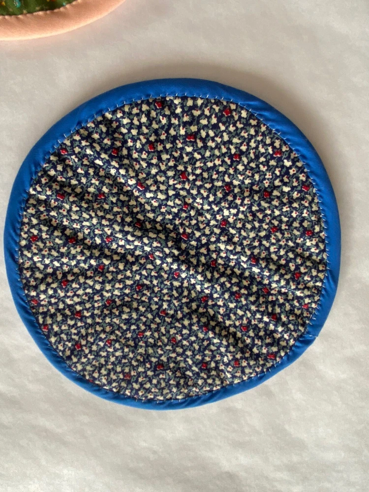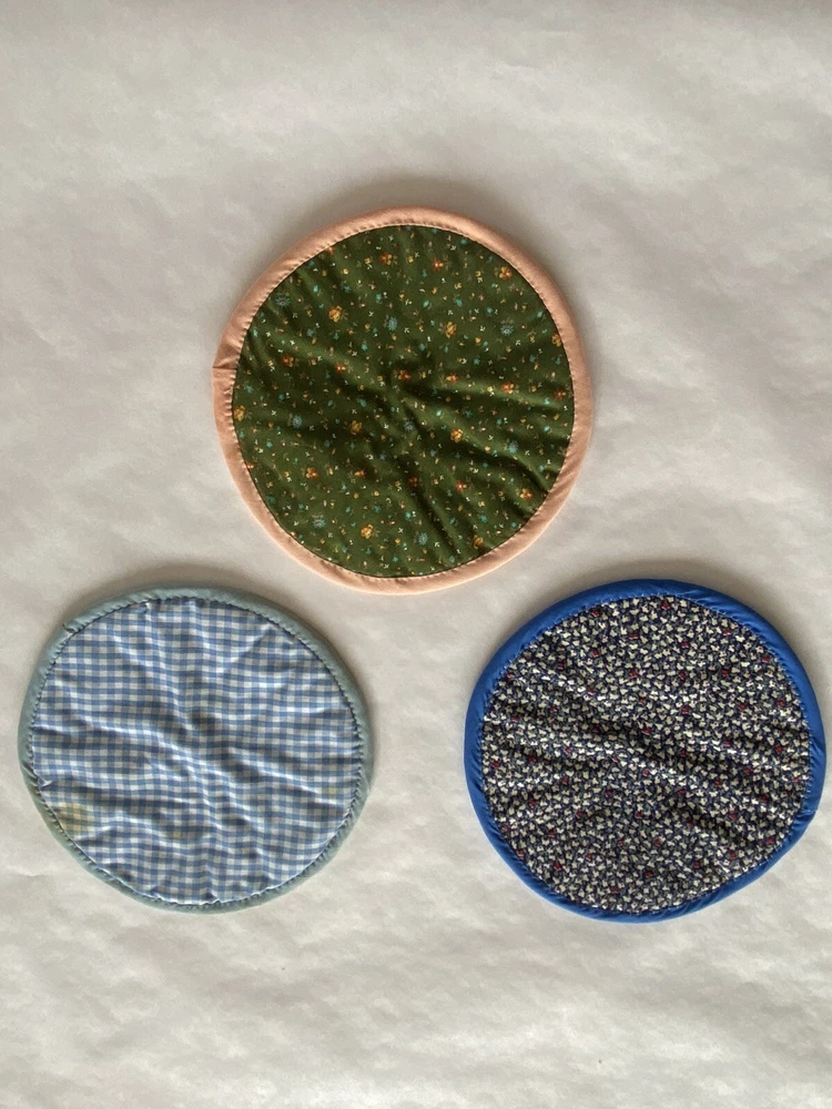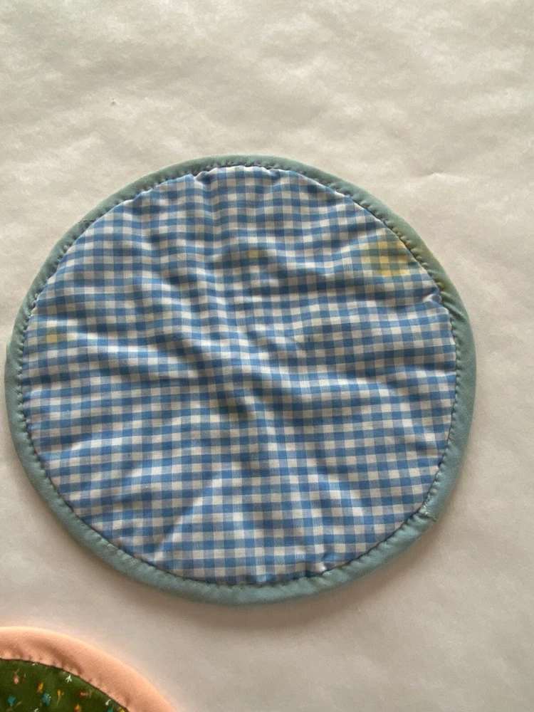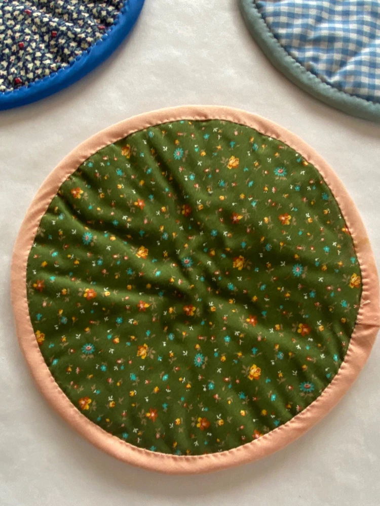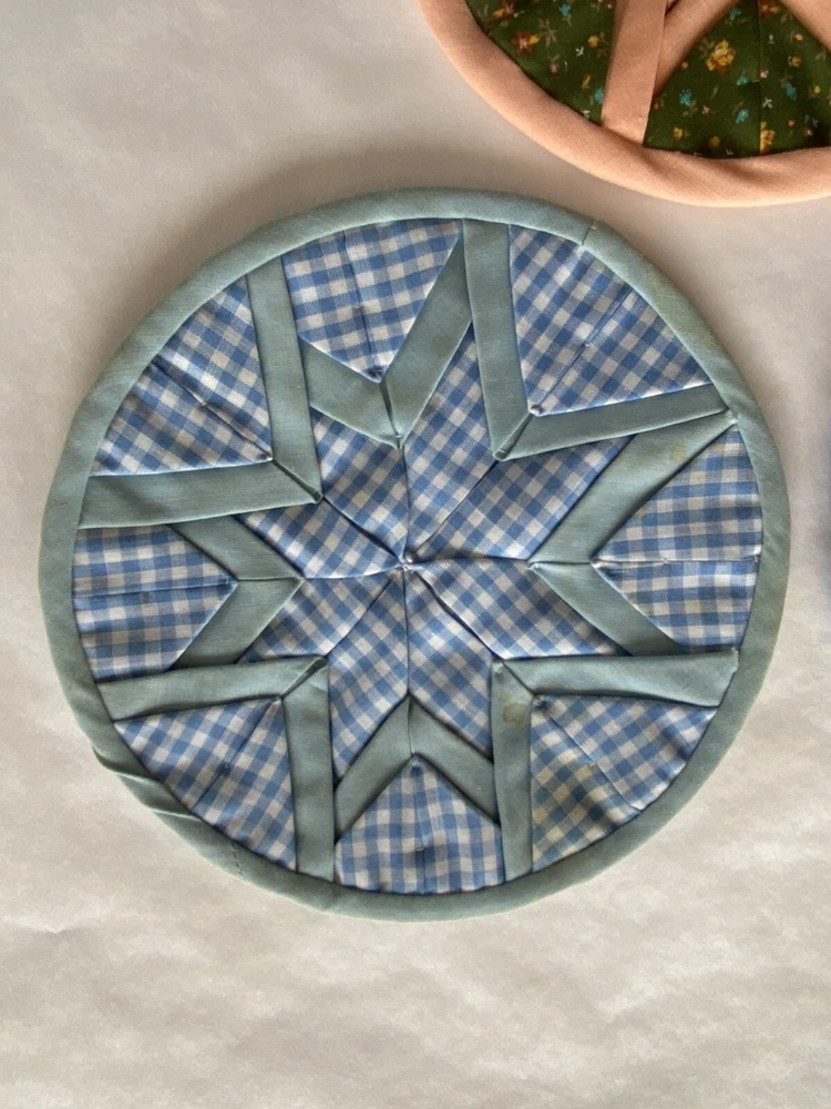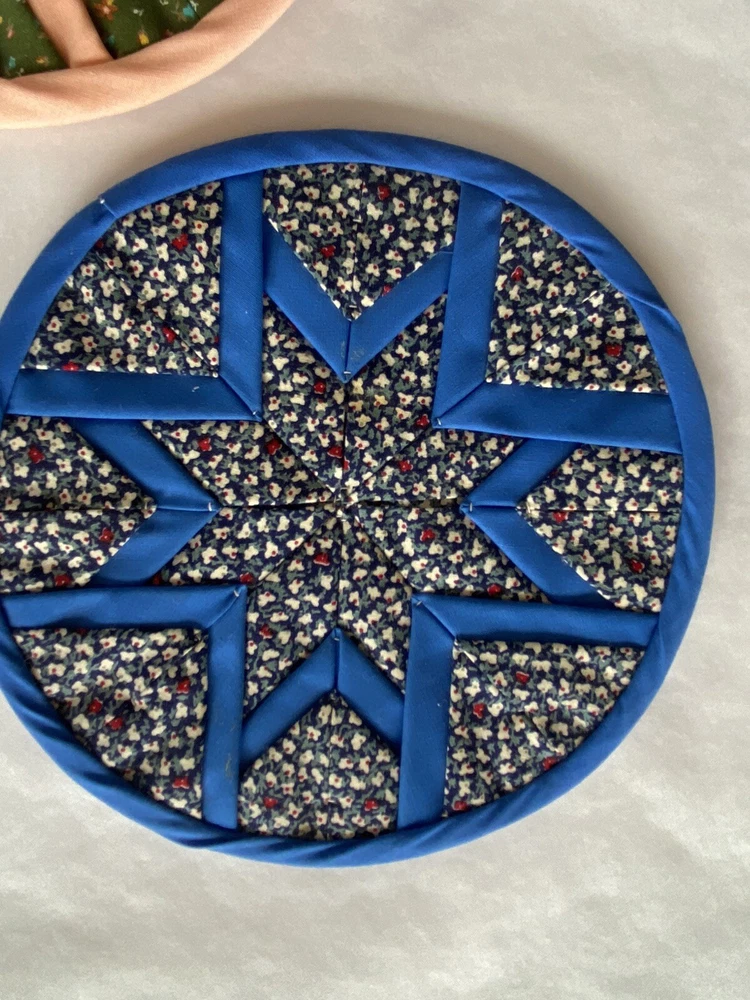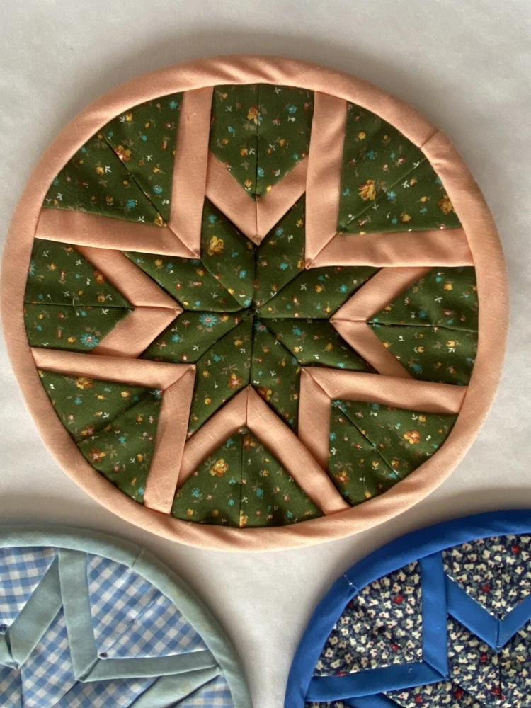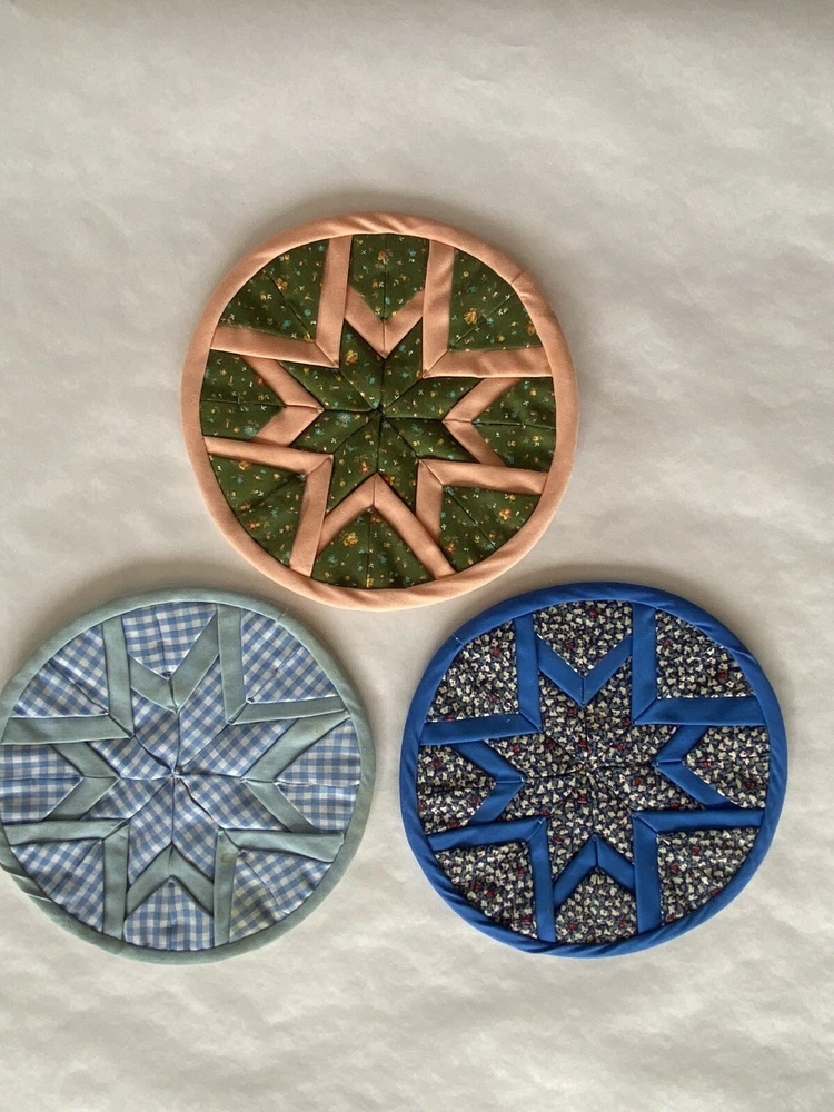Folded Star Quilted Trivet/Potholders Set Of 3 Reversible Handmade *See photos close up for stains visible on light blue potholder*