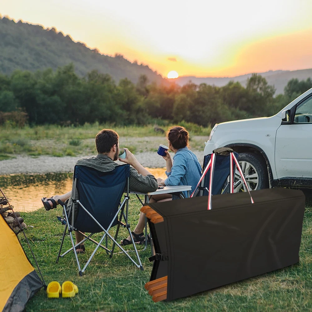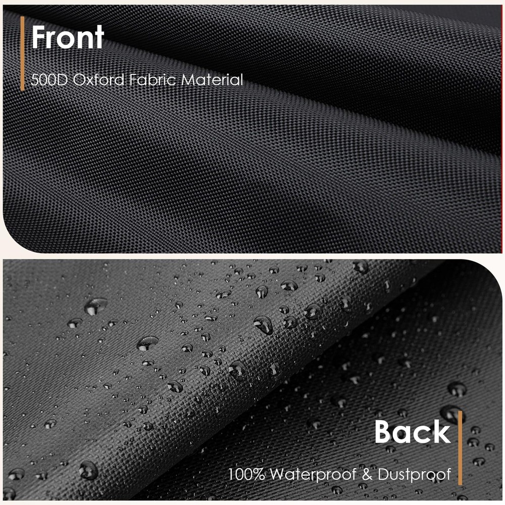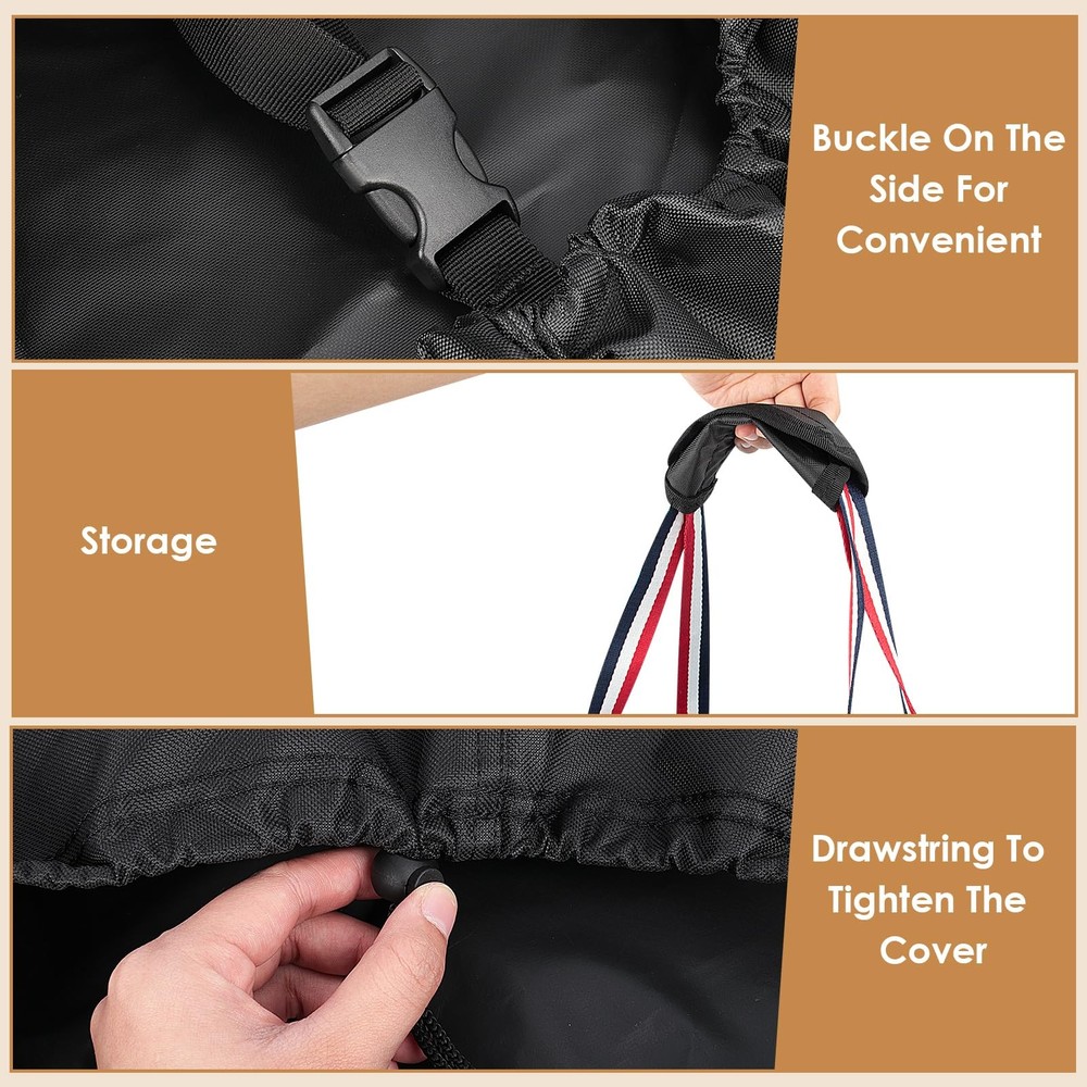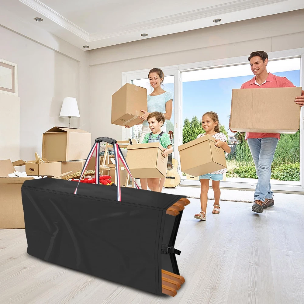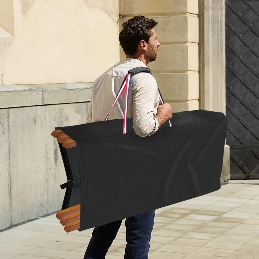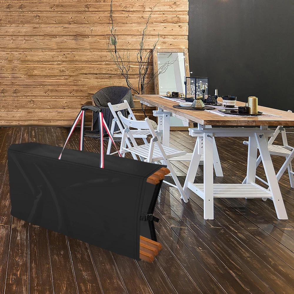 Folding Chair Storage Bag - Your Ultimate Chair Storage Solution Color:Black with Blue White Red Handles Size:39"L x 12"W x 20"H Features: 1.Crafted from high-quality, durable 500D Oxford cloth , our Folding Chair Storage Bag is built to last. The strong, water-resistant fabric ensures that your chairs remain protected from dust, dirt, and moisture, while the reinforced handles provide a secure and comfortable grip for easy carrying. 2.The bag's spacious interior can accommodate multiple folding chairs, making it ideal for storing and transporting chairs for parties, events, or daily use. The bag's compact design also allows it to be easily stored away when not in use, saving valuable space in your home or office. 3.Whether you're looking to protect your chairs from the elements or simply want an easy way to store and transport them, our Folding Chair Storage Bag is the perfect choice. Order yours today and experience the convenience and practicality of this must-have storage solution! Premium Material - Crafted from high-density, water-resistant oxford fabric enhanced with silver undercoating, our Folding Chairs Storage Bags offer superb resistance to dust, water, and UV rays, keeping your chairs pristine Universal Fit - Measuring 39"L x 12"W x 20"H, our bags are compatible with a wide range of standard folding chairs, including plastic, resin, metal-frame steel, and wood varieties, ensuring seamless storage and transportation Robust Handles - Designed for portability, our folding chair covers feature reinforced handles that allow for effortless carrying. Each bag can accommodate up to 4 chairs. (Note: Handles have a limited load-bearing capacity. Heavier items may stress the seams.) Convenient Usage - Our upright, stationary oxford cloth chair covers feature a handle on one side for quick fastening and storage. A buckle at the bottom seam ensures a secure fit, making it easy to transport and store 4 folding chairs Effortless Maintenance & Storage - Each package includes 1 Folding Chairs Cover and 1 Storage Bag. Clean with a damp cloth and let it dry in the sun for future use. The included storage bag facilitates convenient storage