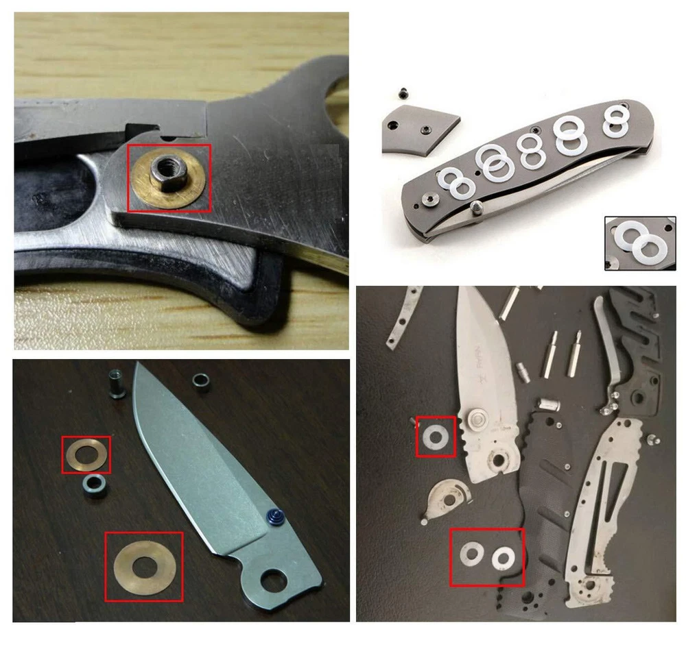 Folding Knife Pivot pin Flat washers,Pocket Knives Stud Pin Washer Bearing Shim These washers are made for brass or teflon for knives pivot pin,provides a low-friction surface and offers resistance to corrosion and most chemicals. Washers distribute the load of a fastener across a surface and can also be used as spacers, shims, or locking devices,They break in nicely and make for a smooth opening knife Just physically compare your tolerance knife lock bar stabilizer against another brand or model to see if it fits before purchasing, In order to lubricate more, you can apply oil before using,clean up dirt regularly You can get 20 pieces Note: The knives pictured are not included,No knives pictured are for sale, they are only there to show what it will look like on certain models. The flat washer provides a bearing surface for fastener load distribution or is used as a spacer between components These washers are made for brass or teflon for knives pivot pin,provides a low-friction surface and offers resistance to corrosion and most chemicals. Washers distribute the load of a fastener across a surface and can also be used as spacers, shims, or locking devices,They break in nicely and make for a smooth opening knife Just physically compare your tolerance knife lock bar stabilizer against another brand or model to see if it fits before purchasing, In order to lubricate more, you can apply oil before using,clean up dirt regularly The measurements are 0.2mm thickness, 8mm outside diameter, 4.2mm Inside diameter. You can get 20 pieces