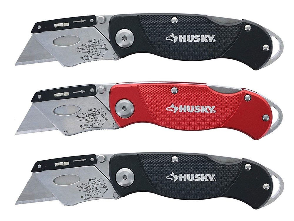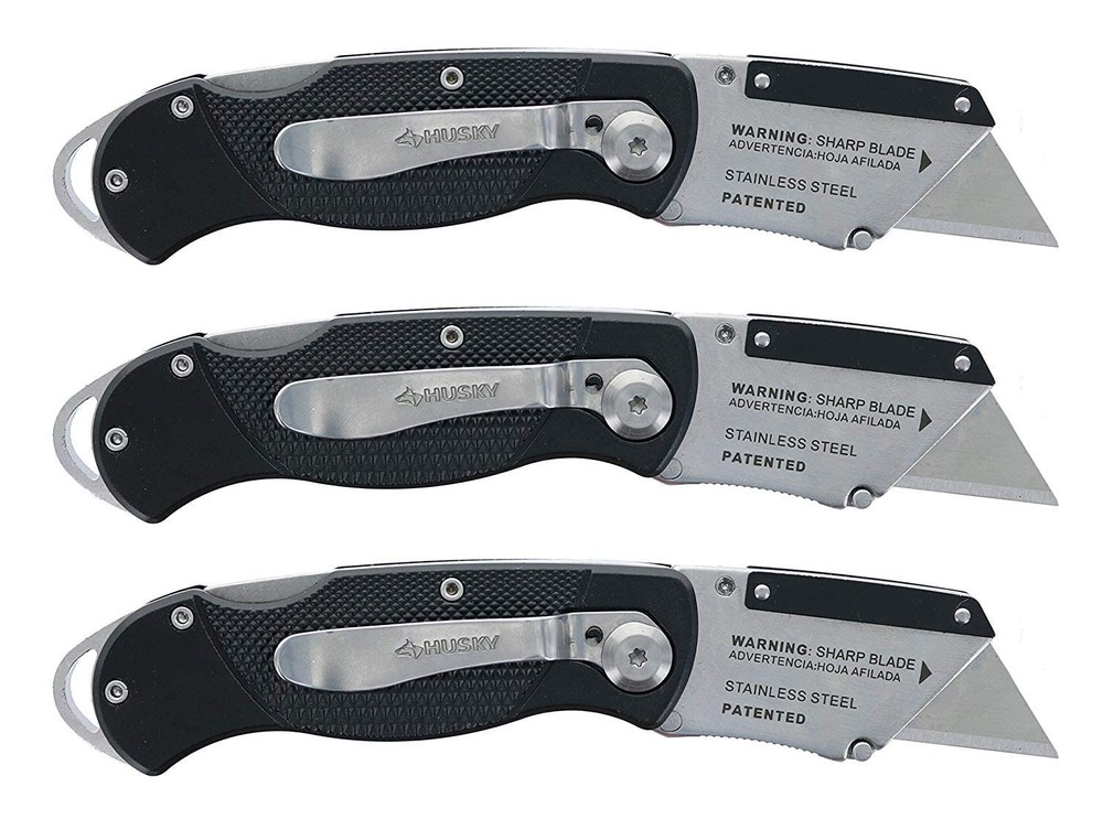 The Folding Lock-Back Utility Knife (3-Pack) includes 3 knives and 3 utility blades. This knife features a quick change blade mechanism that locks a standard utility blade in place for safety and efficient cutting. The handle is made of lightweight, durable aluminum for strength and features a convenient folding design. These knives are great for use at home, on the job or outdoors.